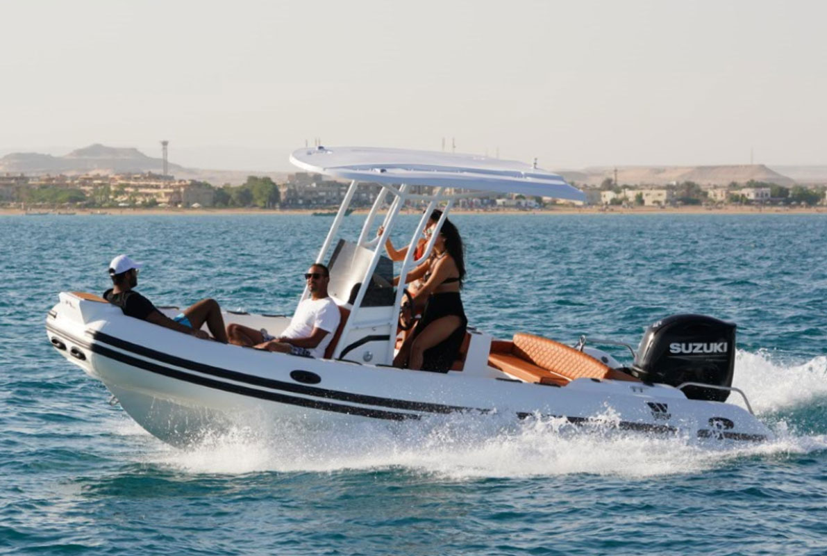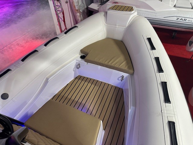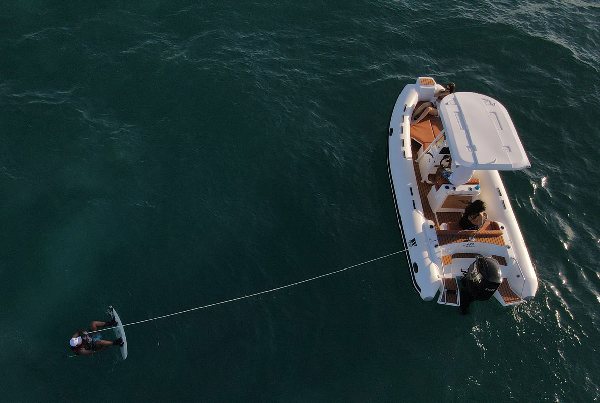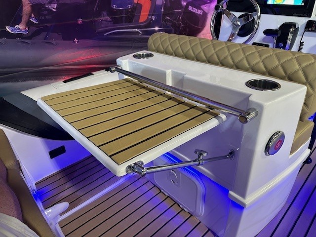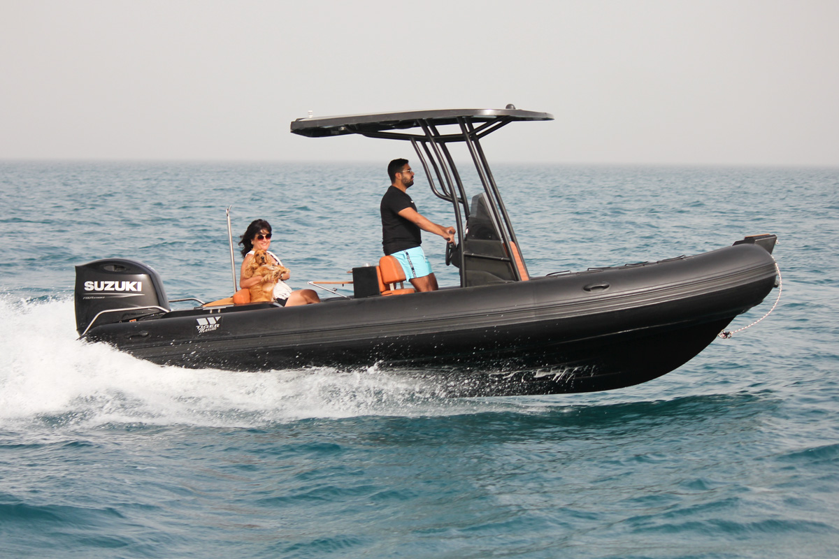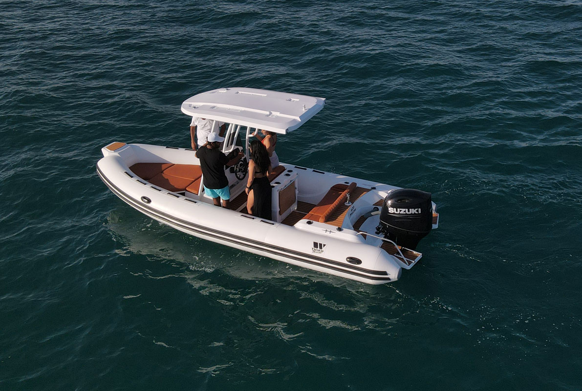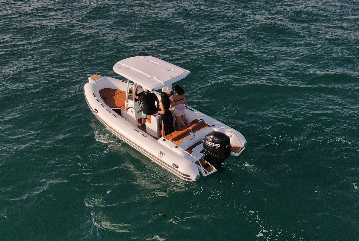 The Tiger Marine 620 PL is stocked with hypalon tube. SeaDeck faux teak, Silvertex cushion set, ski-pole, Nav lights, Bilge Pump, Battery system with cutoff switch, Fiberglass T-top with aluminum frame. SS rod holders. SS cup holders, swim platforms with SS hadrails, sundeck, LED deck lights.