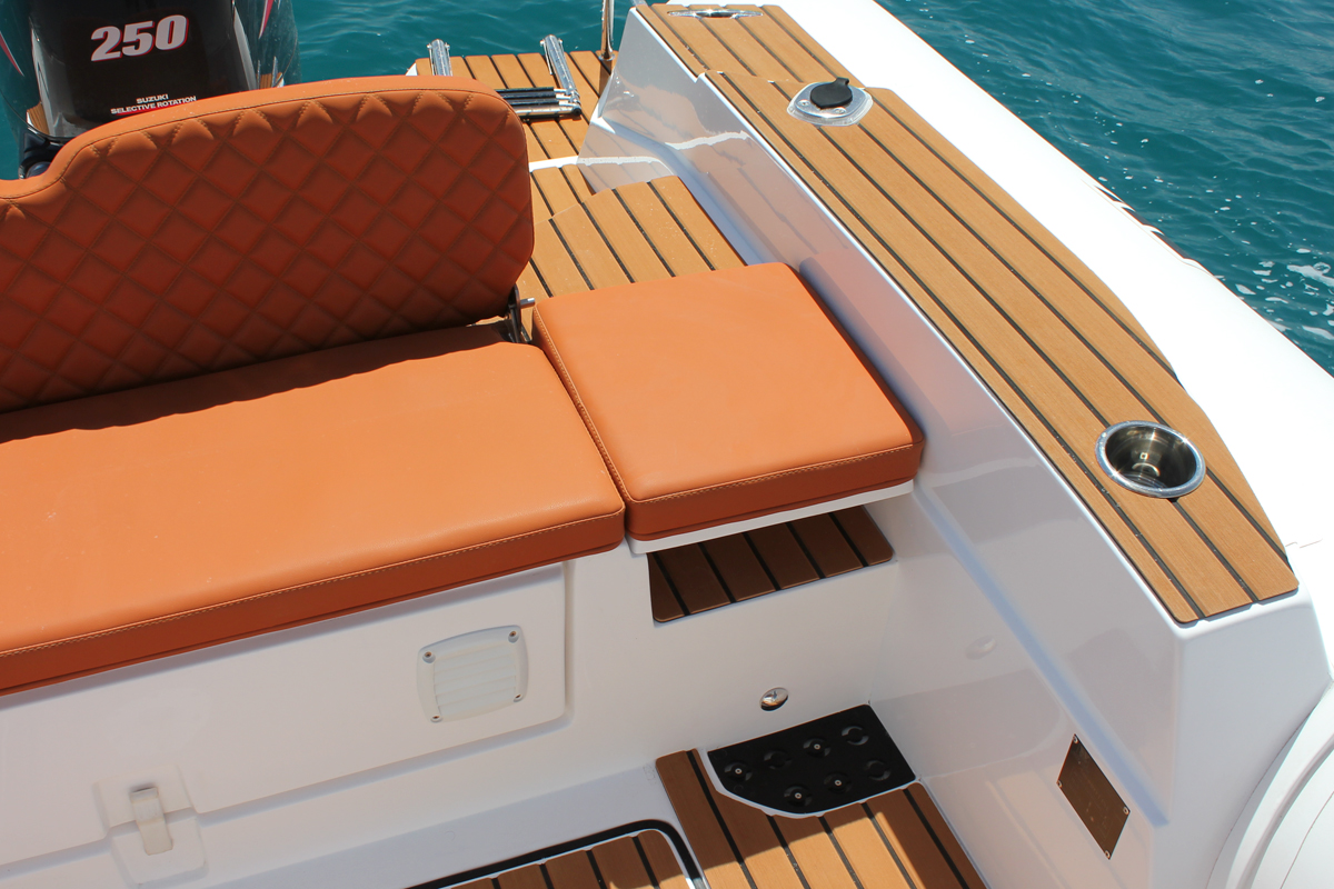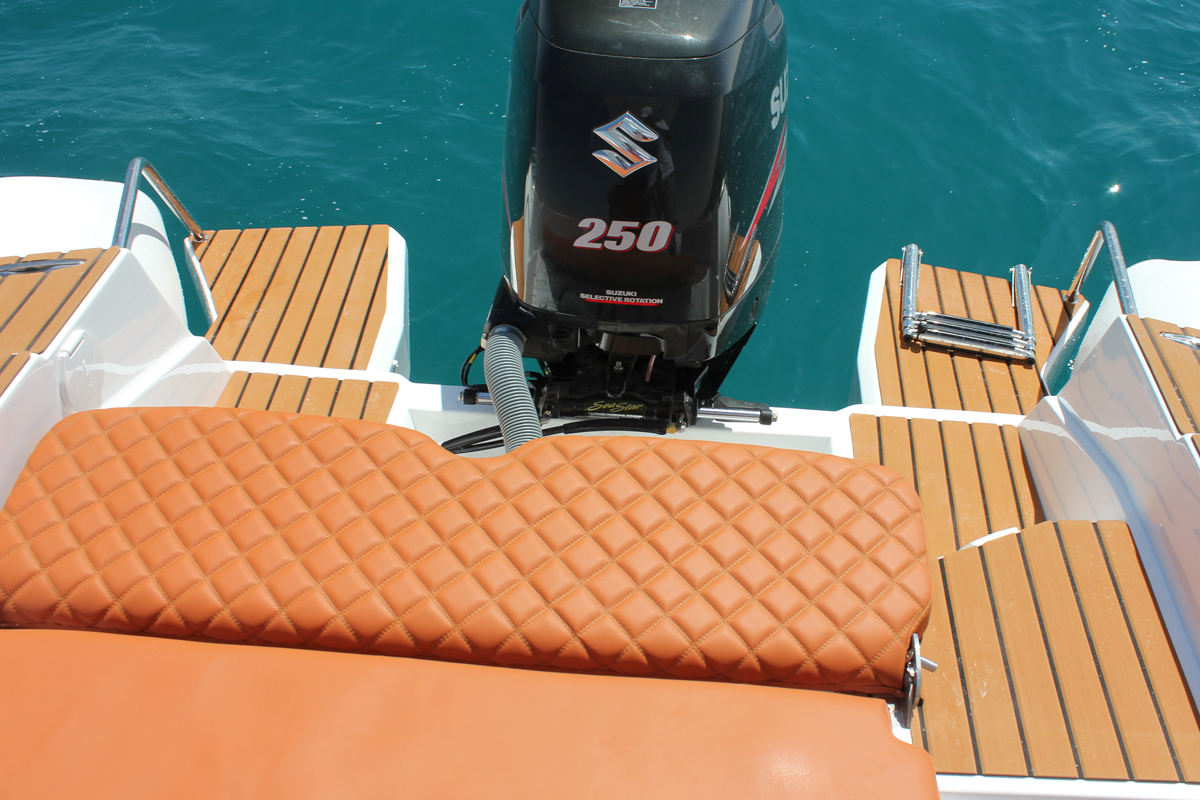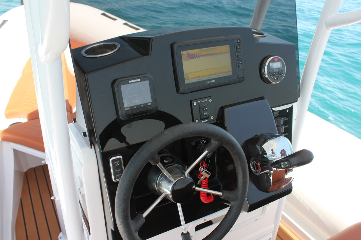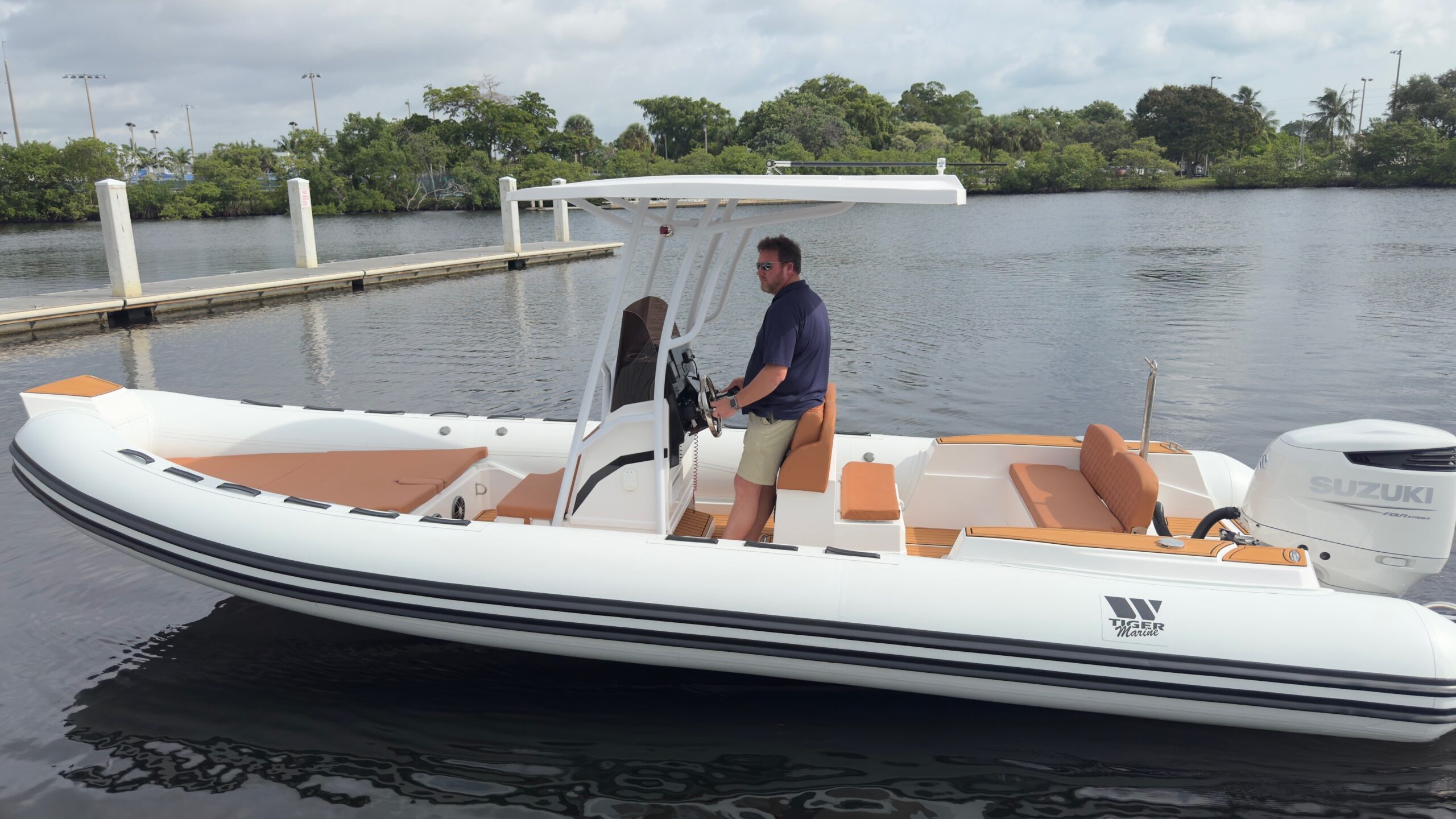 The Tiger Marine 740 PL is stocked with hypalon tube. SeaDeck faux teak, Silvertex cushion set, ski-pole, Nav lights, Bilge Pump, Battery system with cutoff switch, Fiberglass T-top with aluminum frame. SS rod holders. SS cup holders, SS swim ladder. Stand-up drivers seat with aft facing seat with arm rest, LED deck lights, Swim platforms with Swim Ladder.