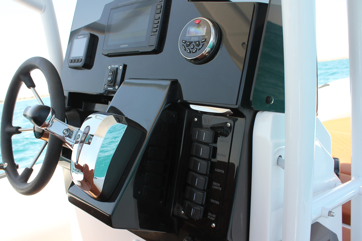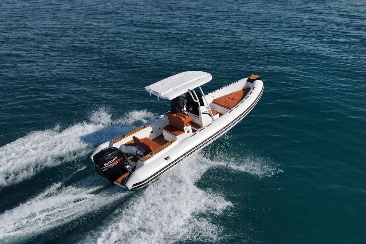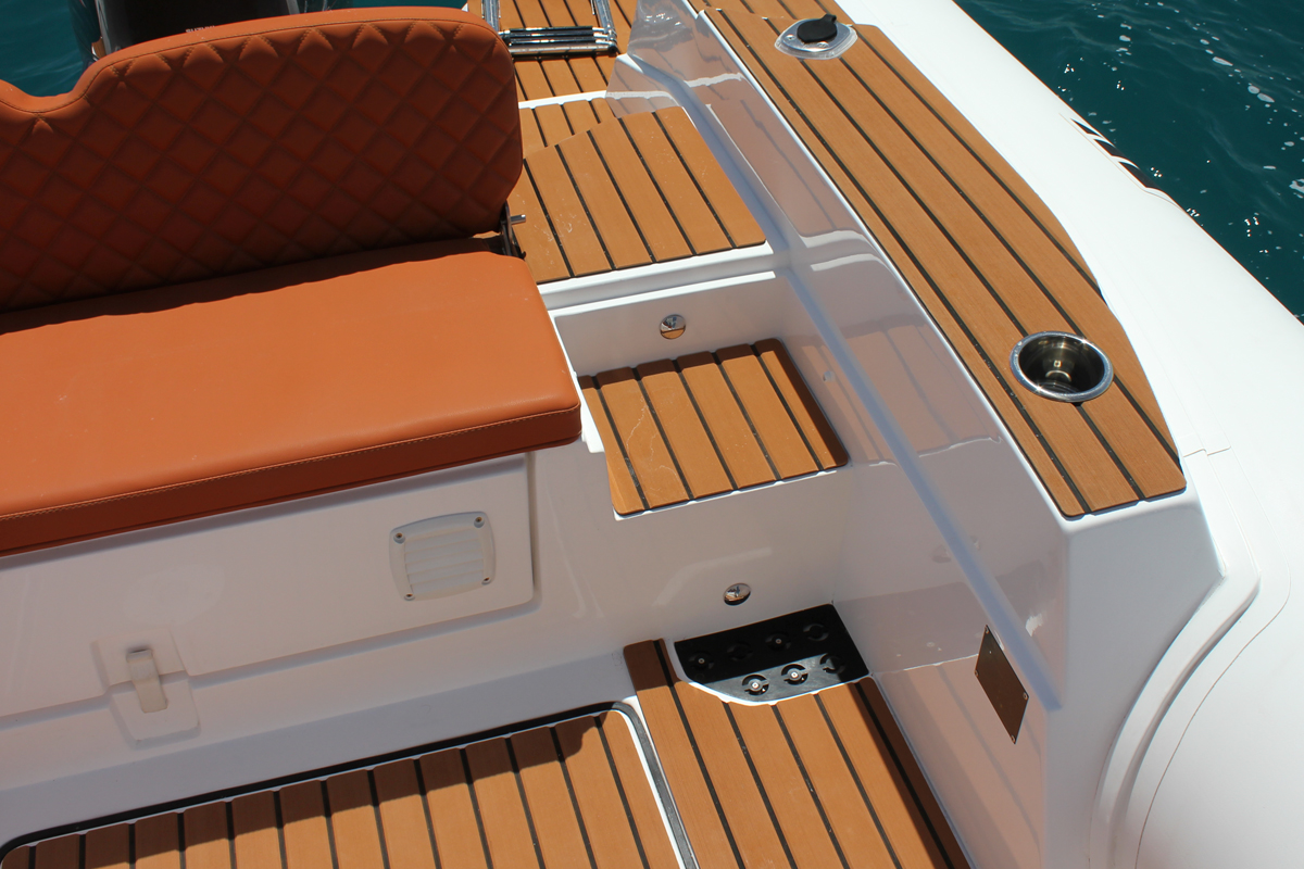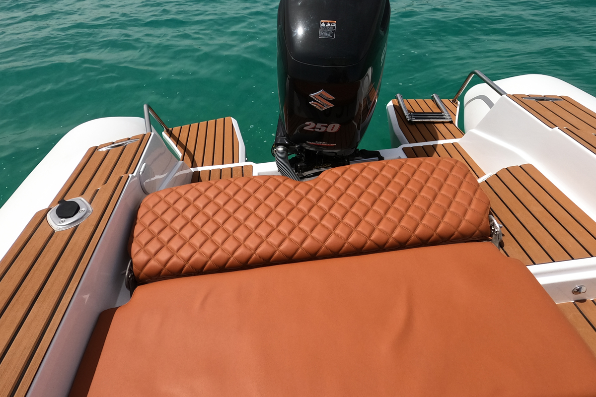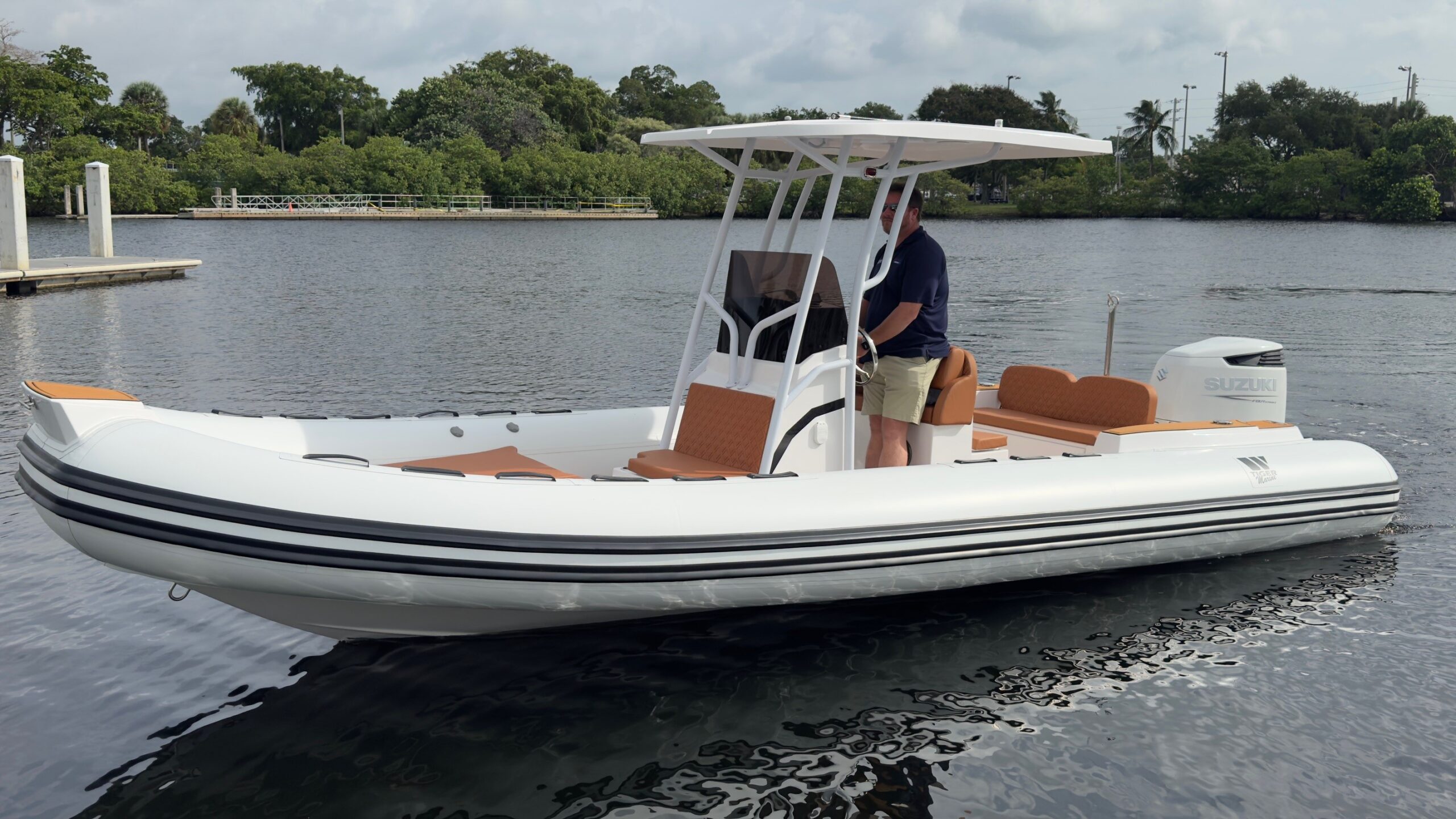 The Tiger Marine 740 PL is stocked with hypalon tube. SeaDeck faux teak, Silvertex cushion set, ski-pole, Nav lights, Bilge Pump, Battery system with cutoff switch, Fiberglass T-top with aluminum frame. SS rod holders. SS cup holders, SS swim ladder. Stand-up drivers seat with aft facing seat with arm rest, LED deck lights, Swim platforms with Swim Ladder.