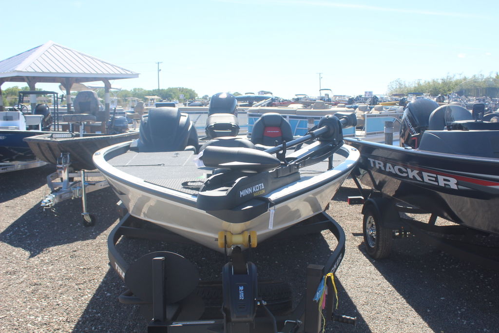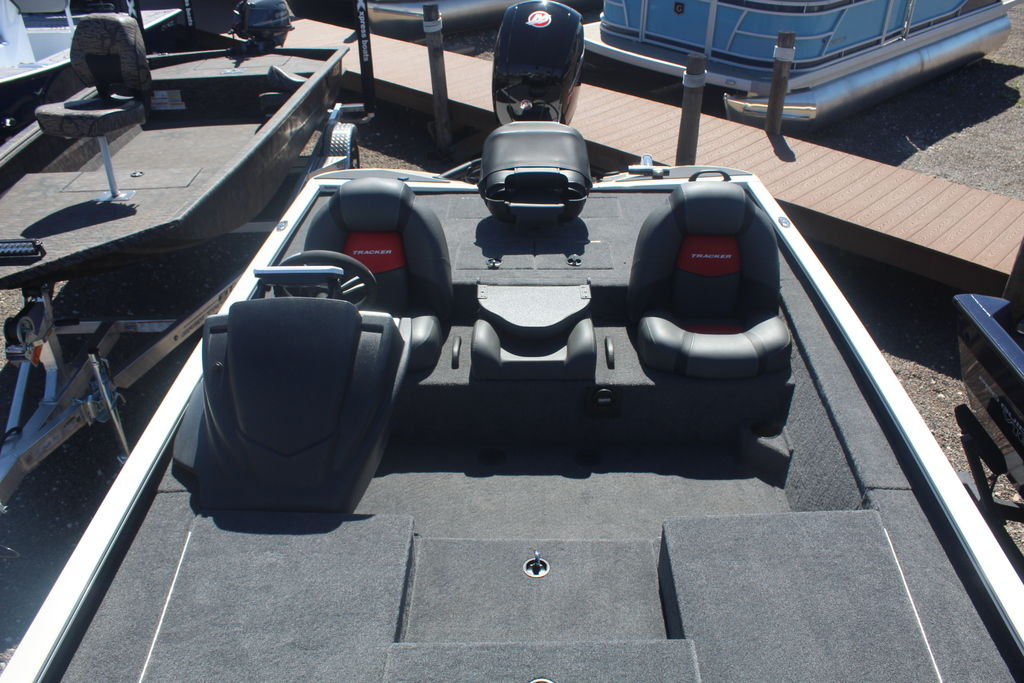 - 1-piece rotomolded TRACKER® console w/built-in controls, storage pocket & windscreen