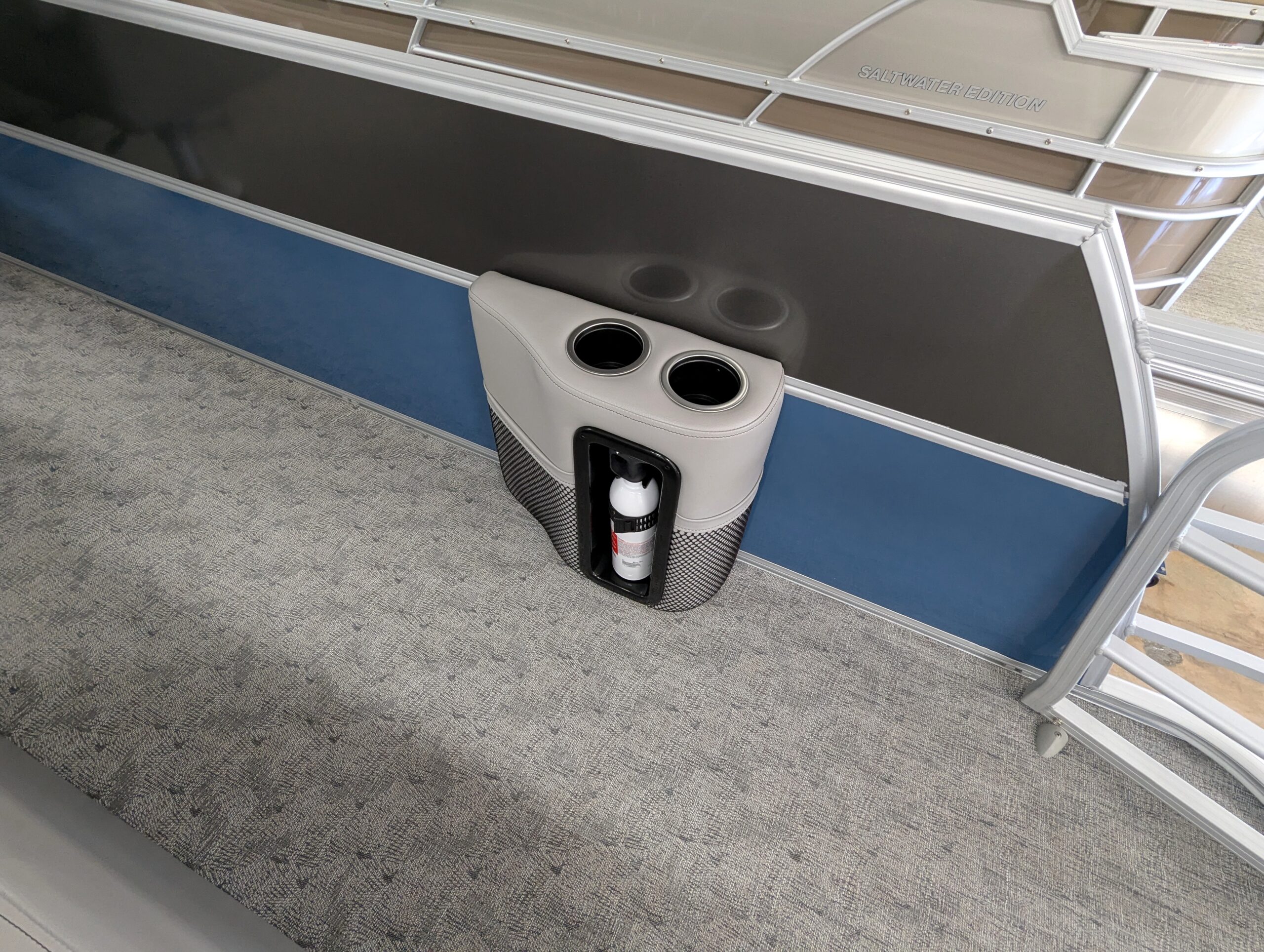 OPTIONS: Silver Rail, Panel 1: Charcoal, Panel 2: Caribbean Blue, Furniture Base : Capstone, Furniture Accent : Cobalt, 25" Shaft Transom, Coastal Concrete Flooring, Manual Double Bimini, Mooring Cover, Canvas Color: Coal, Mooring Cover Coal, Yamaha Power Assist Steering Pump, Yamaha Mechanical Pre-Rig, Premium Polymer Helm, SS Steering Wheel w/ Knob, Drop Down Stowable Privacy Curtain, SS Ski Tow Bar.