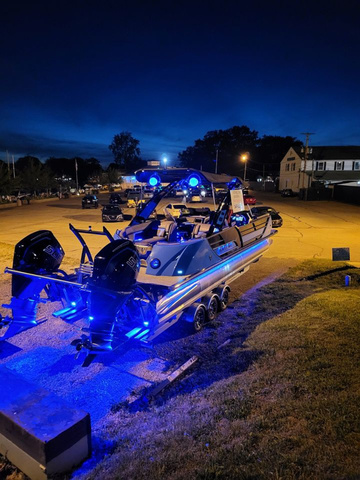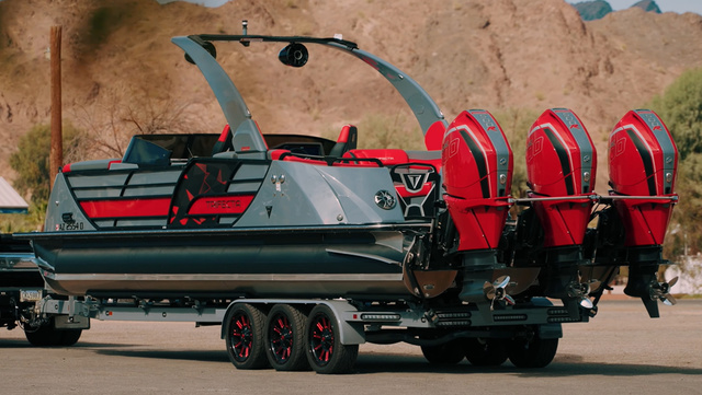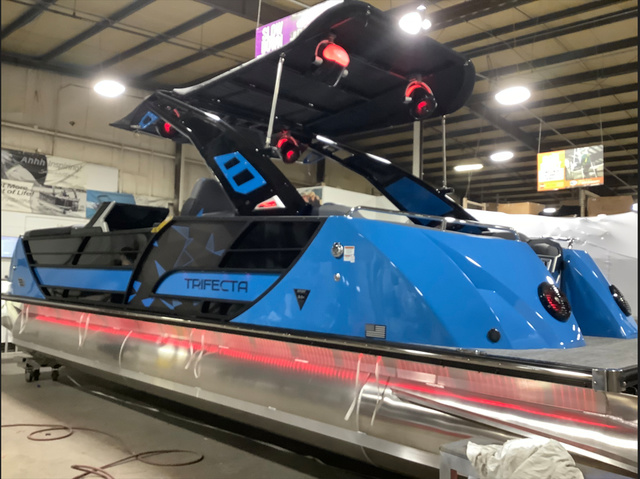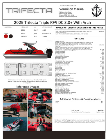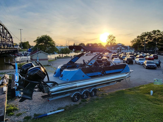 This absolutely ridiculous machine is set to arrive this year. Comprehensive customization of options and color schemes still available. Behold the limited edition Trifecta Sport Series with Triple Mercury 500 Racing Outboards giving it 1500HP! 32' length overall. Recommended with the 2nd generation Roswell Tower & speaker system. Very exclusive boat. To compare with cars - far, far fewer of these will be built than the top of the line Ferraris, Bugattis, McLarens, Lamborghinis, etc. The absolute king of pontoons. Acceleration will take your breath away. As will its turning ability. It will quite easily launch you across the boat if you're not paying attention - so better hold on to one of the many well placed grab handles. Reach out to us for the best deal you'll find on Trifecta's Sport Series, period. We welcome all reasonable offers! The Trifecta Sport Series is the unrivaled pinnacle of pontoon performance. There is no competition. This is not hyperbole. Three Mercury 500 Rs. Why? Figure that out for yourself. The result: the world's fastest "SuperToon" has gotten even faster. With the release of Mercury's remarkably high performance 500R racing outboards, Trifecta has been able to push the envelope even further - with a stock triple engine tritoon that is capable of speeds over 95 mph. Guaranteed to either put a permanent smile on your face or scare the absolute s*** out of your friends and family. Benefits of a triple or twin engine tritoon - 1. Comfort; it is immediately apparent that the ride quality of these boats is superior to other hull styles of comparable size in 95% of real life cases due to the reduction of slamming and 100% on inland lakes. I have even used the accelerometer to verify what people will tell me anyway after riding a (TRI)toon. They are dramatically smoother. To get the same ride quality you have to have nearly 50% longer fiberglass boat. Same applies to seating. Many of my older friends and family refuse to ride v-bottoms as they slam the chop much harder. Why is this the case? 2. Efficiency; Because the much lighter hull is being lifted out of the water to greatly reduce friction and maximize efficiency. You get more performance for your horsepower and will eat half as much gas as a similarly sized fiberglass boat. And good luck comfortably seating the same number of people on said boat. 3. Quickness & Agility; The lightness, buoyancy, and ground effect created between the toons enables near car-like acceleration. It is an addictive feeling and keeps people coming back for more. I have yet to feel anything like it in a boat anywhere near comparable to this one. I can go on and on but ultimately this is a boat that must be experienced. We welcome all those who are serious about getting into a new triple or twin engine tritoon to reach out and schedule a test drive with us out on beautiful Lake Erie. An ideal proving ground! Spec List: Packages: Performance Package (25Sport RF9 DC 3.0+) Includes: Full Center Tube, Aluminum Underdeck, Large Lifting Strakes On The Center Tube, Large Lifting Strakes On The Inside Of The Outer Tubes, Spray Rails, Pad Running Surface, Hydraulic Steering, Power Assist Steering Pump, Sport Ski Tow Bar, 156 Gallon Fuel Tank Includes: Power Assist Steering Pump, Aluminum Underdeck, Lifting Strakes, Seastar Hydraulic Steering, Ski Tow Bar Safety Net, Sport Ski Tow Bar, Motor Installation, RGB Lighted Cupholders, RGB LED Floor, Table & Seat Base Lights Trim Level "Black Out" Package Includes: Black Anodized Rails, Black Anodized Bimini Top Frame, Black Rail Spacers, Black Pinch Guards, Black Door Stops, Black Rail Plugs , Black Anodized Deck Trim, Black Splice Covers, Black Rub Rail, Black Corner Pads, Black Snap Screws, Black Table Leg & Base Roswell Package Includes: Roswell Power Sport Arch Roswell Ultra Premium Audio Package Roswell Swivel RGB LED Tower Speakers Roswell Base: Slate Roswell Accent Panel: Victory Red Exterior: Panel 1: Slate Panel 2: Slate Panel 3: Victory Red Accent Sweep: Black Onyx Fiberglass Color: Victory Red Interior: Large Simrad Display (GPS & Scan) Furniture Base: Cool Touch Hellfire Red Furniture Accent: No Secondary Accent Color High Back Chair w/ Bolster High Back Port Chair w/ Bolster HD Folding Table Wet Sounds Upgraded Audio 8" Speakers Roswell Upgraded Audio Package Subwoofers & Amplifier RGB LED Under Deck Lights RGB LED Exterior Rail Lights RGB LED Underwater Lighting RGB LED Speaker Lights RGB LED Cupholder Lights RGB LED Floor, Table & Seat Base Lights Stanstrut Atmos Rapid Pump Inflating & Deflating Device for Inflatables Trifecta Quick Release Fender Clips (Qty 8) Sport Ski Tow Bar Flag/Go Pro Mount Chassis Upgrades: 25" Shaft Transom for Triples Moving Prop Alert - Dual Display In Floor Storage Silver Teak Look Flooring Helm Color: Slate Canvas, Bimini & Mooring Cover (Onyx) Sport Ski Tow Bar (Onyx) Engines: 3x 500R Color Matched Victory Red & Slate, 1 Counter Rotating - Total 1500HP Mercury 500R Triple Rigging Hydraulic Jack Plate - 10" Set Back(Twin) Engine Rigging Mercury 500R Triple Rigging Active Trim Water Ready Mercury Racing Stainless Steel Props (Lab Finish Available) Deck Length: 336 in. (8500 mm) Deck Width: 102 in. (2.6 m) Weight: 3130 lb. (1419.8 kg.) Capacity: 2170 lb. (984.3 kg.) Number of Tubes: 3 Fuel Capacity: 52 gal. (196.8 L)
