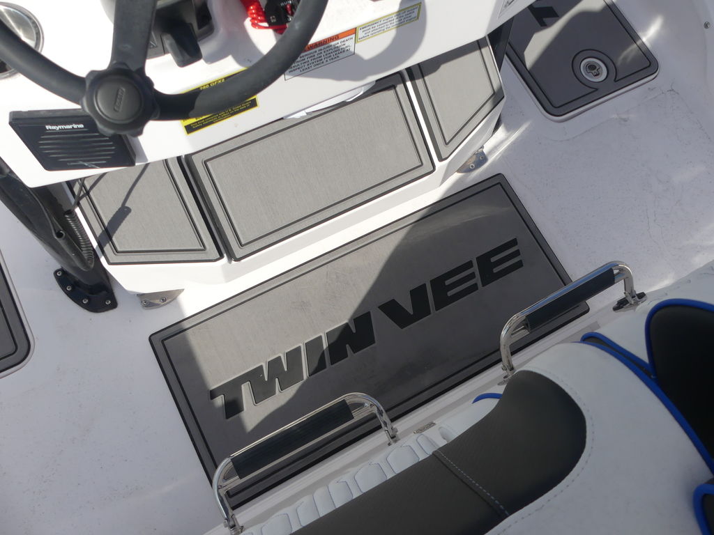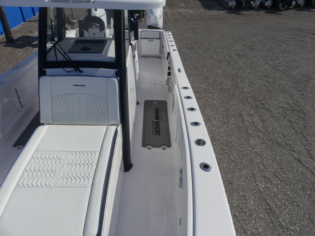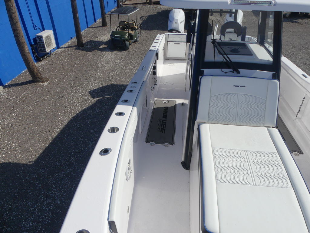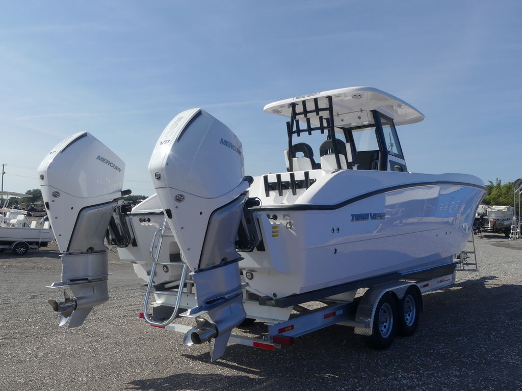 The Ultimate Offshore Edge: 2025 Twin Vee 280 GFX2 Center ConsoleExperience the future of offshore boating with the all-new 2025 Twin Vee 280 GFX2 Center Console, powered by a commanding pair of Twin Mercury 300 V8 outboards. This is the Swiss Army Knife of power catamarans, engineered for unmatched stability, speed, and luxury.The 280 GFX2 represents the second generation of Twin Vee's high-tech line, combining a proven, soft-riding PowerCat hull with a completely reimagined, sophisticated feature set.1 The 9-foot, 6-inch beam and foam-filled, vacuum-infused construction deliver a ride so smooth, even in choppy seas, passengers will be "amazed when they get on the boat" and feel no jarring impact.Power & PerformanceTwin Mercury 300 V8 Outboards: Maximize the hull's 600 HP rating. These robust four-stroke engines provide exceptional acceleration (0-30 MPH in approximately $5.42$ seconds), confident top-end speed, and the renowned reliability of Mercury power.Massive Range: With a huge 230-gallon fuel capacity, the catamaran design offers superior fuel efficiency and increased range for those deep-water canyons or extended island trips.2Cutting-Edge Control: Equipped with Seastar Optimus Electric/Hydraulic Steering (often standard with Mercury packages) and a modernized, digital switching helm for effortless command.3Fishing & Comfort Command CenterIntegrated Hardtop System: Features a sleek, powder-coated aluminum T-top with integrated LED lighting, speakers, and flush mounting for advanced electronics (Radar, FLIR, etc.).4Advanced Helm Station: Boasts an ergonomic, modern dash designed to accommodate large touchscreen MFDs (like the optional 24" Raymarine or dual 12" Garmin displays), along with a wireless phone charger and redundant membrane switches for critical functions.550-Gallon Livewell & Tackle Center: The molded fiberglass helm seating unit integrates a massive insulated livewell and multiple tackle storage centers, ready for any tournament.6Premium Seating: Enjoy luxury sport-stitched marine-grade upholstery, comfortable Llebroc twin helm seats, and forward bow lounge seating with removable forward-facing backrests.7Extensive Storage: Features twin macerated, in-deck fish boxes, large bow storage compartments (coffin box style), and generous rod storage throughout the cockpit and gunwales.8This 2025 Twin Vee 280 GFX2 with Twin 300 Mercs is the definitive choice for the serious angler and family boater who demands speed, stability, efficiency, and a truly comfortable ride, regardless of the conditions.