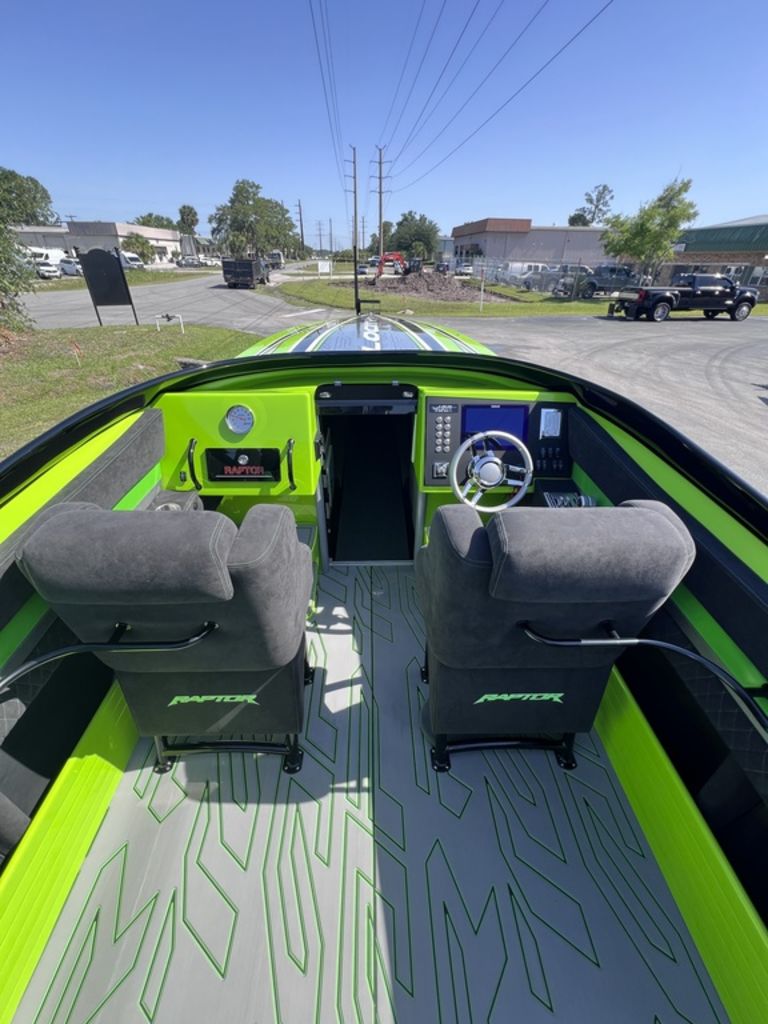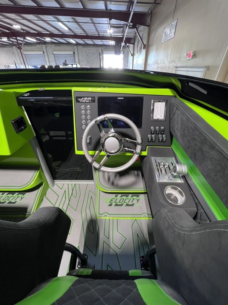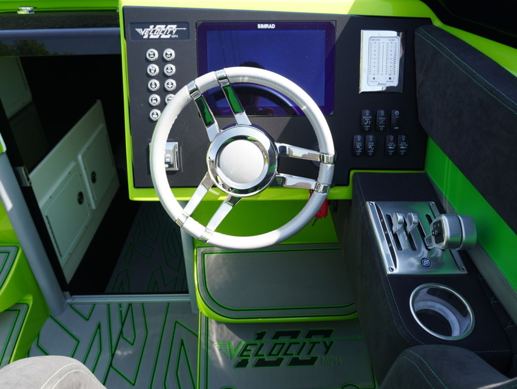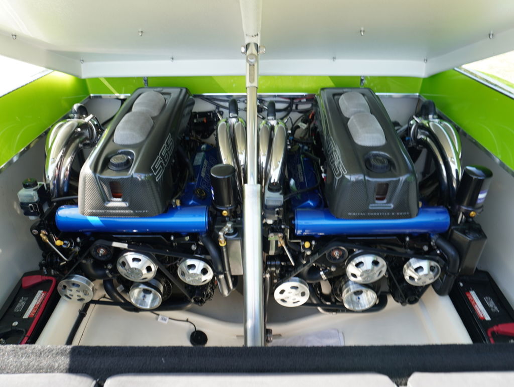 Features: Full hydraulic steering with power assist, Livorsi carbon Monster gauges and controls, electric bolster seats with foot rests, multi-color cockpit lighting, Wet Sounds stereo system with six speakers and amplifier, cabin with V-berth, enclosed head and shower, Gemlux cleats, stainless steel ladder, race fairing/windshield, Livorsi billet trim tabs with lab-finished stainless steel prop, Coosa composite transom with infused hull construction, large storage areas with glove box and cabin cabinets, heavy-duty rub rail, and polished grab handles, with a fuel capacity of 190 gallons and an approximate weight of 9,300 lbs.