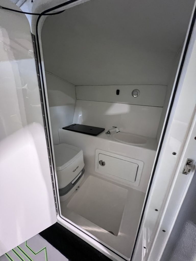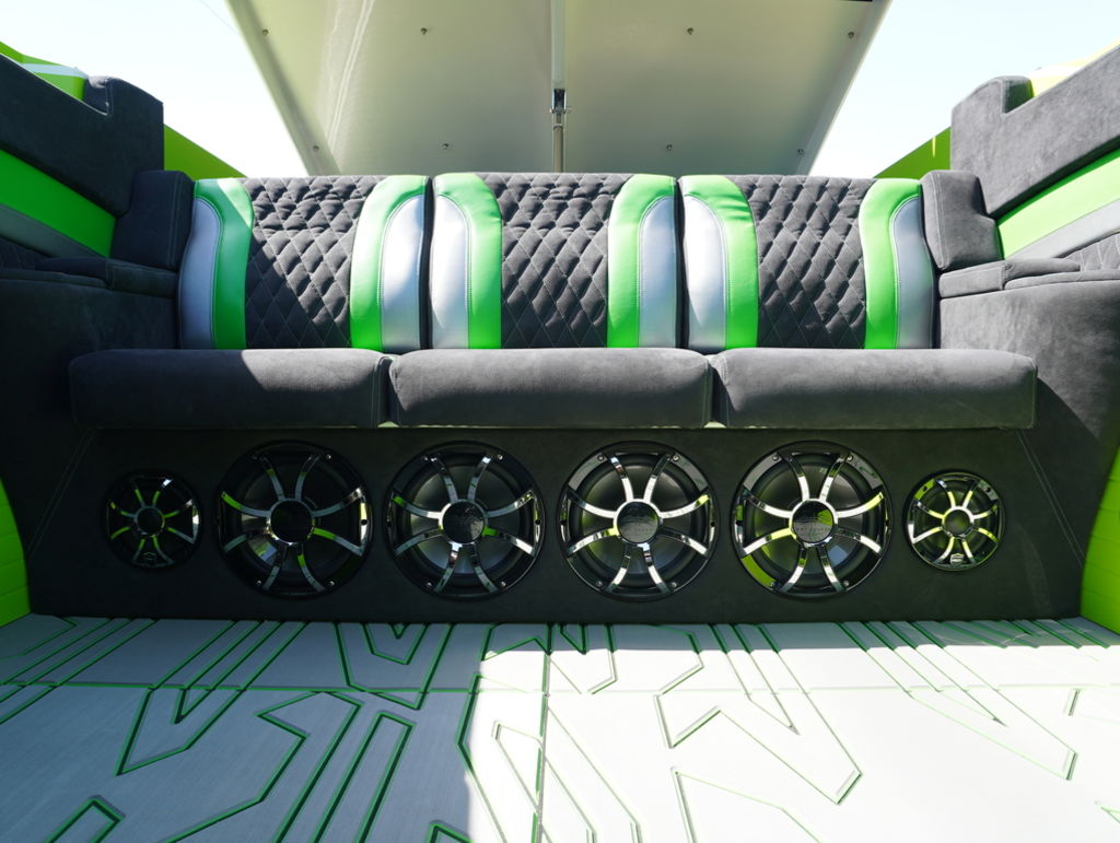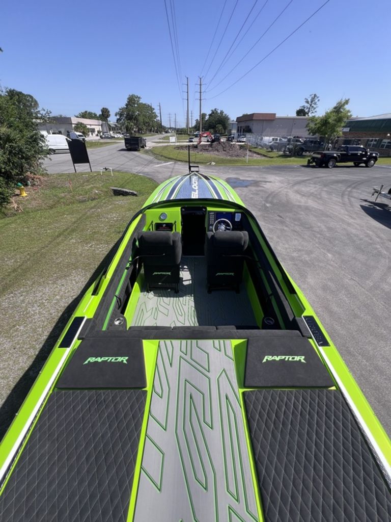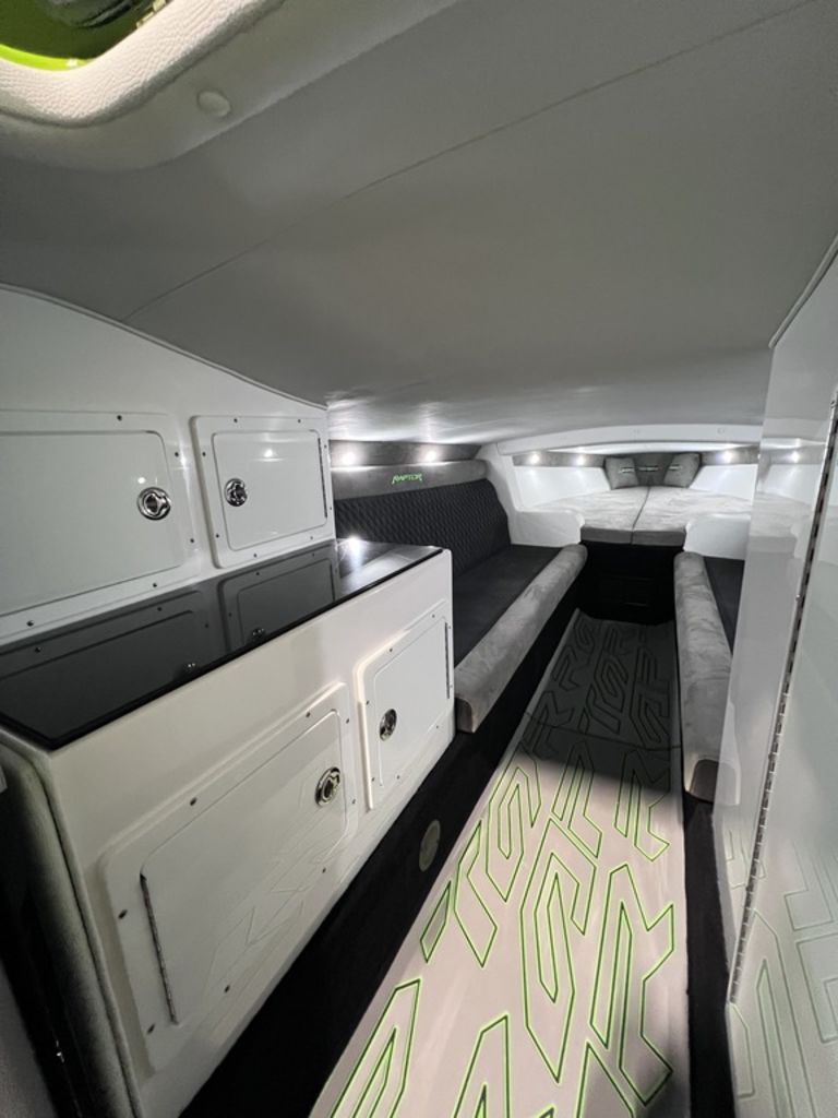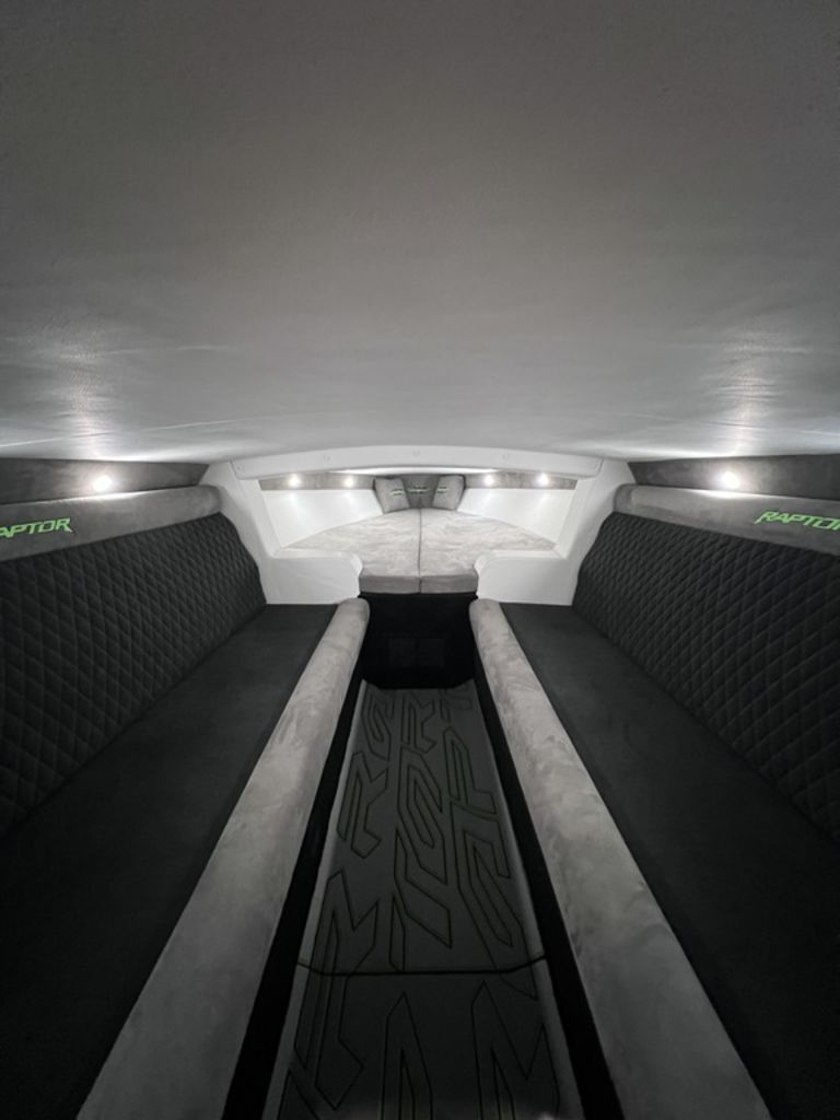 Features: Full hydraulic steering with power assist, Livorsi carbon Monster gauges and controls, electric bolster seats with foot rests, multi-color cockpit lighting, Wet Sounds stereo system with six speakers and amplifier, cabin with V-berth, enclosed head and shower, Gemlux cleats, stainless steel ladder, race fairing/windshield, Livorsi billet trim tabs with lab-finished stainless steel prop, Coosa composite transom with infused hull construction, large storage areas with glove box and cabin cabinets, heavy-duty rub rail, and polished grab handles, with a fuel capacity of 190 gallons and an approximate weight of 9,300 lbs.