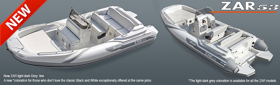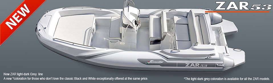 ZAR 53, It is the ZAR of records: (comfortable 10 seats, a double double bed, 8 peaks to stow goods and a range of unique combinations seats/sun bathing bed/bed/table. This boat has revolutionized the concept of the rubber dinghies, in only 5.35 meters it withholds all the innovations introduced by “ZAR project”. Ideal for the family, that can enjoy wonderful autonomous nautical camping days (and nights); ZAR 53 is excellent for all purposes. It bears high-rank motors (140 HP) and offers remarkable performance, or moderate ones (70 HP) without disadvantages for pleasant sailing. Everything has been planned and built for maximum comfort. The hull is deep and long as much as the one of many bigger boats, it offers soft sailing on the waves, stable tacking and agility, The line elegance and the practical design make ZAR 53 a unique rubber boat all over the world.