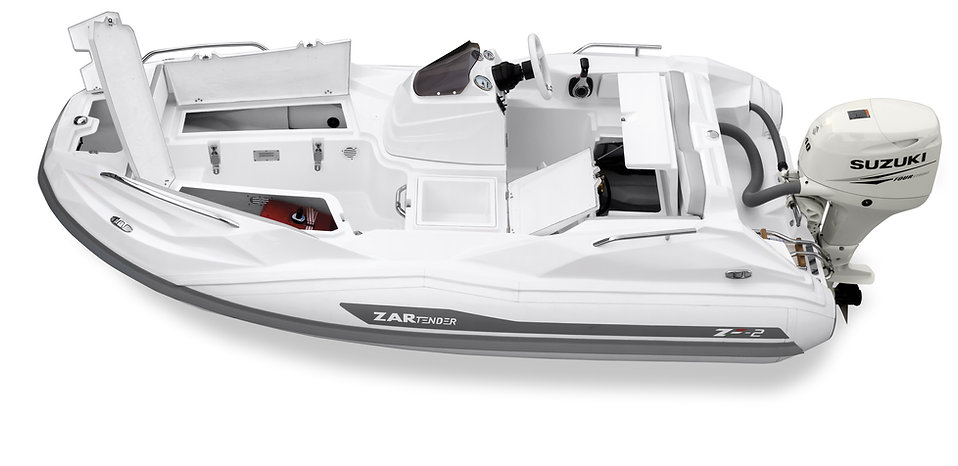 The ZAR ZF-2 is the perfect median between the ZF-1 and ZF-3. The ZAR ZF-2 is 12 feet long and has a layout with U-shaped seating in the bow. No other 12 foot tender seats 6 people in seats and performs with grace and agility in every situation. Rigged with a 60hp, the ZF-2 will easily plane out either pulling up a skiier or loaded to the max with passengers. Having double the storage of comparable boats, the ZF-2 has more than enough room for all of your gear.