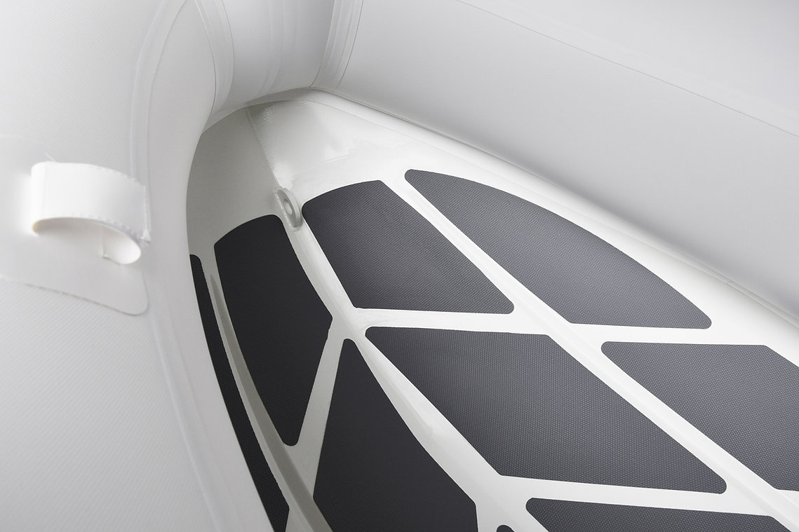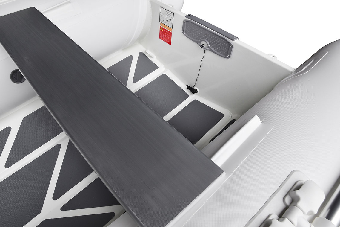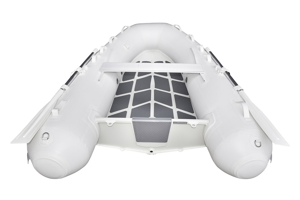 Standard Features RIB line Medium-V bottom with non-skid pattern ,Reinforced integral transom for outboard engine ,2 reinforced towing bow eyes ,Self drainage plug,Multi-chamber buoyancy tube with 4 Chambers ,Tough raised rubbing strake with splash guard ,adjustable & removable ALU seat(s) ,2 Bow lifting handle ,2 Rear lifting handles ,Holding handles on tube ,Keelguard ,2 oarlocks with 2 oars and oar posts ,High efficiency foot pump ,Maintenance kit & User's manual.