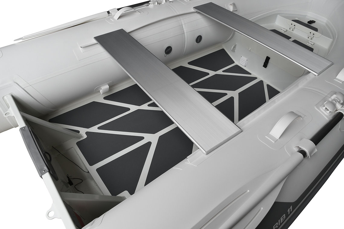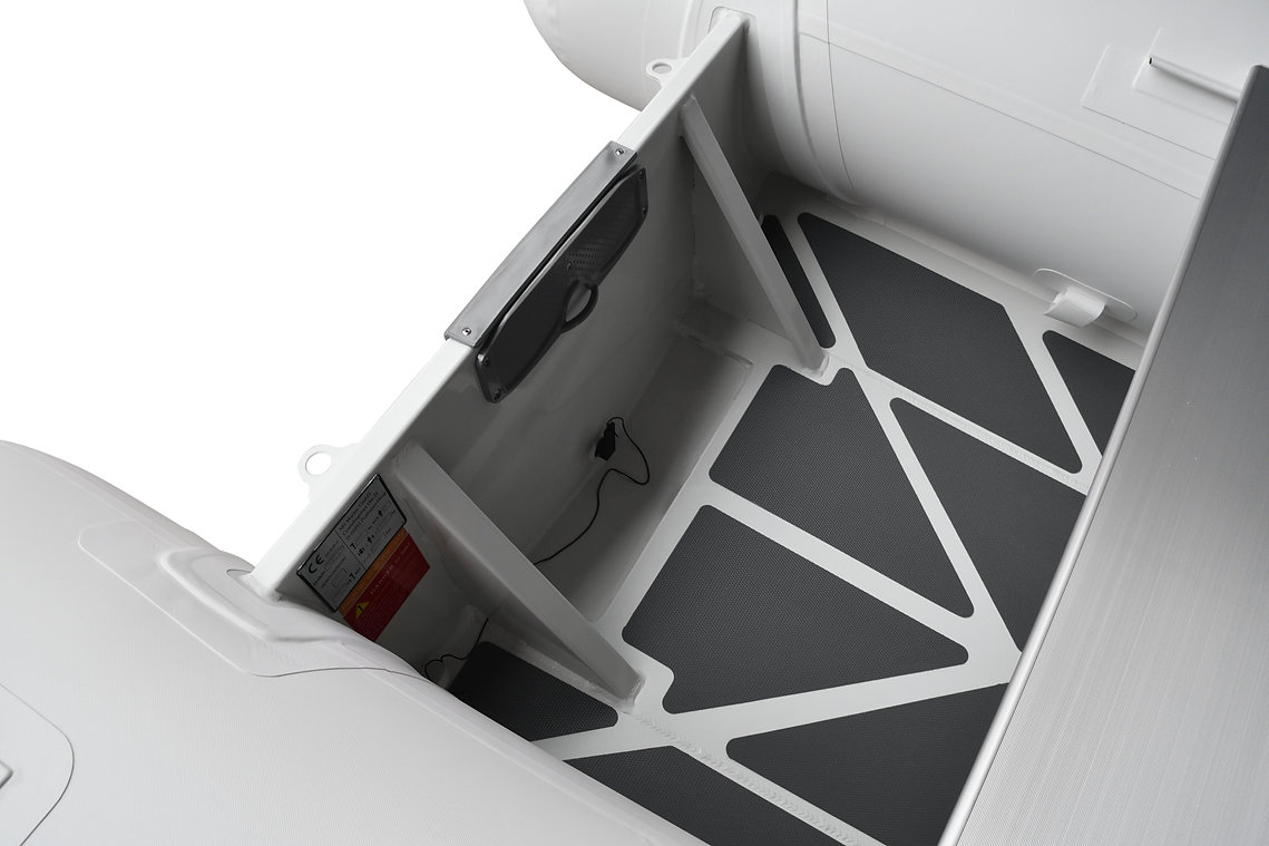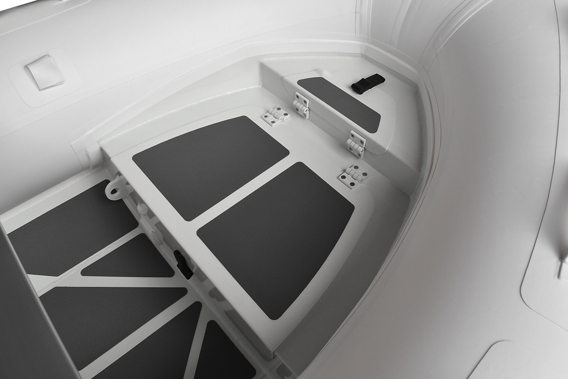 Medium-V bottom ,Flat deck with non-skid pattern ,Reinforced integral transom for outboard engine ,2 reinforced towing bow eyes ,Splash guard on transom ,Self drainage plug,Multi-chamber buoyancy tube ,Tough raised rubbing strake with ,adjustable & removable ALU seat(s) ,Bow handle ,2 Rear handles ,Holding handles on tube ,Keelguard ,2 oarlocks with 2 oars and oar posts ,High efficiency foot pump ,Maintenance kit & User's manual ,Extra wide double flooring flat inside* ,Bow locker with anchor locker large enough for 6 gal fuel tank with separate anchor locker hatch.