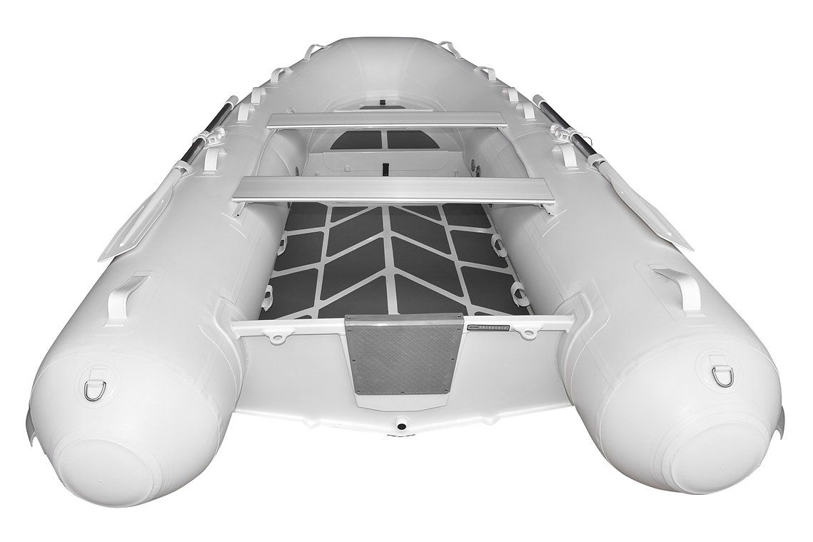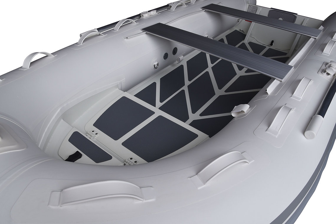 Medium-V bottom ,Flat deck with non-skid pattern ,Reinforced integral transom for outboard engine ,2 reinforced towing bow eyes ,Self drainage plug,Multi-chamber buoyancy tube with 4 chambers ,Tough raised rubbing strake with splash guard ,adjustable & removable ALU seat(s) , Bow handle ,2 Rear handles ,Holding handles on tube ,Keelguard ,High efficiency foot pump ,Maintenance kit & User's manual ,Extra wide double flooring flat inside* ,Bow locker with separate anchor locker large enough for 6 gal fuel tank.