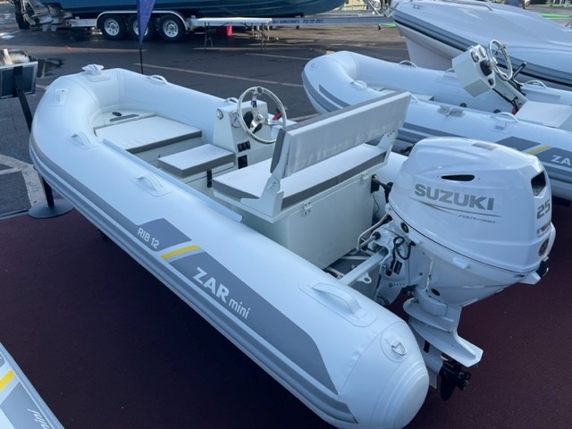 ZAR Mini RIB 12 Tender Rigging Packaged includes- Outboard motor complete with fuel tank, engine controls, battery with cutoff switch and battery box, switch panel, nav lights, automatic bilge pump.