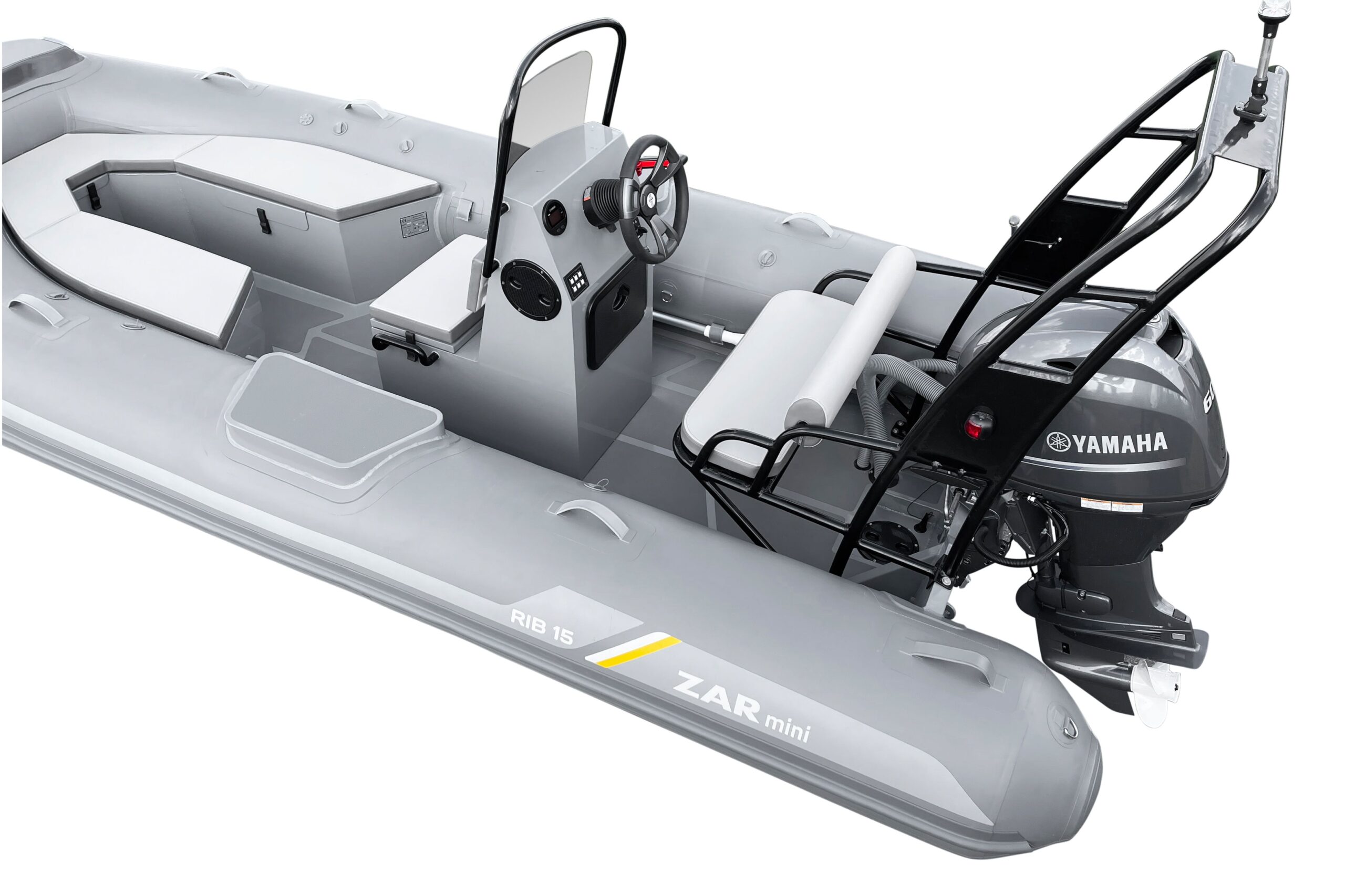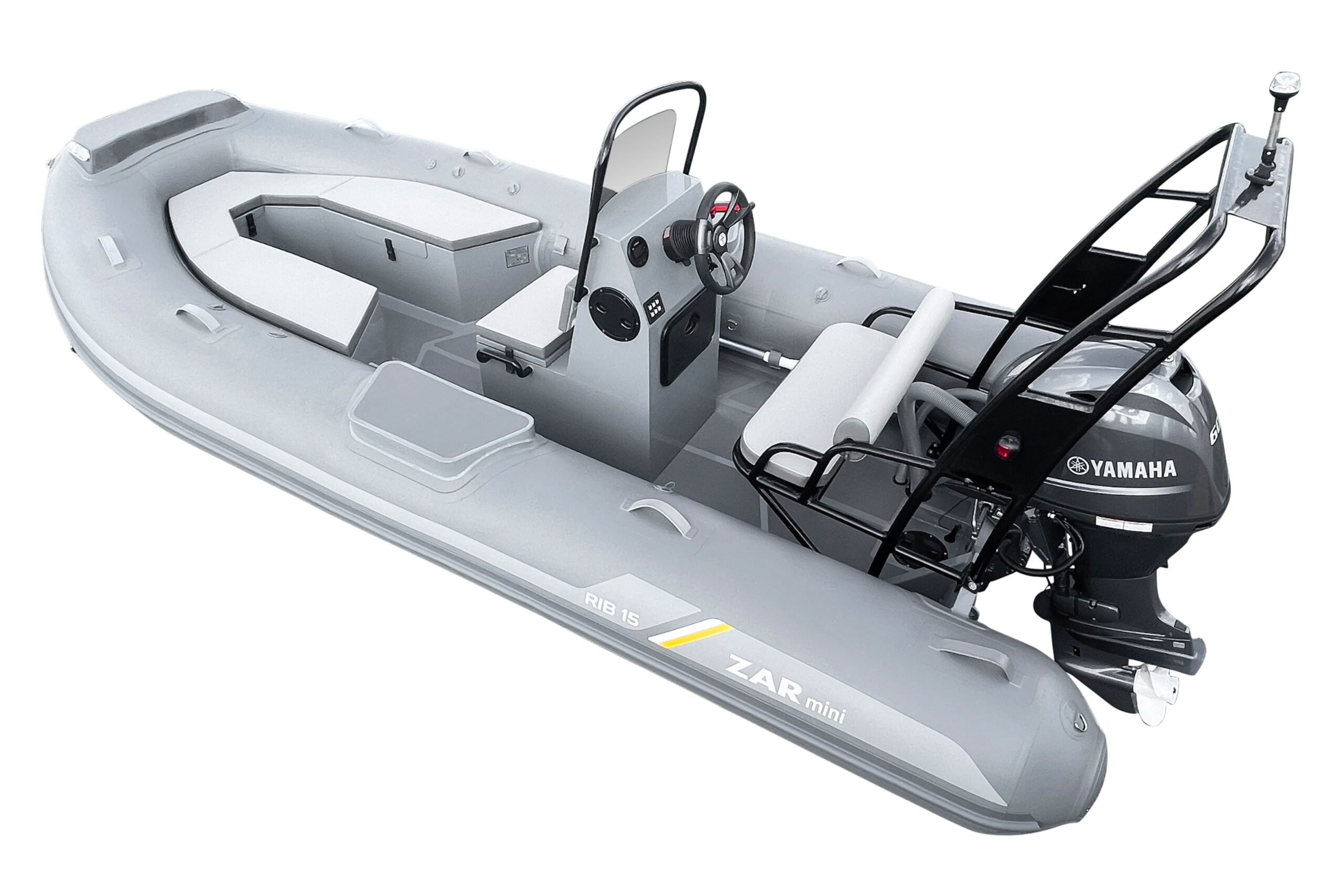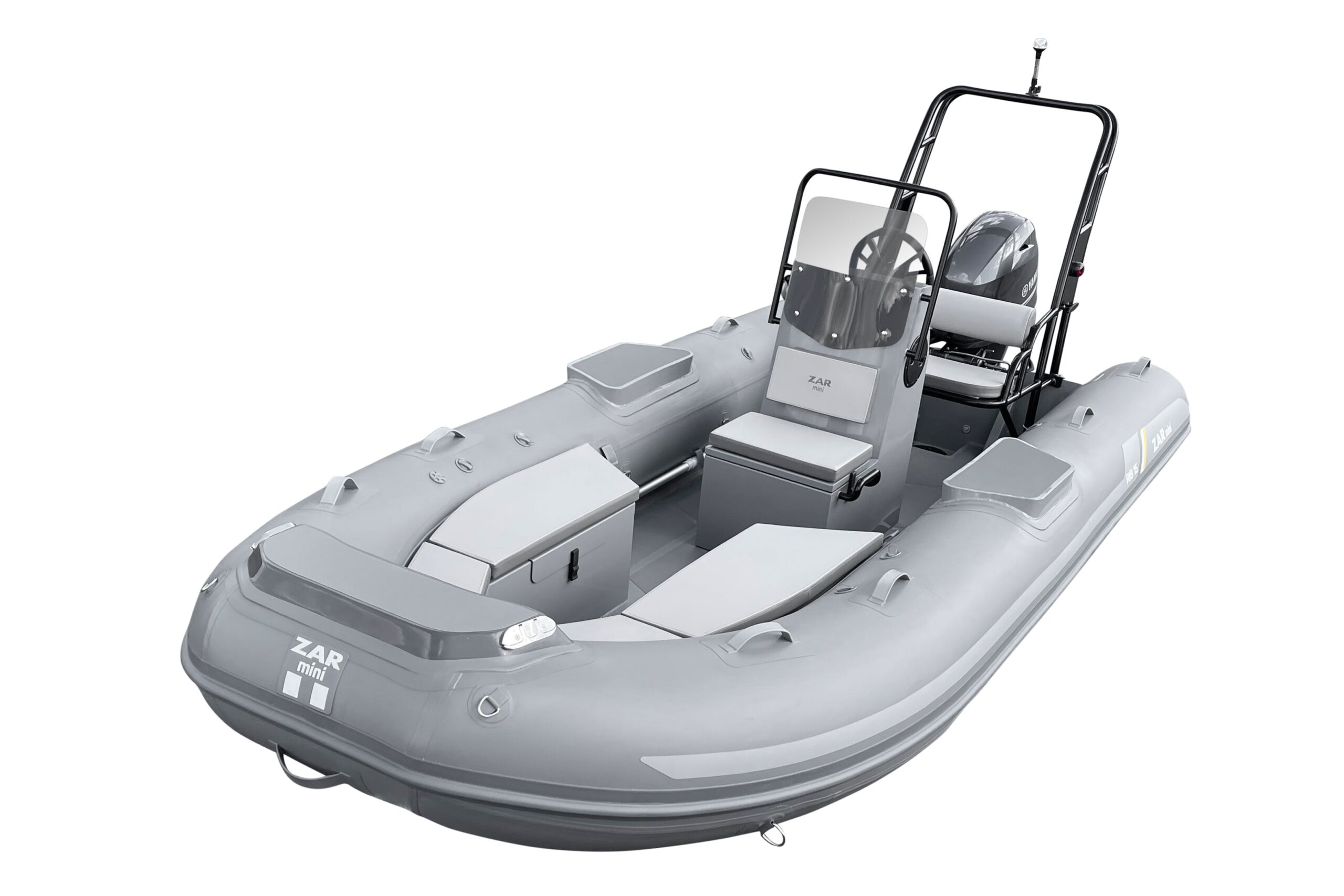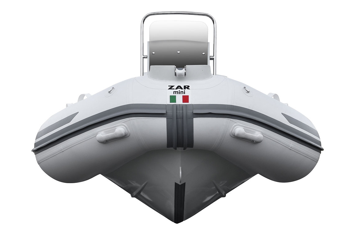 ZAR Mini RIB 15 Tender Aluminum hull SUV. The ZAR Mini RIB 15 Tender with it's u-shaped seating in the bow offers a bit more seating and storage than the RIB 15 SUV (with the bow locker forward). The ZAR Mini RIB 15 Tender Aluminum hull SUV has a very deep-v hull that provides an excellent ride while the oversized tubes offer the stability you want and need. With our custom made 3 person bench seat for the console, the Hight is just right as a seat or as a leaning bolster while running. The high backrest is sure to leave even the biggest of guys comfortable for the ride.