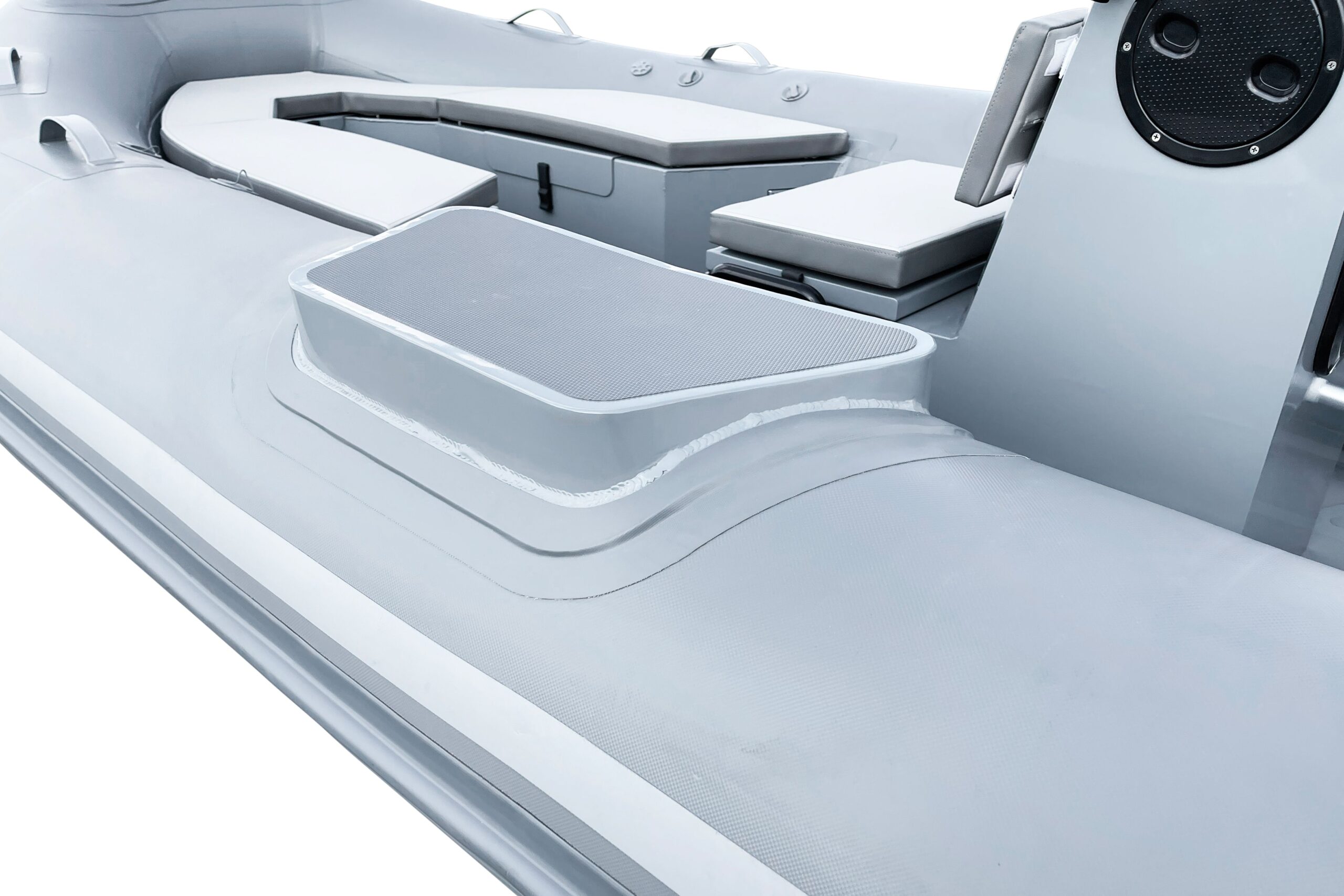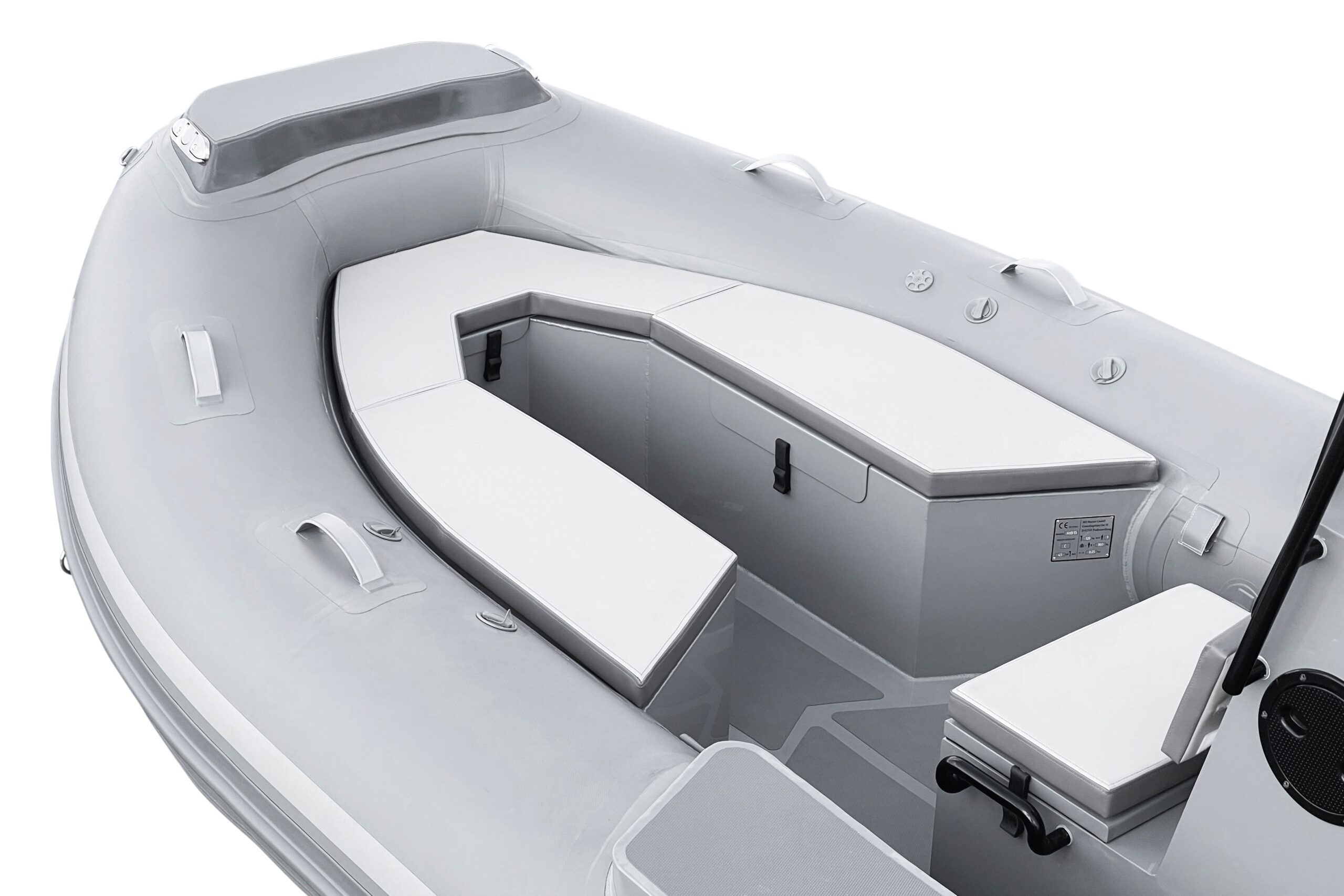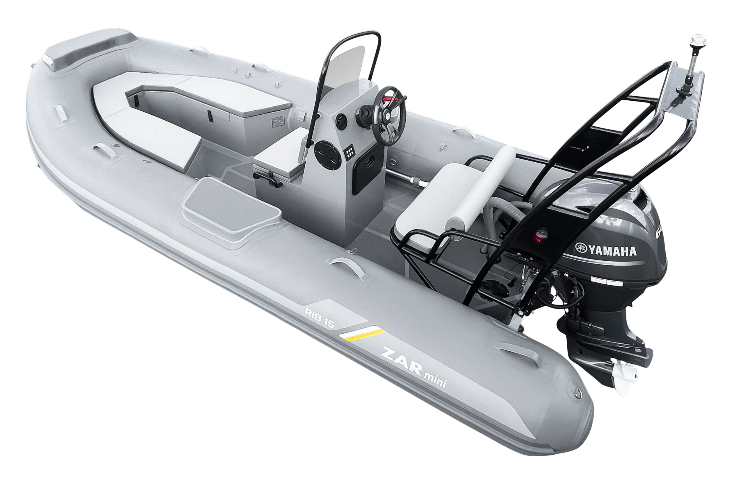 ZAR Mini RIB 15 Tender Aluminum hull SUV. The ZAR Mini RIB 15 Tender with it's u-shaped seating in the bow offers a bit more seating and storage than the RIB 15 SUV (with the bow locker forward). The ZAR Mini RIB 15 Tender Aluminum hull SUV has a very deep-v hull that provides an excellent ride while the oversized tubes offer the stability you want and need. With our custom made 3 person bench seat for the console, the Hight is just right as a seat or as a leaning bolster while running. The high backrest is sure to leave even the biggest of guys comfortable for the ride.