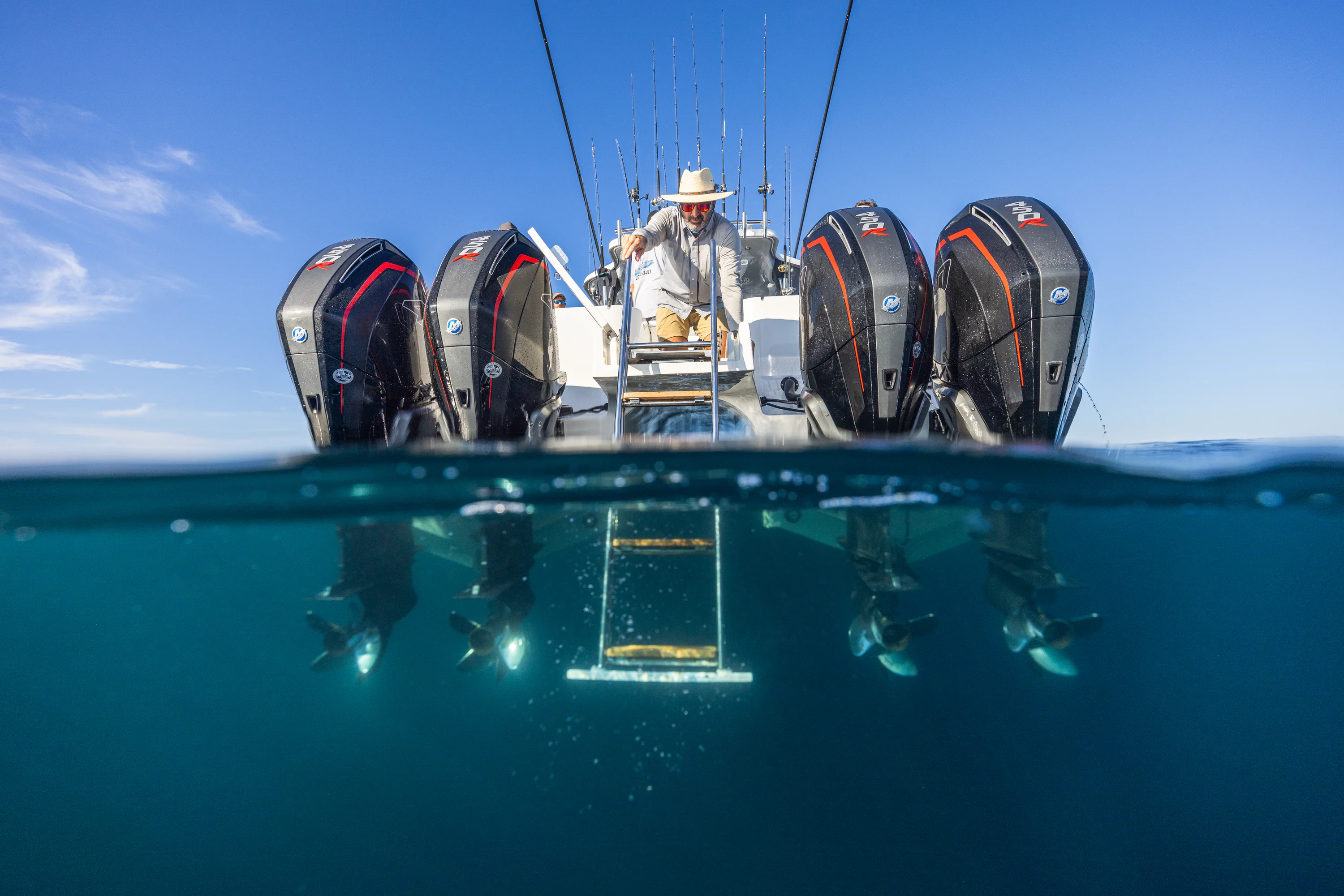 Power & Performance - Powered by twin 600 horsepower or quad 400 horsepower Mercury Verado outboards, built with advanced carbon fiber construction, this model delivers exceptional strength, rigidity, and fuel efficiency at high speeds.