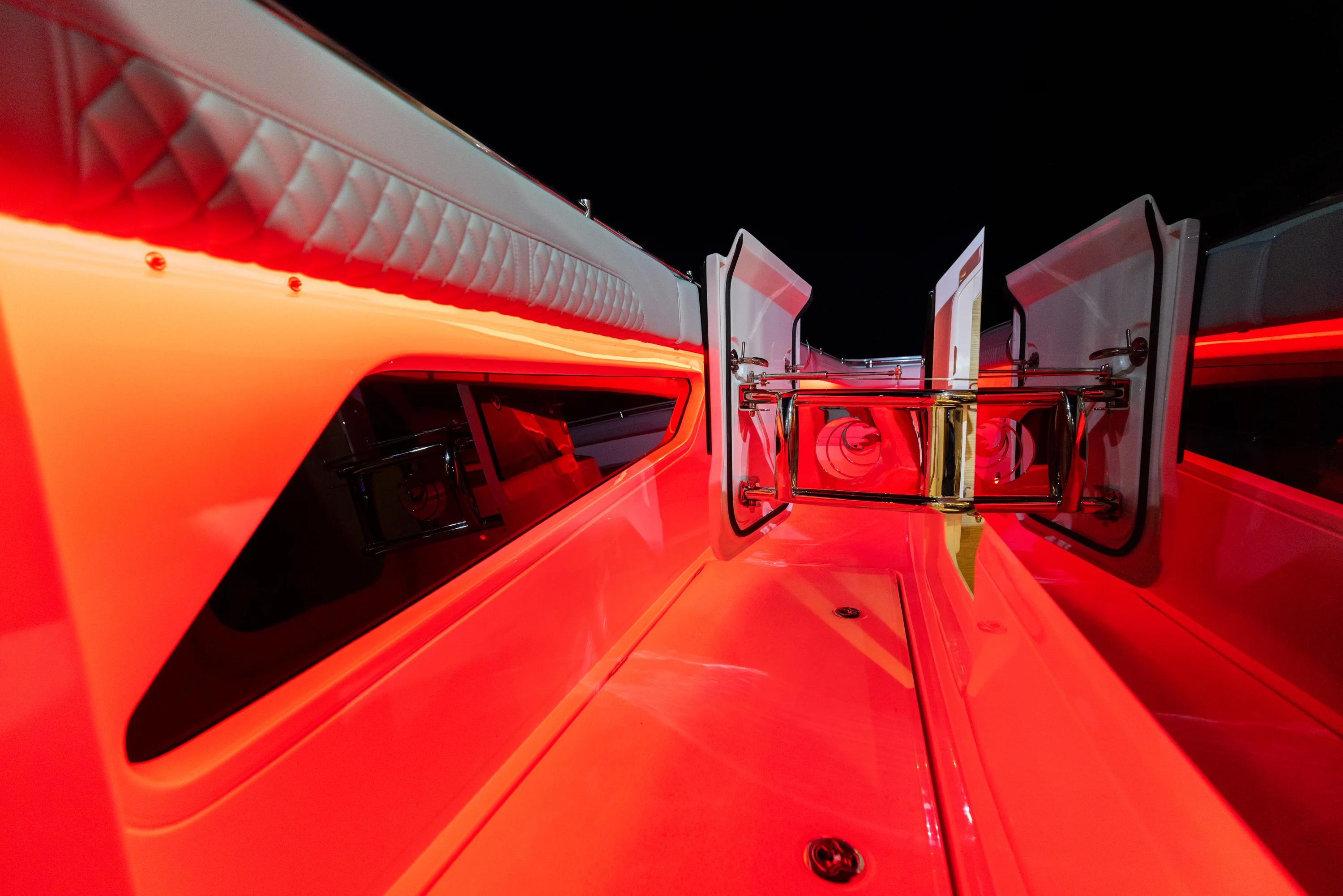Power & Performance - Powered by twin 600 horsepower or quad 400 horsepower Mercury Verado outboards, built with advanced carbon fiber construction, this model delivers exceptional strength, rigidity, and fuel efficiency at high speeds.