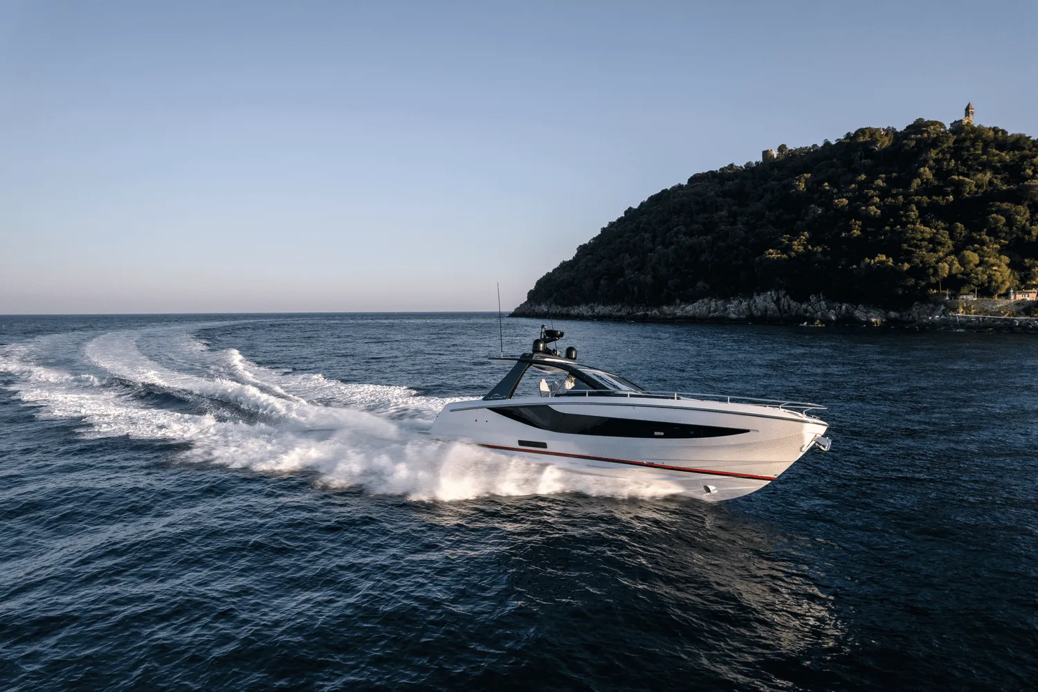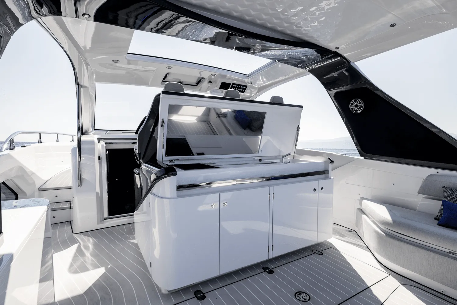 Rebellious energy and excitement come to life in the Verve 42. Forward-facing and adrenalinic, this performance-driven outboard yacht incorporates a fast and compact nature, while cultivating a contemporary sense of luxury on board. A unique and novel boat for the segment, this fresh weekender’s elegant and livable habitats pave the way to easy well being, giving guests the chance to appreciate relaxed refinement as well as an uncompromised navigational ambition all in one. Key Features Relaxation is the Name of the Game - Versatility takes center stage, with a high-low table that cam be completely removed from sight. The cockpit also features a side panel that opens up and niftily transforms into a surprising platform over the water, and can deploy a retractable ladder for easy access to the water.
