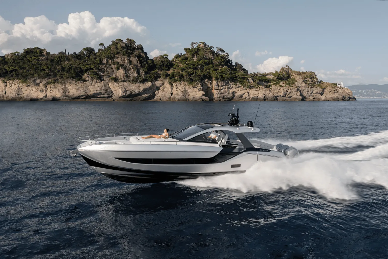 A phenomenon of performance and the sea born of immersive DNA, the Verve 48 favors the most authentic emotions and superior comfort. With the power to travel over the water up to 50 knots, this single sensational yacht with outboard motors unites speed and agility, becoming the optimal choice for those who love fluid and frequent movements, and want to feel at one with the sea. A statement of powerful design, this vessel full of character represents pure innovation: welcome weekender. Key Features A Perfect Fusion of Fun & Functionality - She is designed for functionality, accommodating a wide range of uses in comfort and more transforming pieces, like the fullsize table which disappears into the floor to clear space between meals and the deployable TV for al fresco viewing parties. The complete kitchen island is ready to serve gatherings of any nature, with a wet bar, fridge, ice maker, barbeque, hot plate and sink.