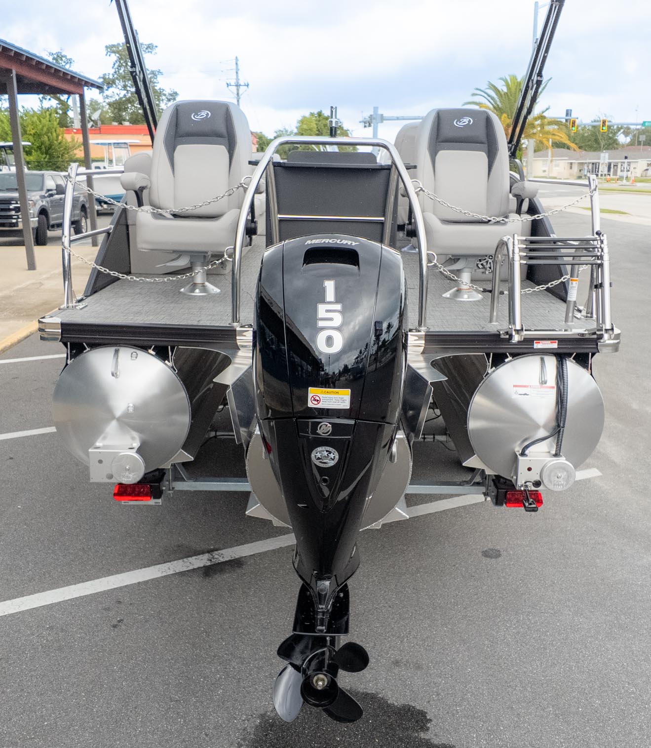 The boat is powered by a Mercury 150L Four Stroke motor. It has a Triple Toon Package, which provides a smooth, stable ride and allows for an in-floor midship storage compartment to keep the deck tidy. The spacious deck can accommodate up to 12 passengers, so you can bring everyone along for the adventure. It also features the Barletta "Doggie-Dock" with a see-through acrylic bow gate for your furry friends. From the captain's chair, a reclining helm seat with swivel and slide, you can navigate with the Simrad 7" G07 XSE. Enjoy your favorite tunes on the JBL Marine Stereo with four speakers and keep devices charged with USB ports. This pontoon is a perfect choice for those who love to fish but also want to entertain on the water.