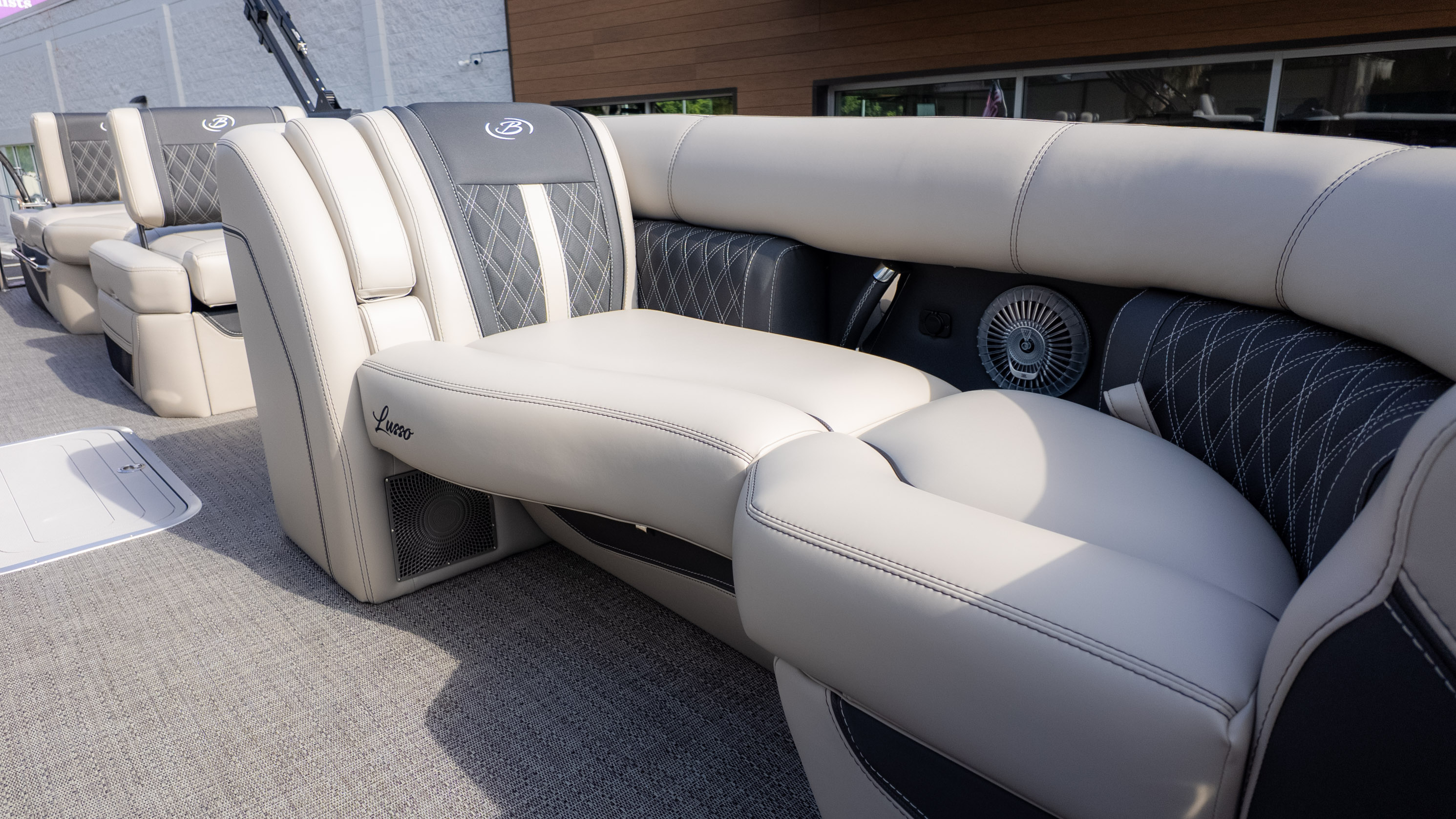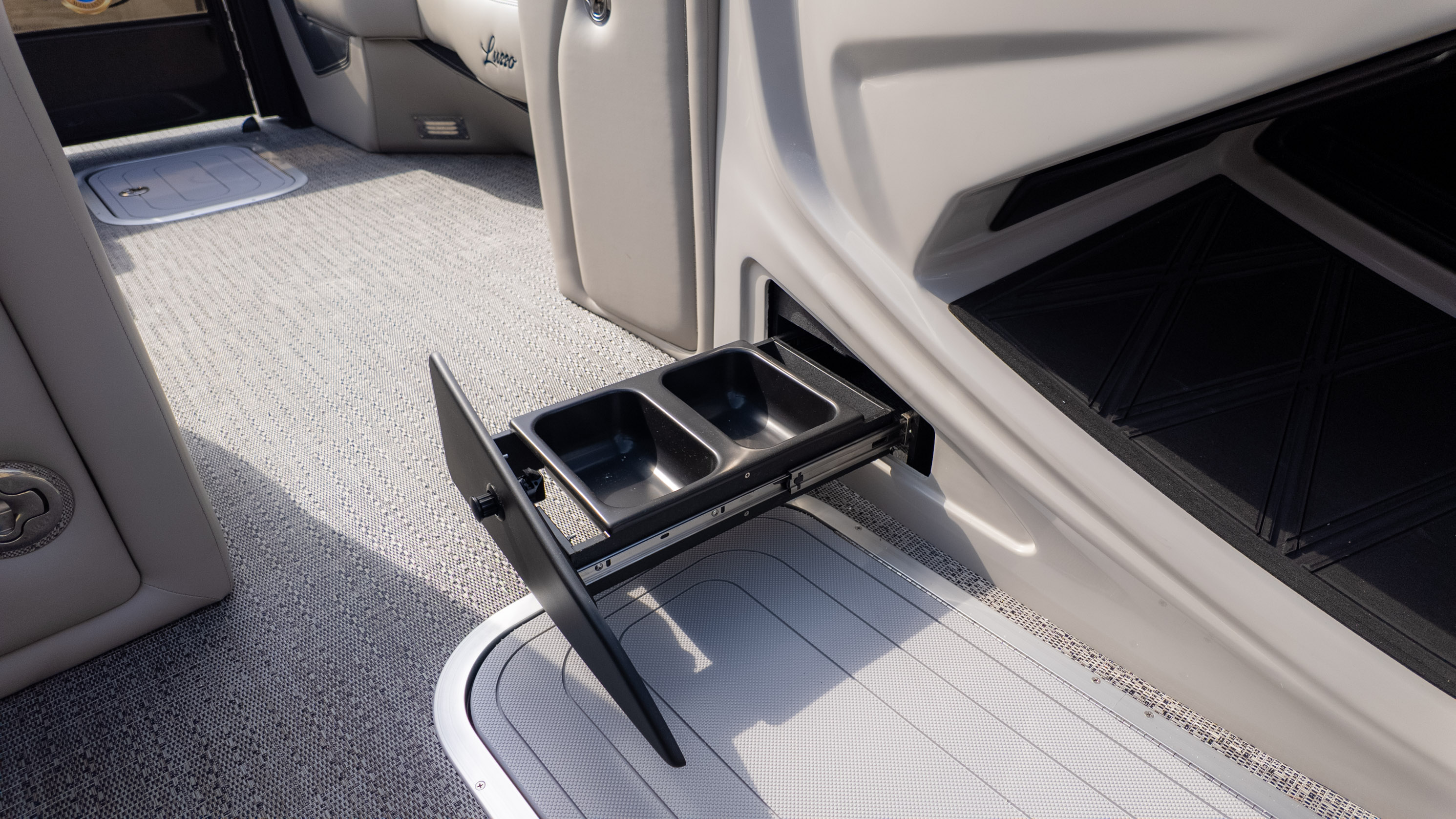 Imagine cruising with up to 14 of your closest friends and family , with plenty of space to stretch out on the Marquesan Gray with Onyx furniture. The Mid-Lounge offers multi-position stern lounging with USB ports and Yeti-ready cupholders, ensuring everyone stays refreshed and connected. Plus, integrated pet food and water dishes mean your furry companions can join the adventure too!