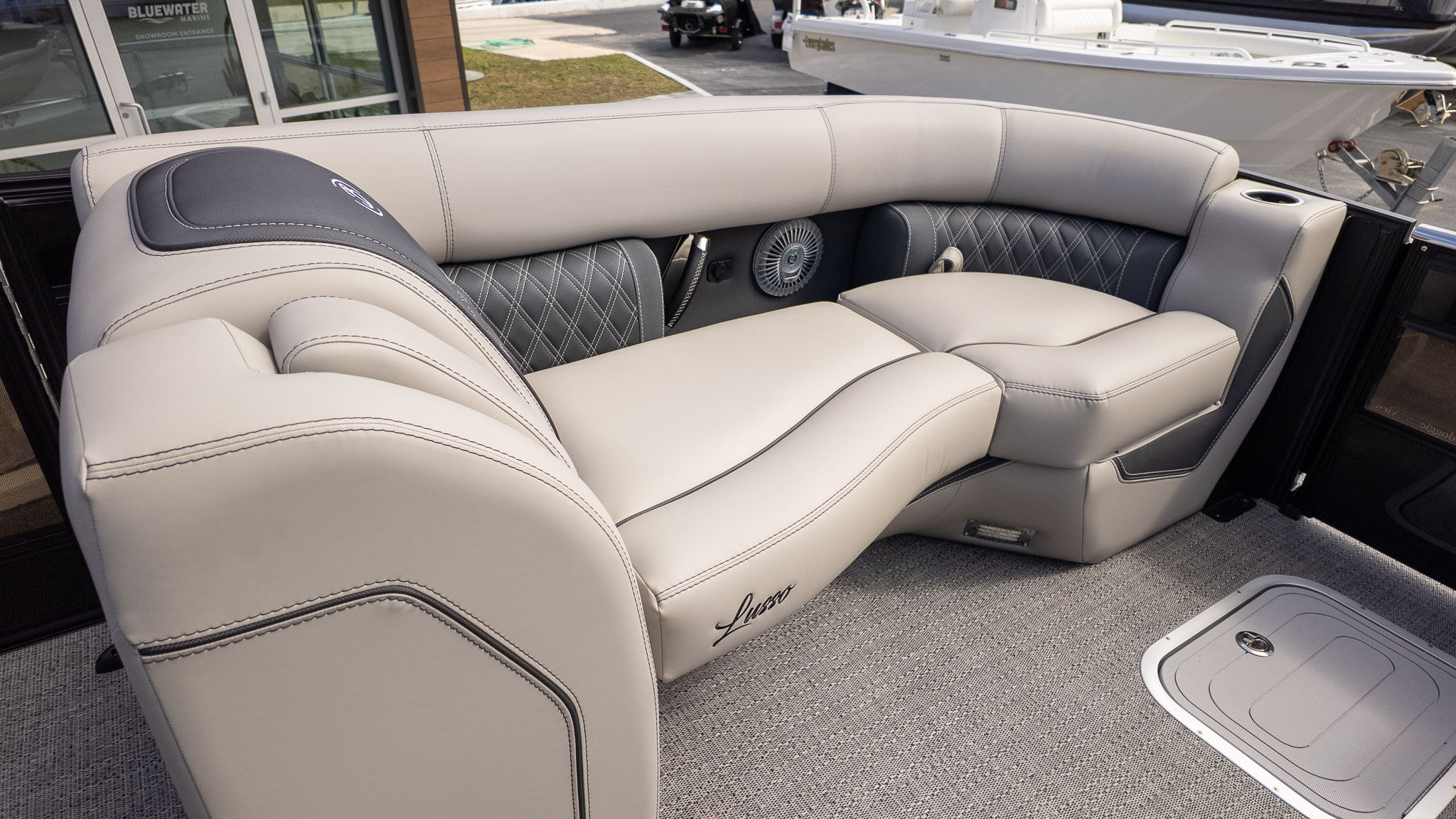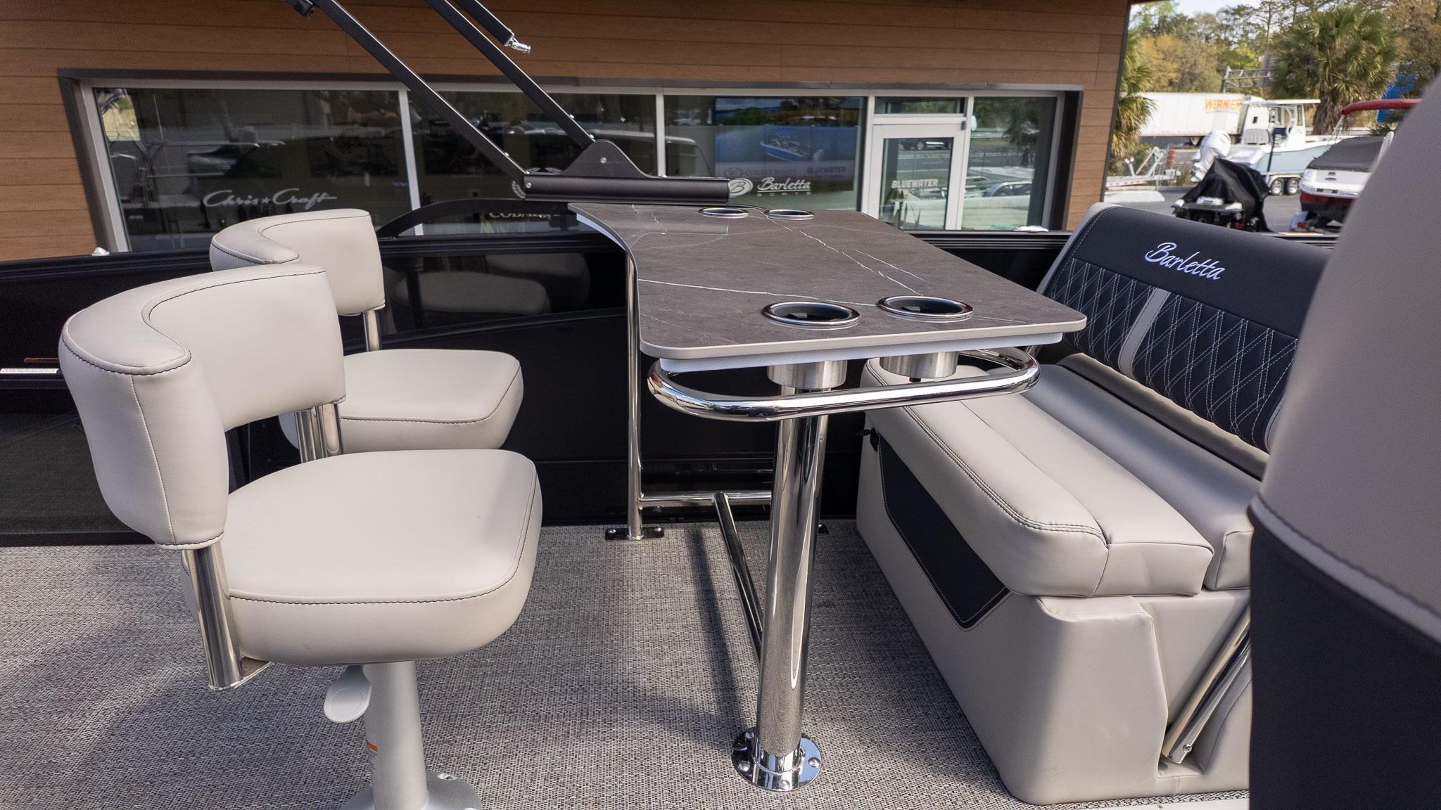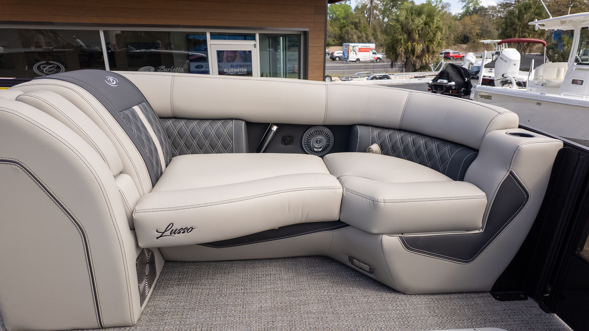 If you’re the designated host of your social circle, the Barletta Lusso L25UE is your new floating headquarters. This isn’t just a boat; it’s a high-end lakeside lounge designed for those who believe the best days are spent surrounded by friends, family, and a constant stream of cold drinks. The standout "Ultra-Entertainer" layout features a versatile high-top bar table complete with upholstered swivel stools, creating the perfect mid-ship hub for serving snacks or a round of sunset cocktails.