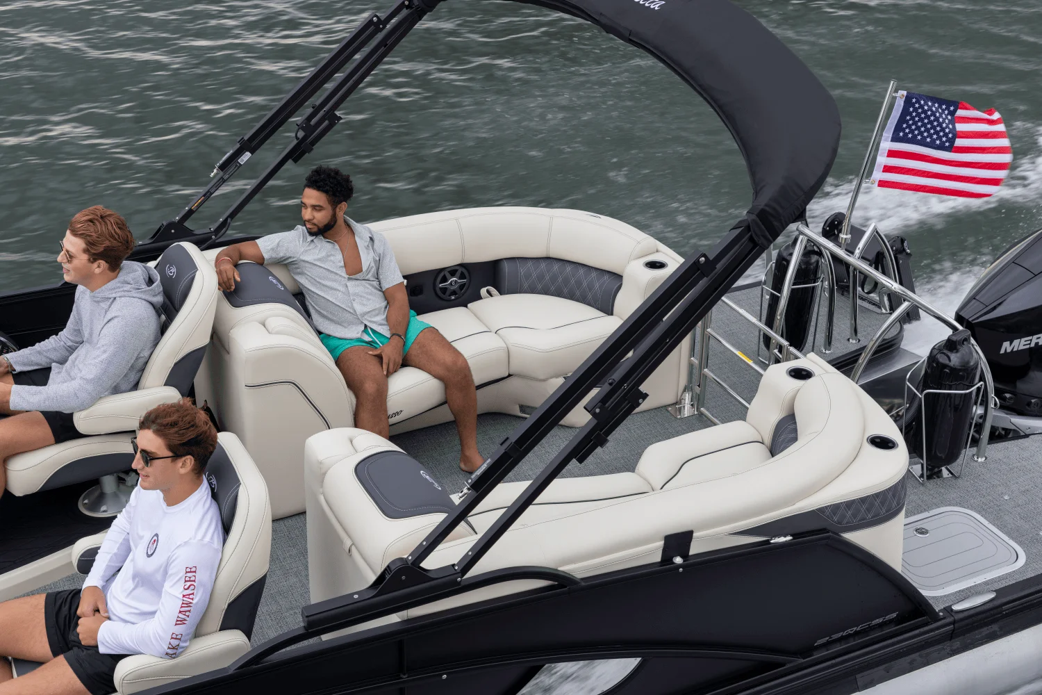 Is the Lusso right for you? Designed wth you and your on-water experience in mind, the Barletta Lusso models offer something for everyone. A classic and Stylish Rail-set, Ultra-soft and Ultra-Comfortable furniture, a sleek helm loaded with technology and leg-room, pet friendly amenities... the list goes on and on. Take a look and see why the Barletta L-class pontoon boat just might be the perfect choice for you and your family. Do you have a large crew that demands lots of seating? The quad-lounge is the layout for those who want to spread out and relax on the ultra-comfy Barletta chaise lounges. The way furniture wraps around the perimeter of the boat is also great for keeping curious kiddos and pets inside the boat while underway.