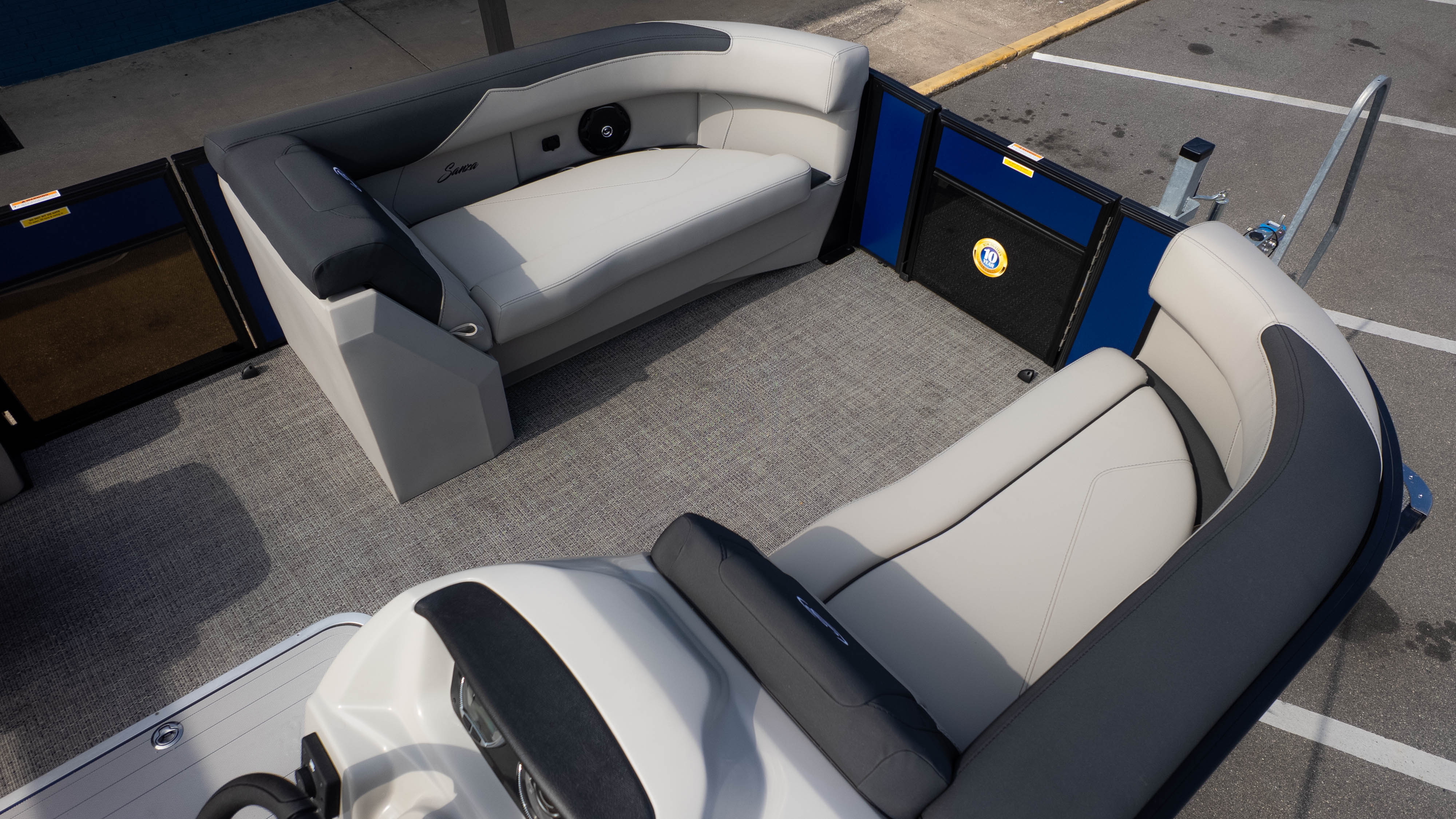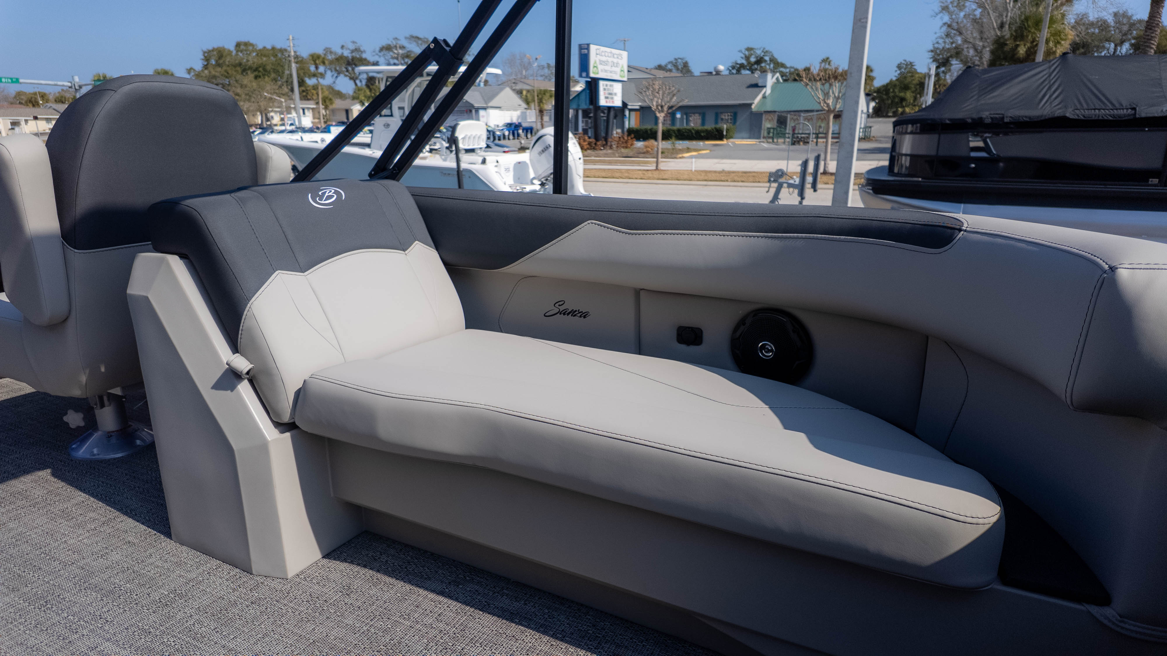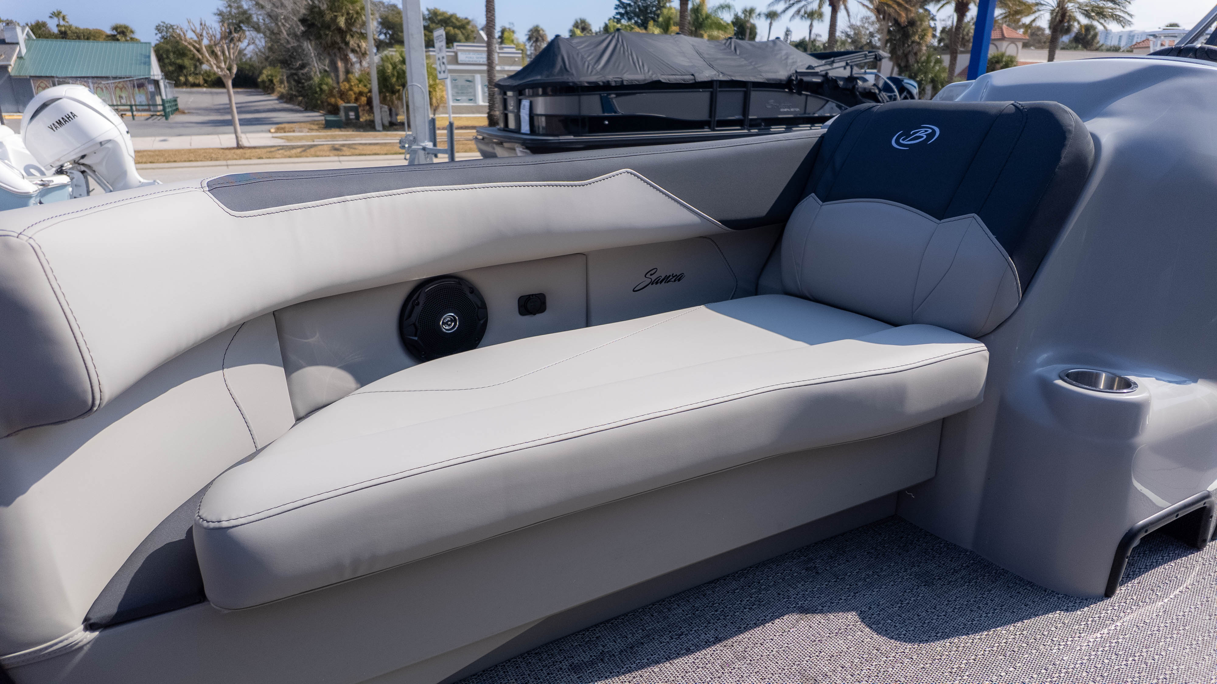 Pet lovers will particularly adore the thoughtful "doggie-dock" view—a see-through acrylic gate that lets your four-legged co-captains keep an eye on the water—along with integrated pet dishes tucked neatly into the helm. When it’s time to pick up the pace, the Triple Toon Package and Mercury 150L Four Stroke engine transform this elegant lounge into a performance machine. Thanks to signature V.I.P. Technology, the ride remains whisper-quiet and rattle-free, even as you slice through the chop. From the bohemian blue rails to the deep, "Yeti-ready" cupholders found at every turn, the Sanza S22QC ensures that the only thing more refreshing than the water is the experience of being on it.