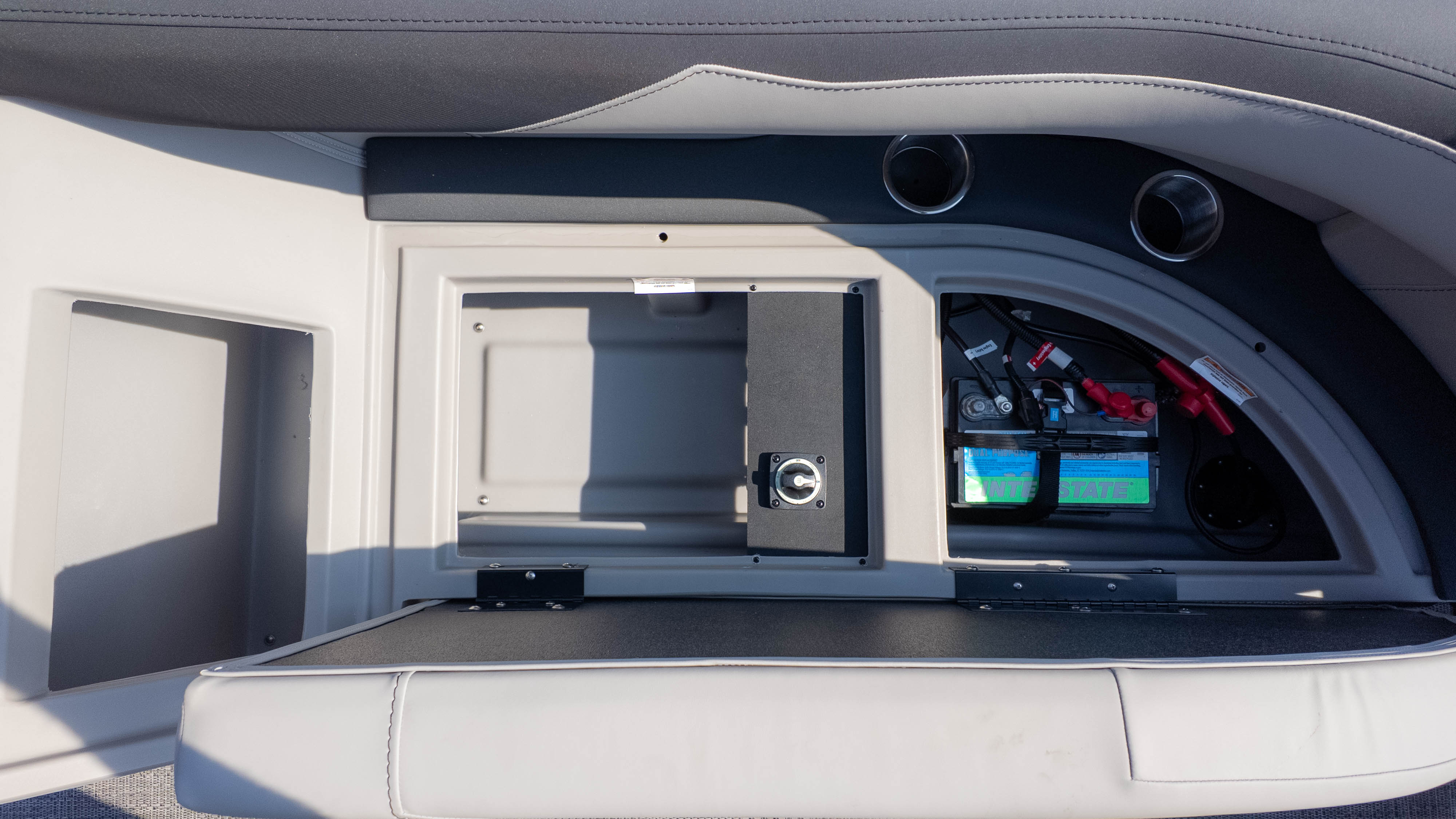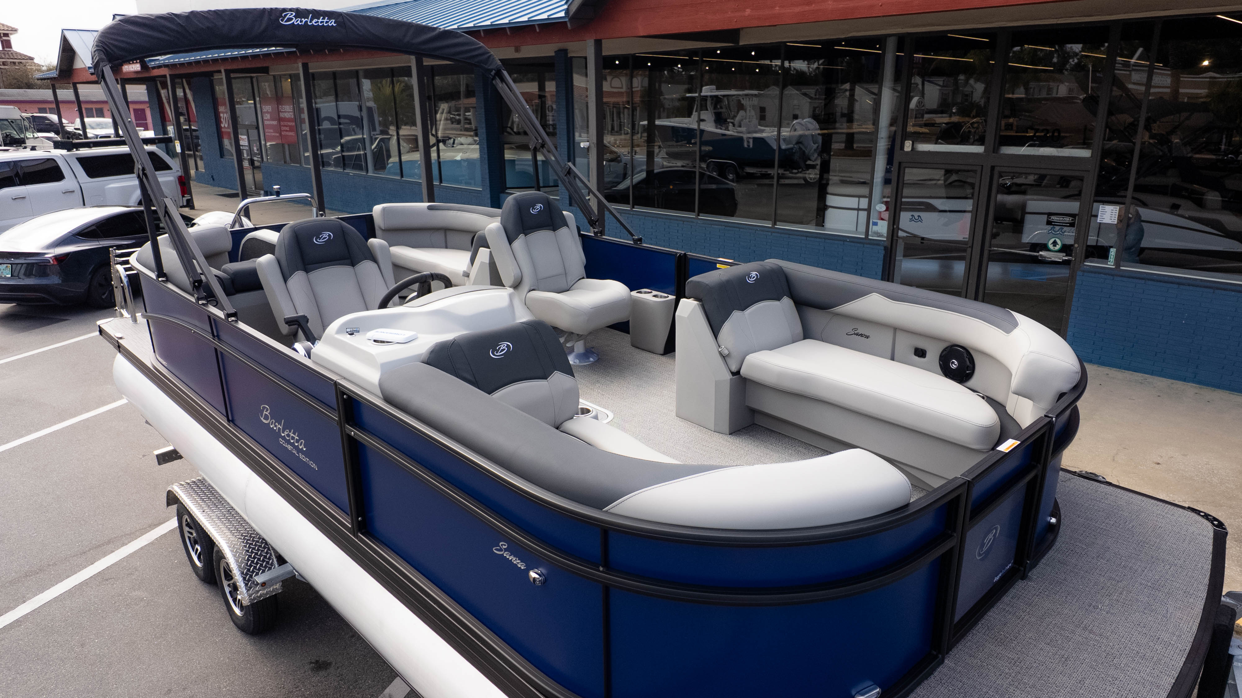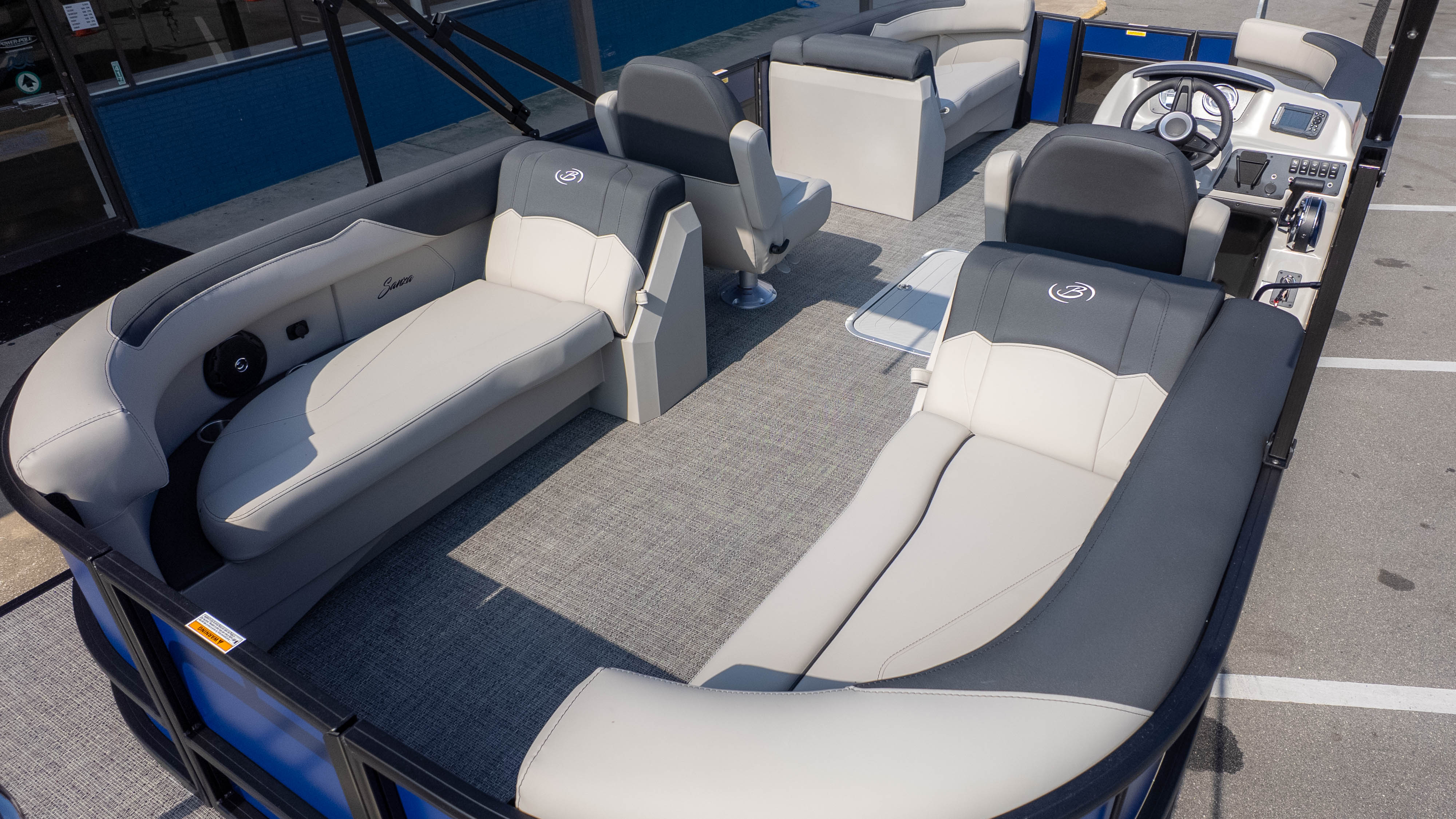 Pet lovers will particularly adore the thoughtful "doggie-dock" view—a see-through acrylic gate that lets your four-legged co-captains keep an eye on the water—along with integrated pet dishes tucked neatly into the helm. When it’s time to pick up the pace, the Triple Toon Package and Mercury 150L Four Stroke engine transform this elegant lounge into a performance machine. Thanks to signature V.I.P. Technology, the ride remains whisper-quiet and rattle-free, even as you slice through the chop. From the bohemian blue rails to the deep, "Yeti-ready" cupholders found at every turn, the Sanza S22QC ensures that the only thing more refreshing than the water is the experience of being on it.