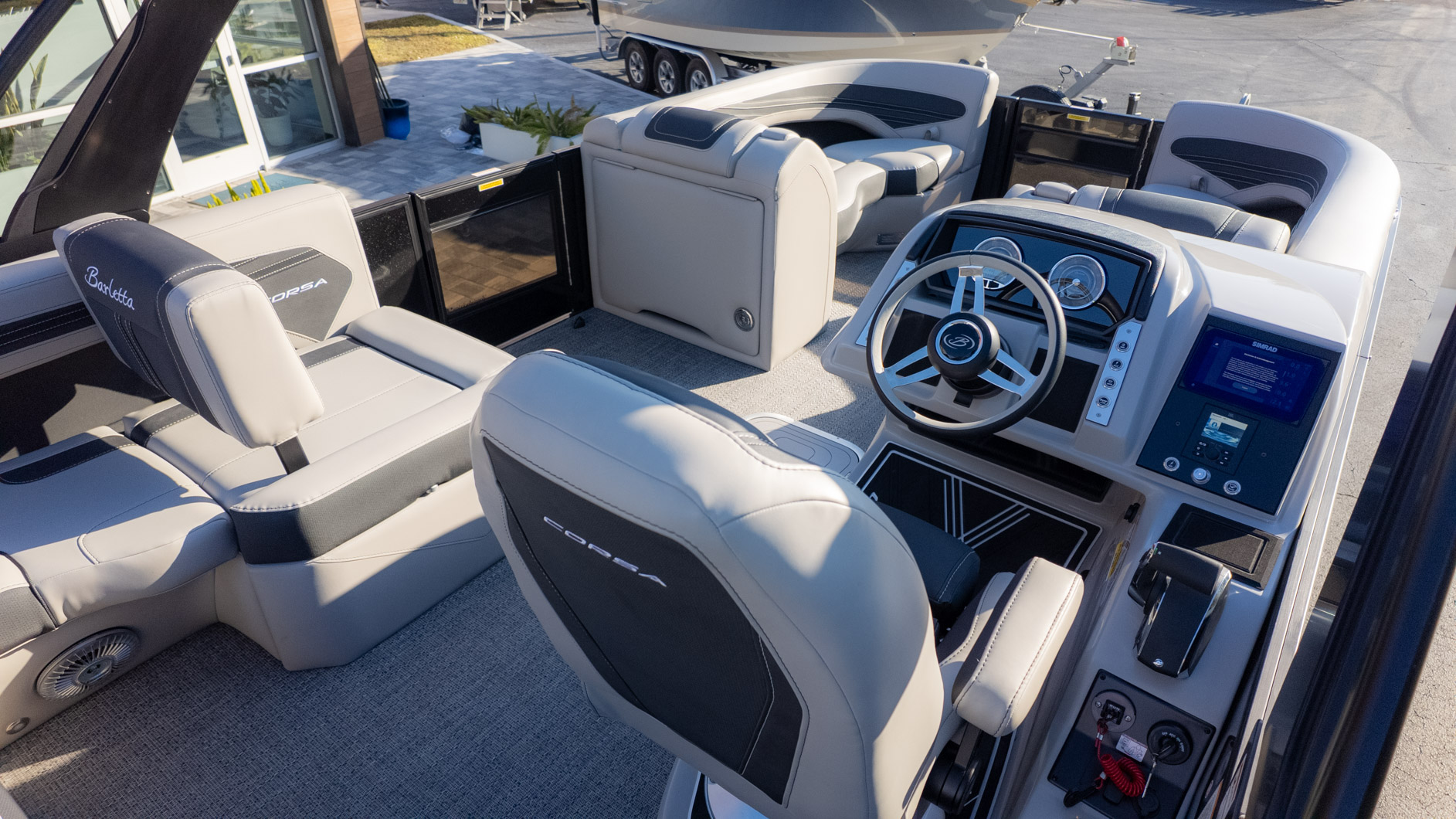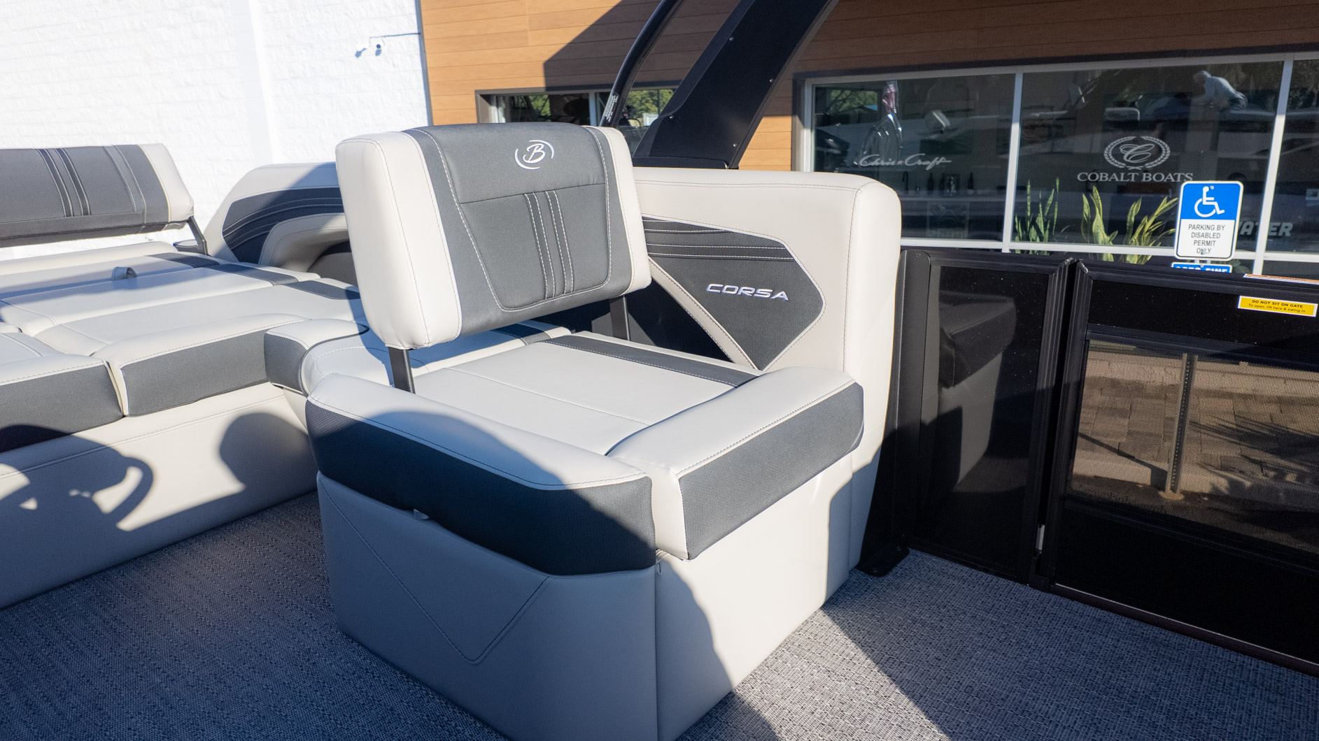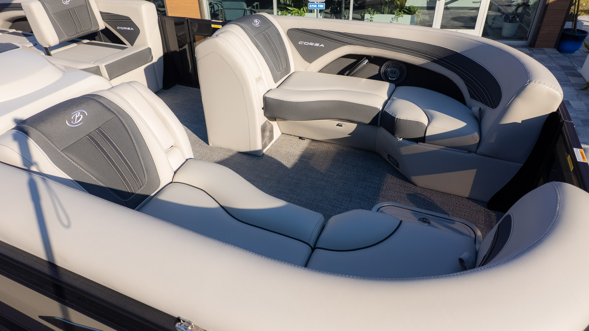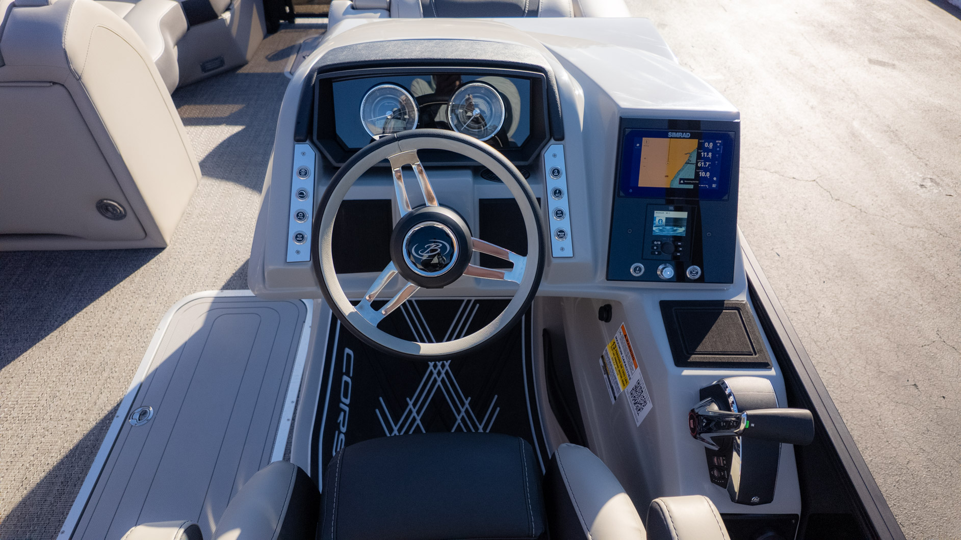 This Corsa is designed for the social, style-conscious boater with a penchant for high performance. It features a fierce Mercury 300HP Verado V8 engine and the triple-toon package with two-stage lifting strakes for a silky smooth, confident handling that will leave the chop behind.