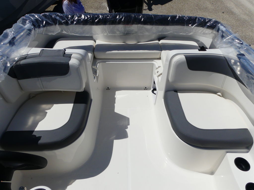 Inside, you’ll find a surprisingly spacious, deck boat-inspired layout with comfortable seating throughout. The open bow and wide beam create an inviting space for relaxing, entertaining, or enjoying a day in the sun. Ample storage compartments make it easy to bring along everything you need for sandbar trips, cruising, or family outings.