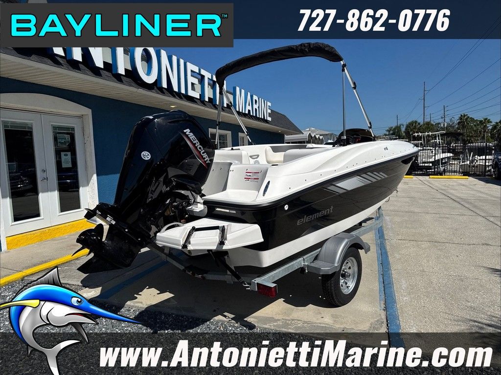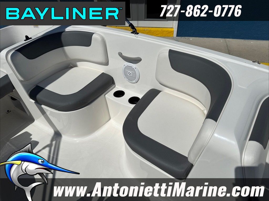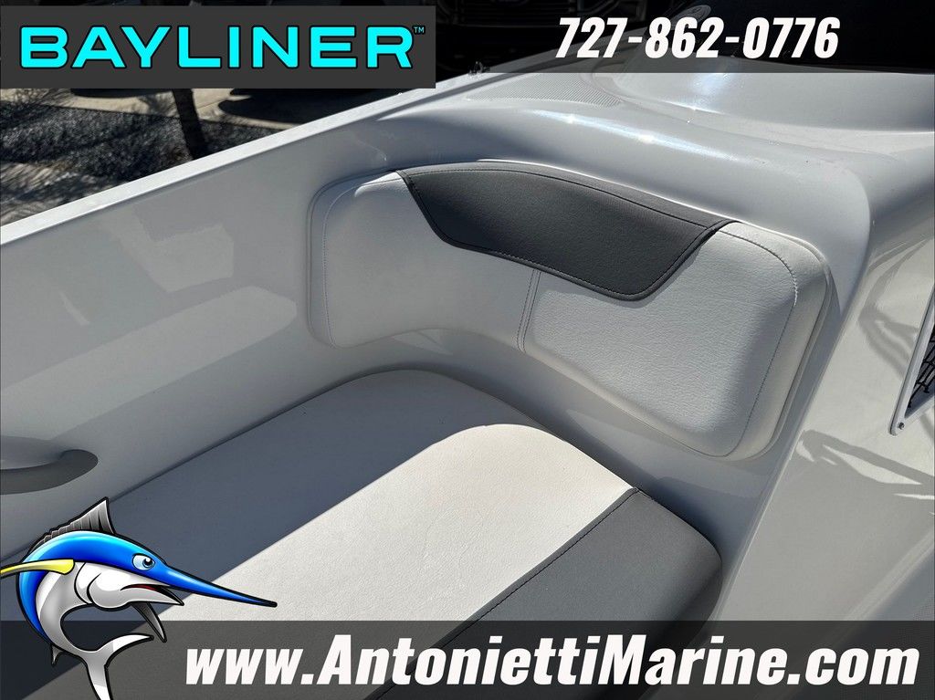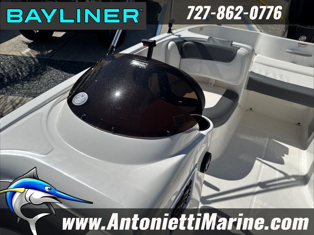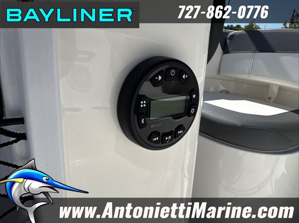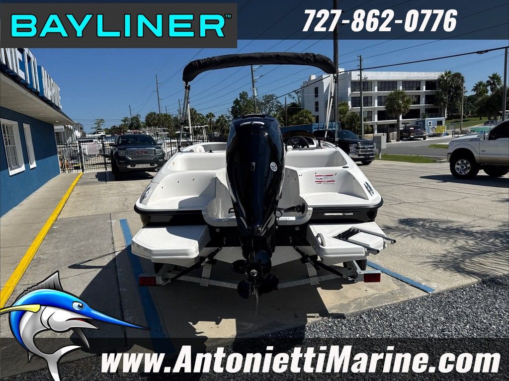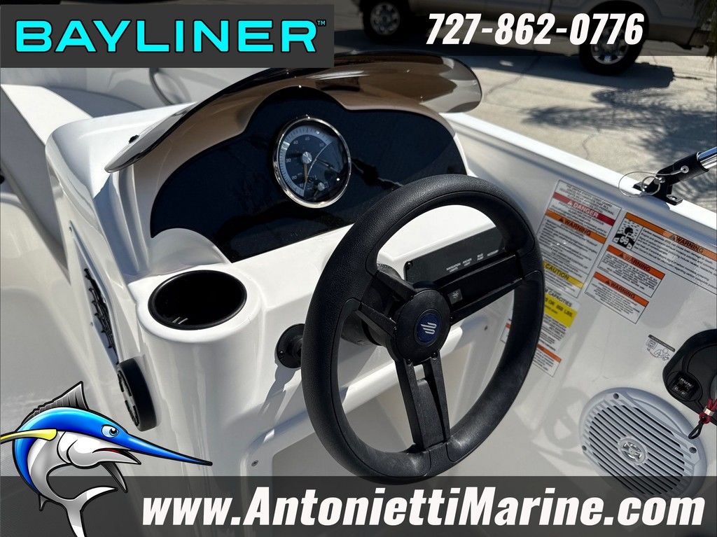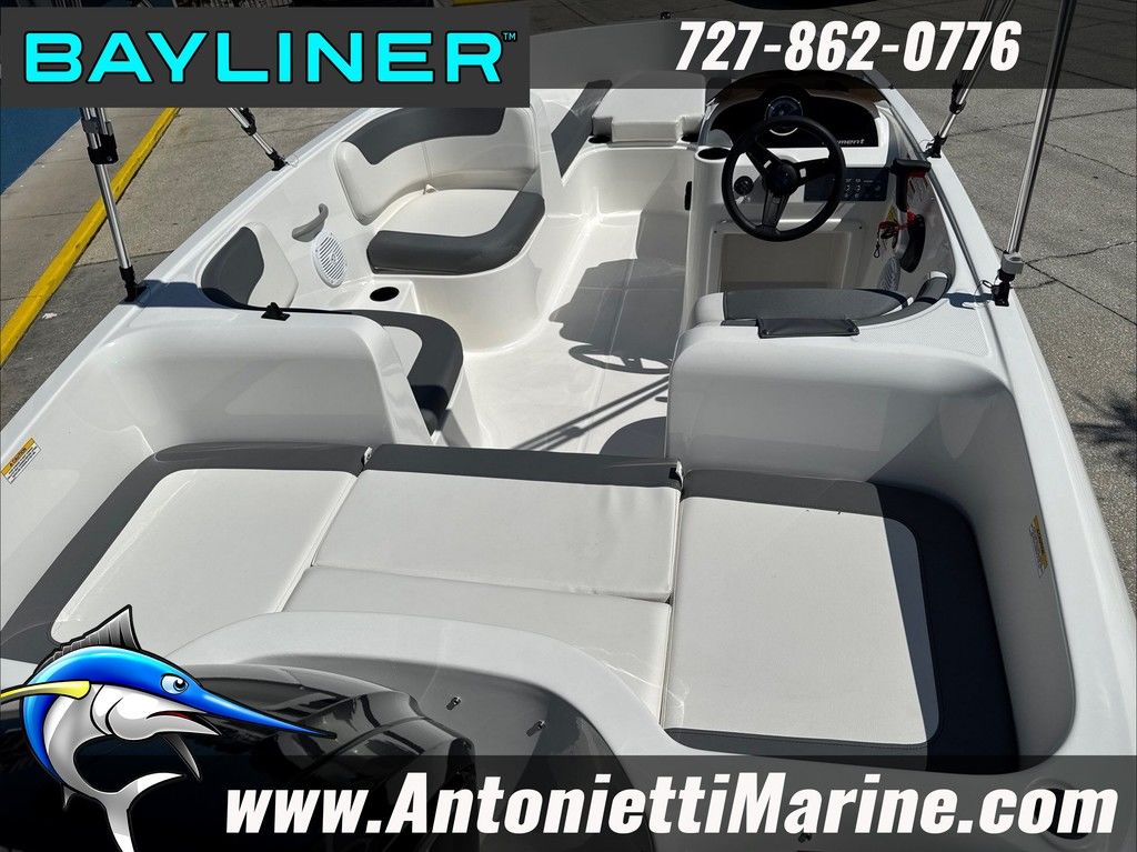 The Bayliner E16's Convenience Package includes a Bimini with a 6’ top and boot, snap-on bow well and cockpit cover, and a waterproof 120-watt AM/FM stereo with MP3 capability—everything you need for comfort, protection, and entertainment on the water!