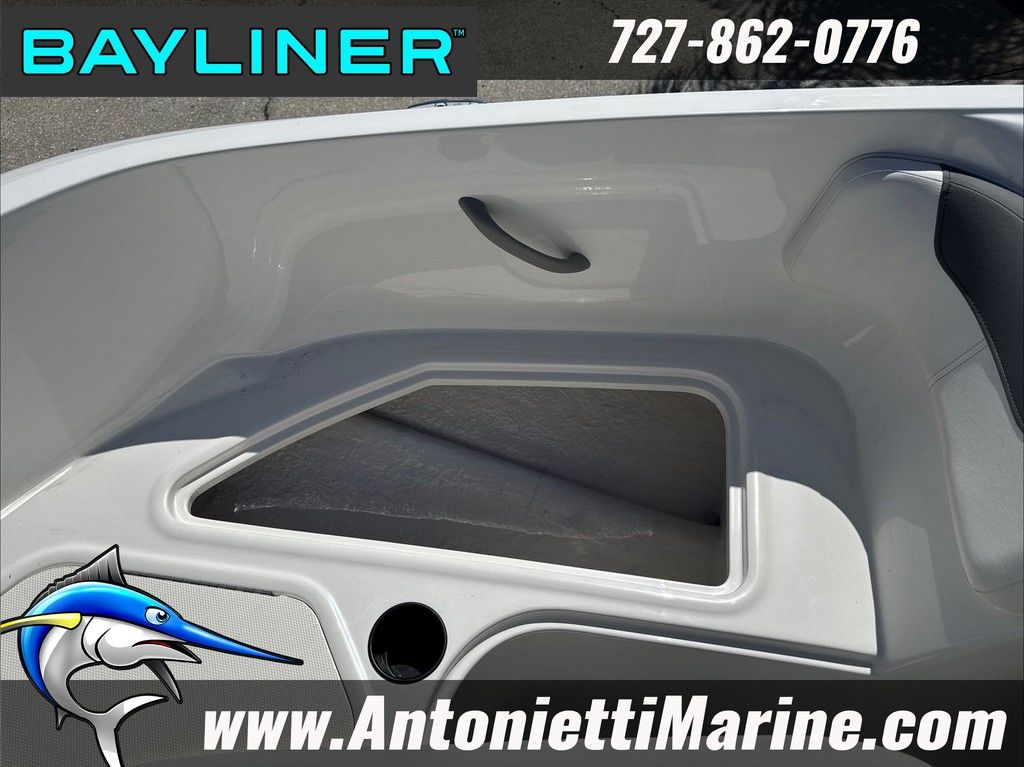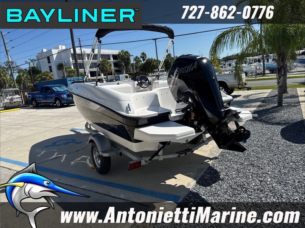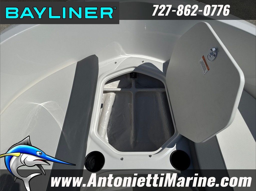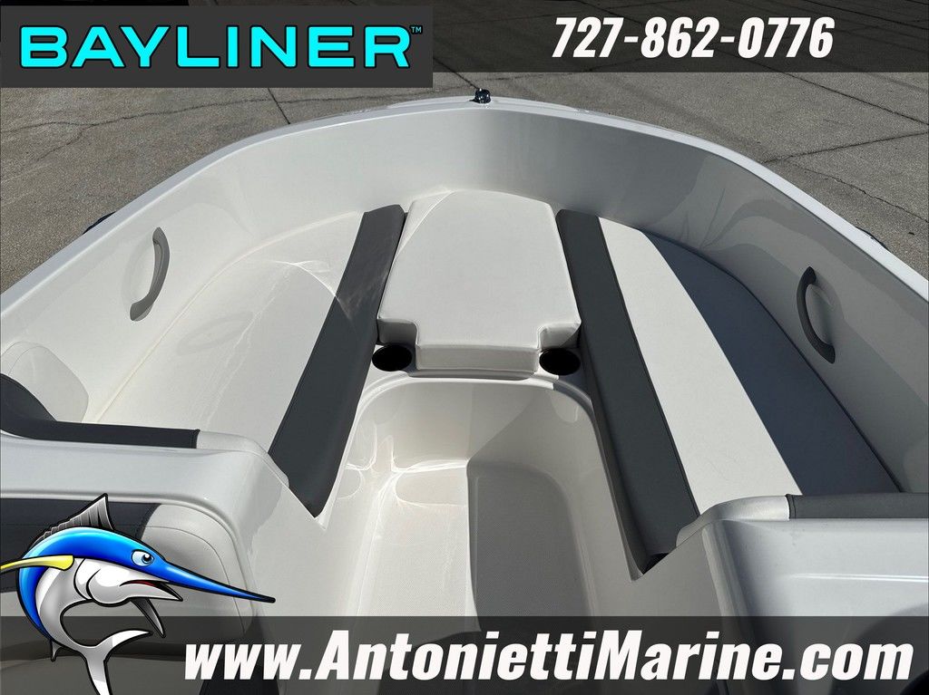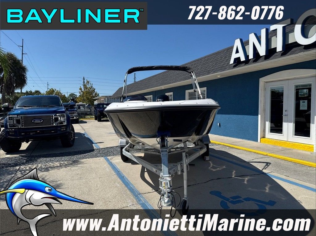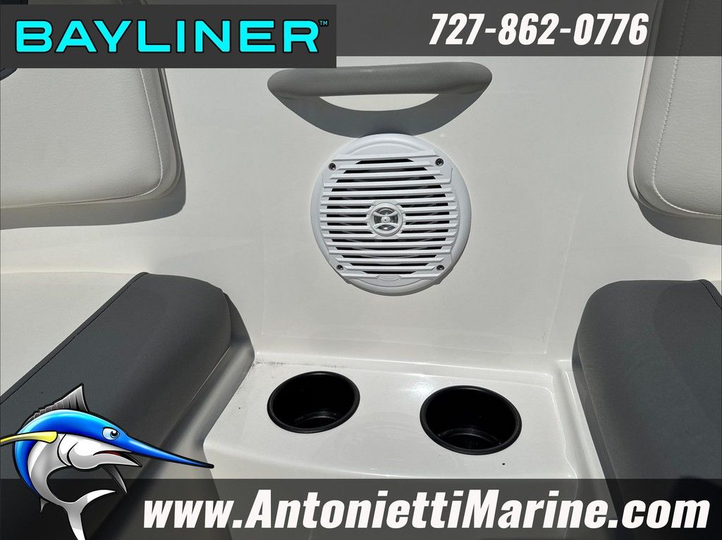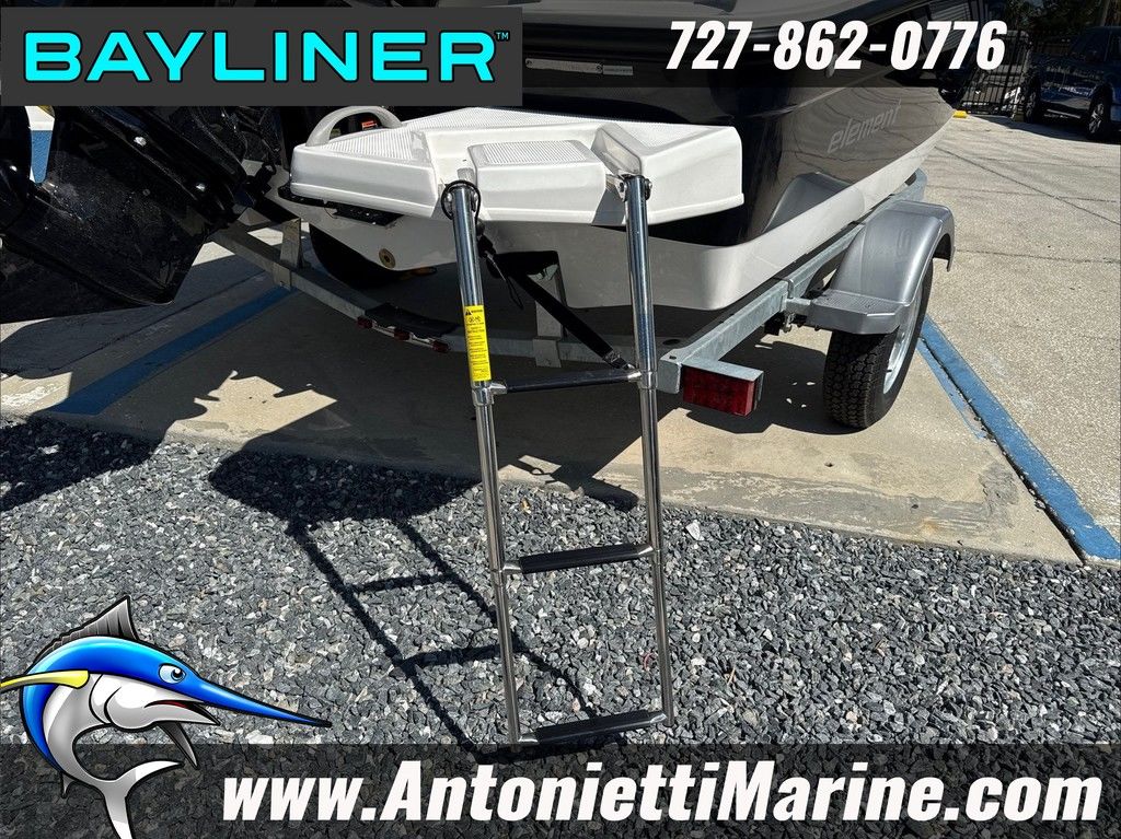 The Bayliner E16's Convenience Package includes a Bimini with a 6’ top and boot, snap-on bow well and cockpit cover, and a waterproof 120-watt AM/FM stereo with MP3 capability—everything you need for comfort, protection, and entertainment on the water!