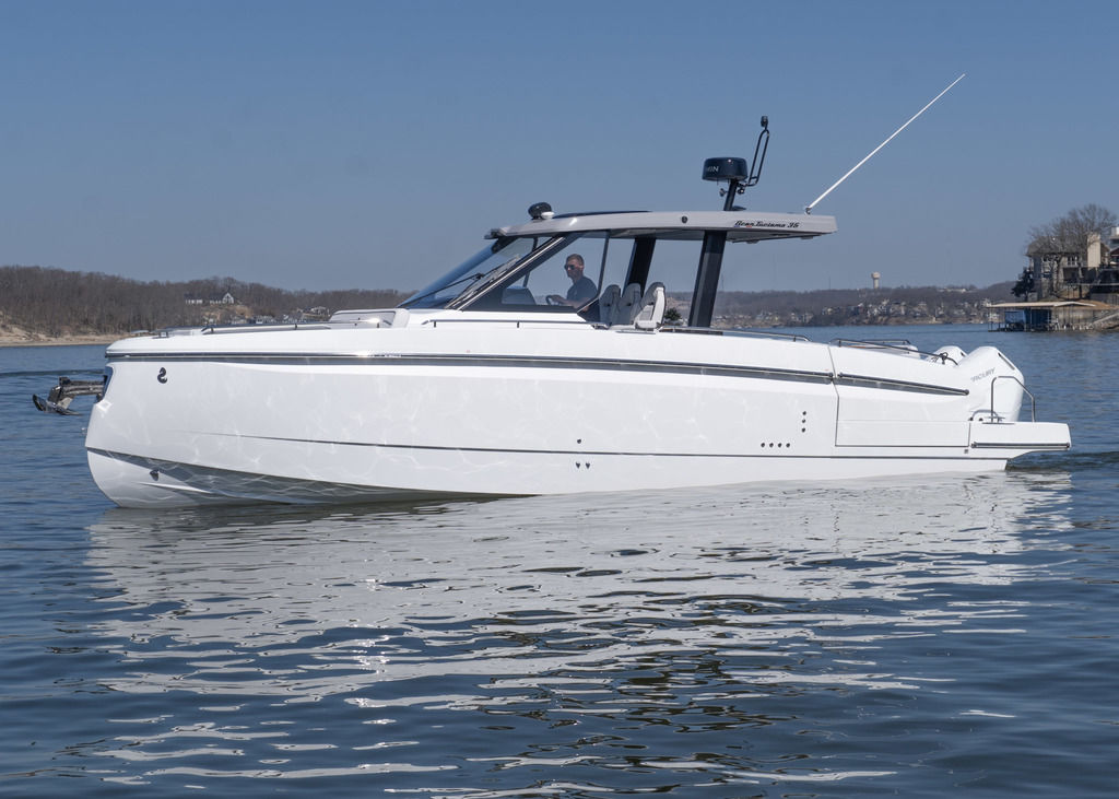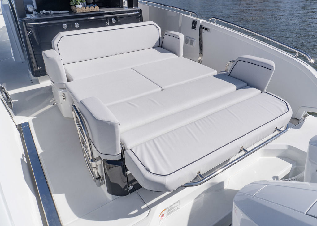 The Gran Turismo 35 is your gateway to new adventures on the water, with a zero-compromise approach to performance, comfort, and style. Offering the latest and greatest of naval architecture and ergonomics, this beautiful cruiser also benefits from the brand’s 140-year history, delivering an ownership experience that is simply second to none. The Gran Turismo 35 stands out with its ultramodern hull and signature light blades, perfectly balancing capability with timeless style. Inspired by villa-style living, the modular cockpit layout offers a versatile space that is ideal for entertaining, relaxing, or a high-speed run towards the horizon. Hinge-down balconies expand the aft deck, enhancing your connection to the water, while convertible seating areas transform into expansive sun pads, providing a perfect outdoor retreat. Whether you're cruising at full throttle or hosting guests at the dock, the Gran Turismo 35 redefines the boating experience with a seamless integration into its natural surroundings.