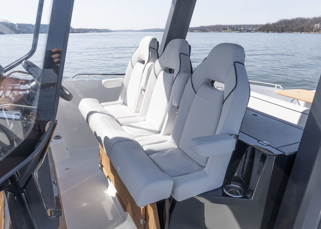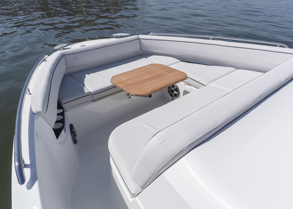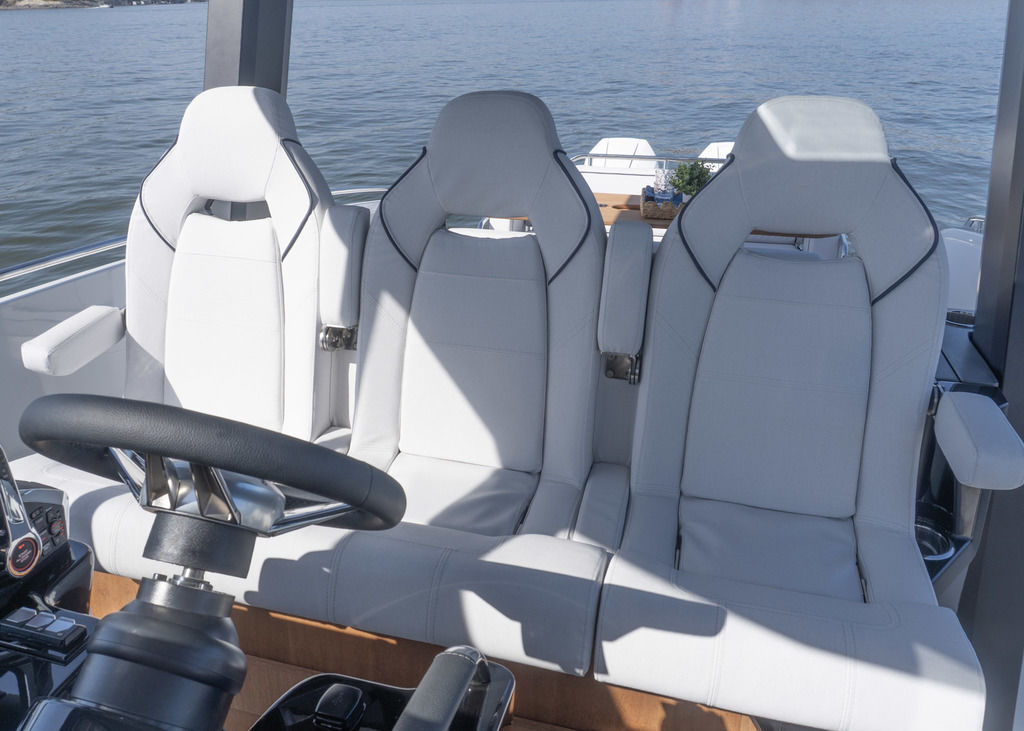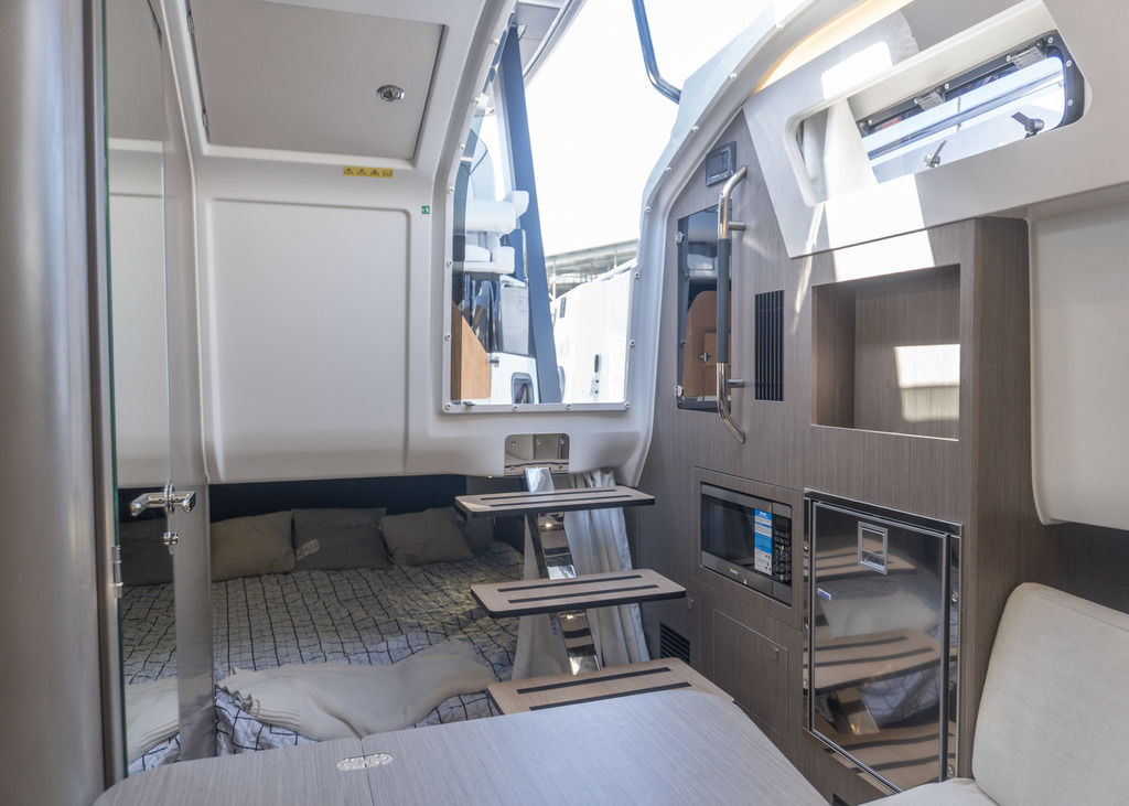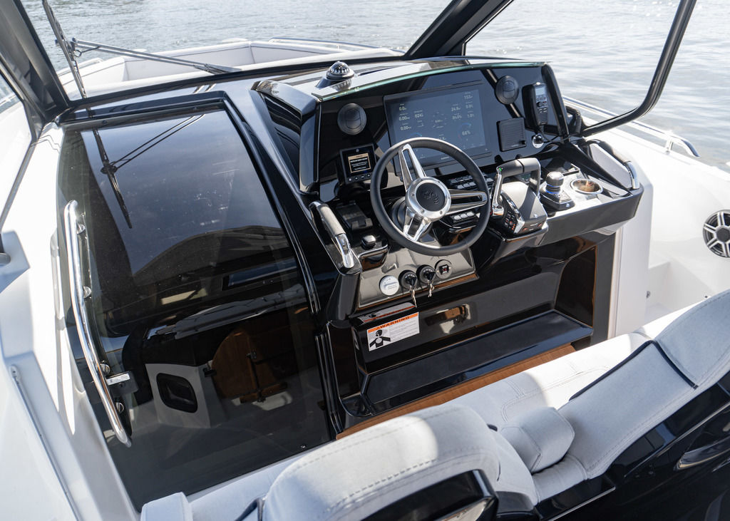With light wood finishes, abundant light and modern design elements, the Gran Turismo 35 interior is as beautiful as it is functional. The convertible forward berth provides both a comfortable lounge and a spacious double bed. A mid cabin with berth completes the interior with refinement. A voluminous fully enclosed head with shower and a well-equipped galley make it perfect for weekend escapes and overnight stays. With smart storage solutions, integrated lighting, and thoughtful details, the Gran Turismo 35 interior elevates your on-water living experience.