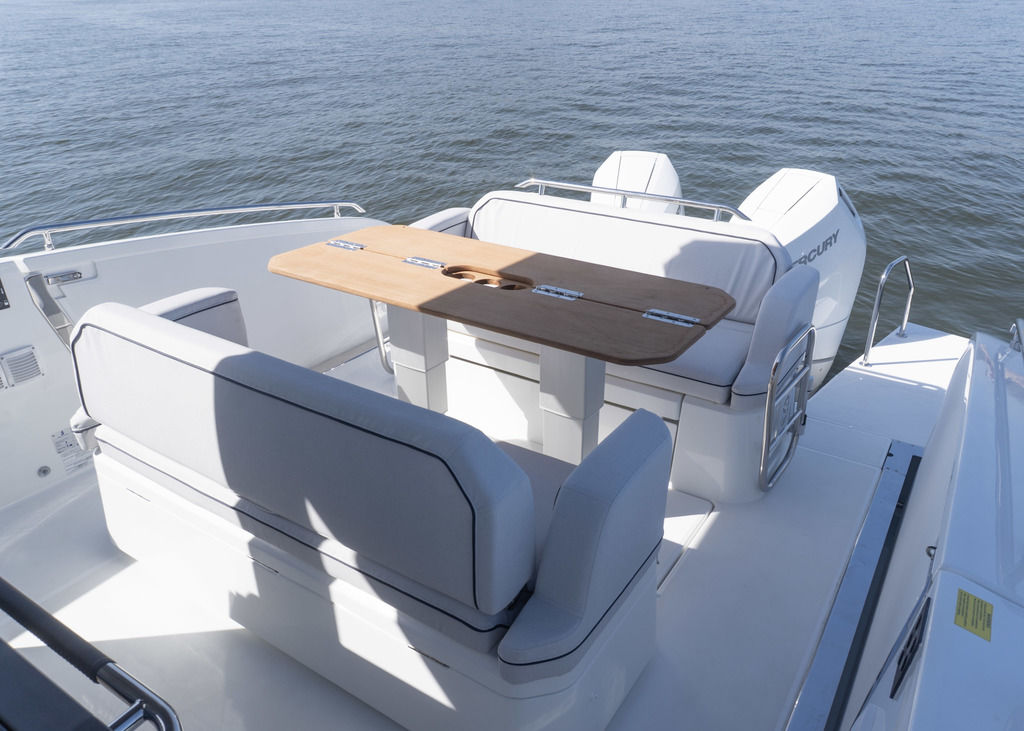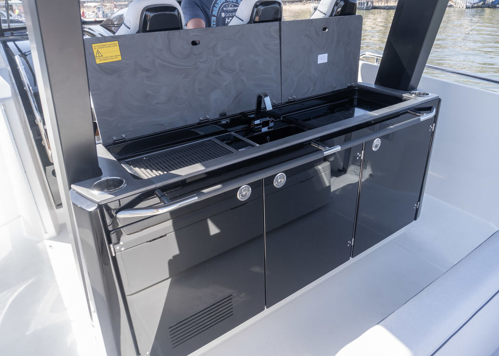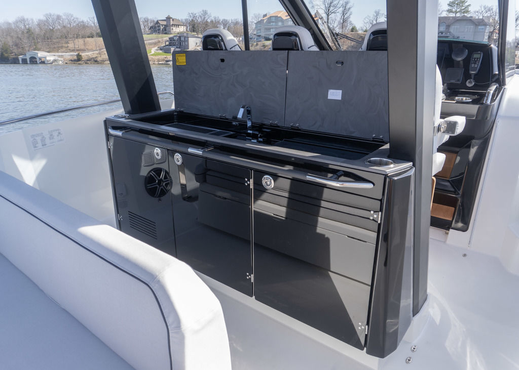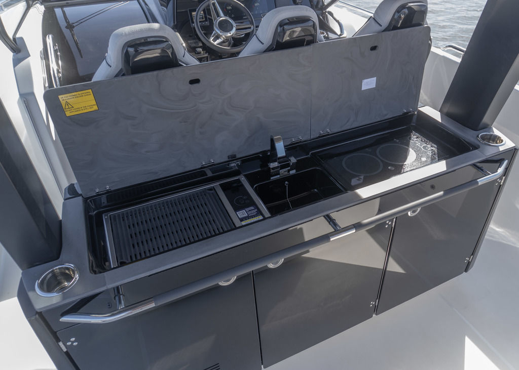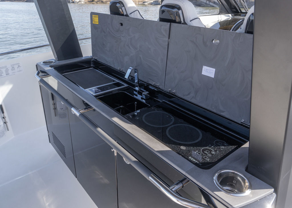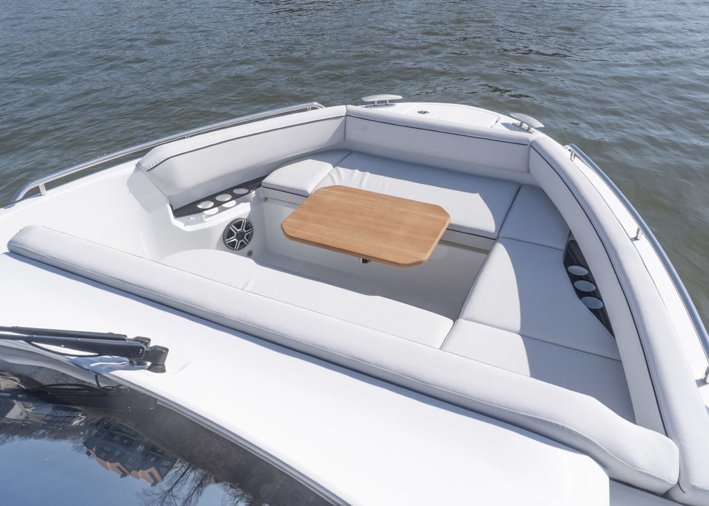 With light wood finishes, abundant light and modern design elements, the Gran Turismo 35 interior is as beautiful as it is functional. The convertible forward berth provides both a comfortable lounge and a spacious double bed. A mid cabin with berth completes the interior with refinement. A voluminous fully enclosed head with shower and a well-equipped galley make it perfect for weekend escapes and overnight stays. With smart storage solutions, integrated lighting, and thoughtful details, the Gran Turismo 35 interior elevates your on-water living experience.