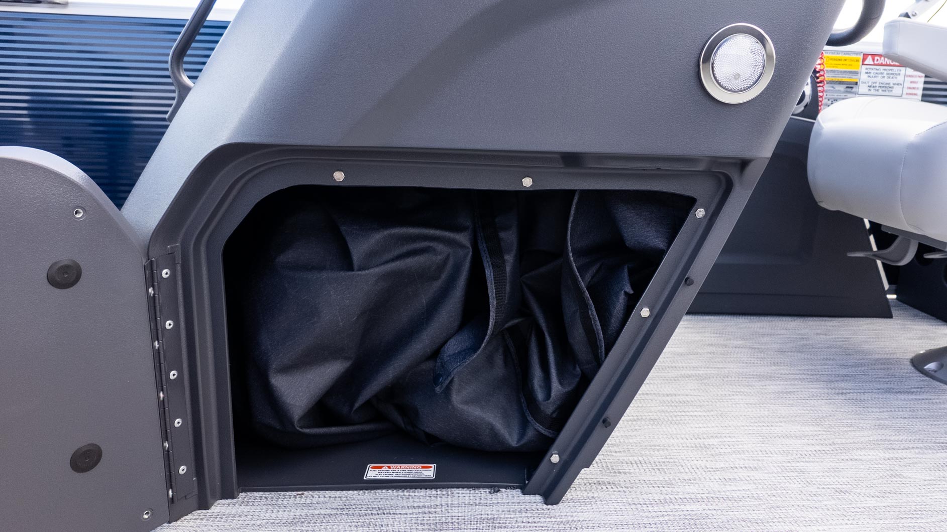 For the anglers, it’s paradise found: four dedicated fishing seats, a locking rod locker, and dual livewells mean business. But when the bite slows down, the vibe switches instantly to leisure. The spacious deck accommodates up to 10 guests, offering plenty of room to lounge on the furniture or gather around the kidney-shaped table.