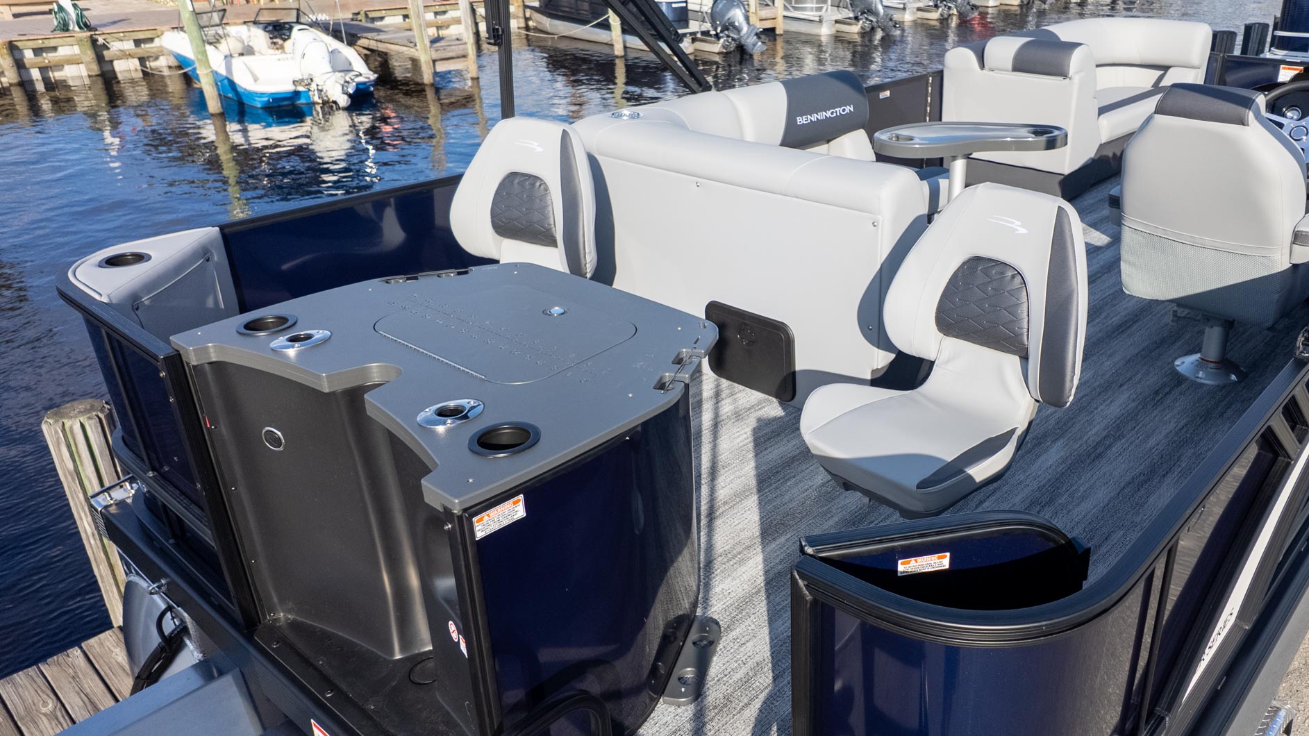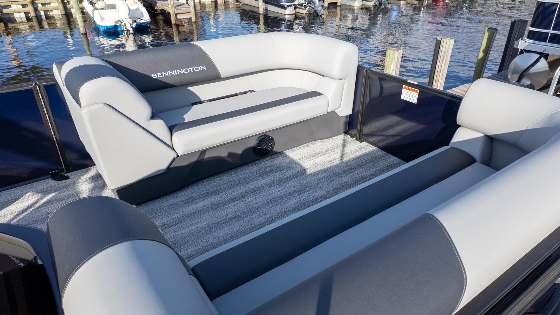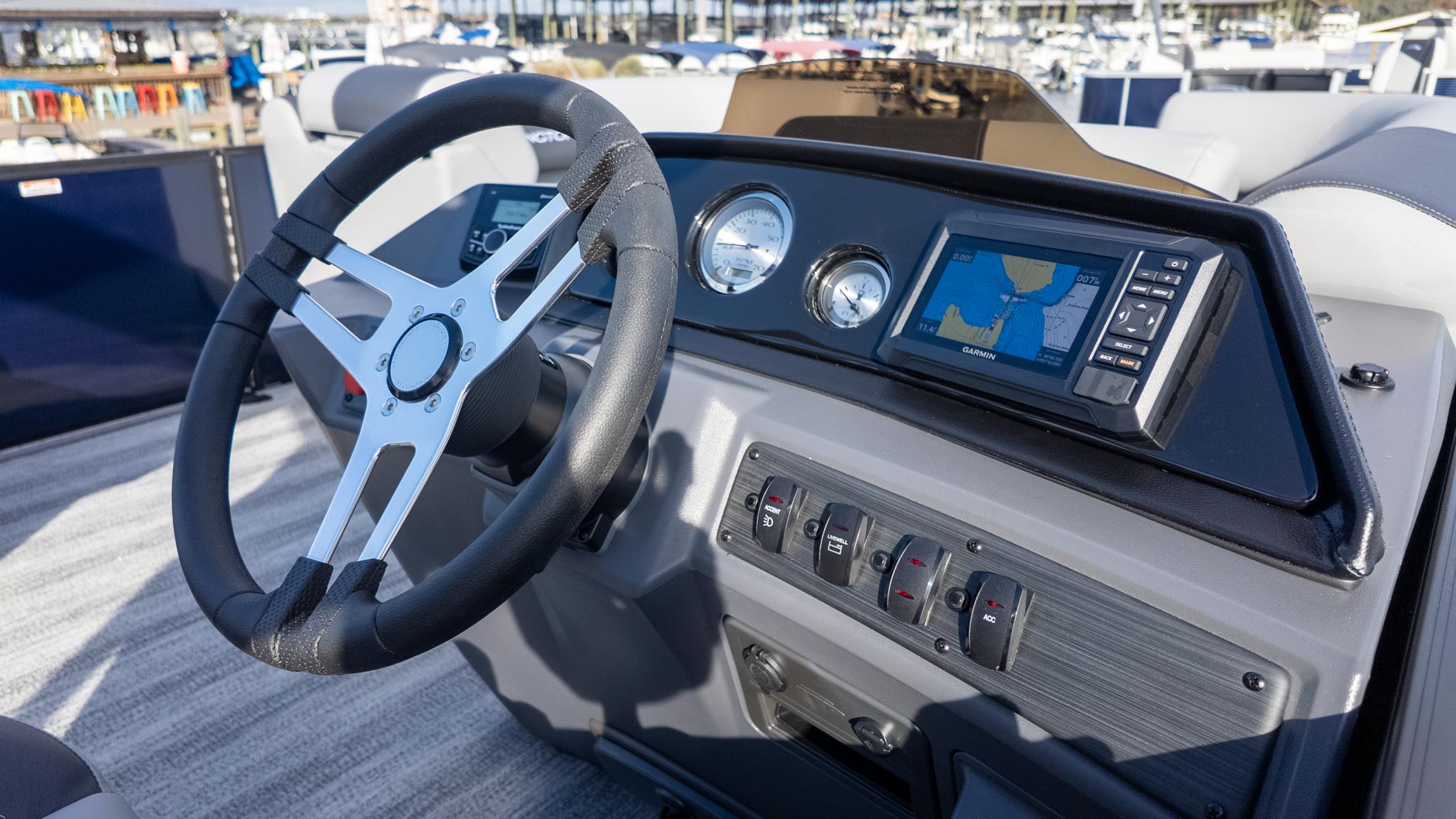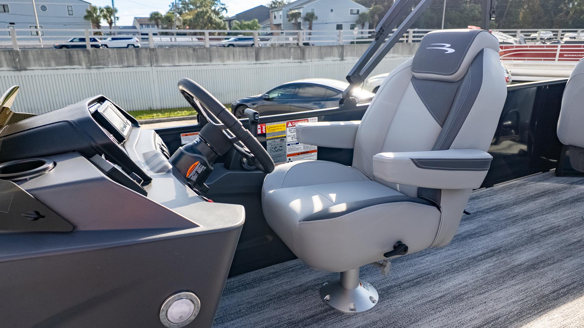 Business stays in the back with a dedicated pro-angler station featuring a center-mounted livewell, rod holders, and dual fishing seats perfect for tracking that early morning catch. But up front, it’s all about the party. A plush chaise lounge wrapped in Shadow Grey vinyl offers the perfect spot to soak up the sun, while the new Rockford Fosgate audio system provides the soundtrack.