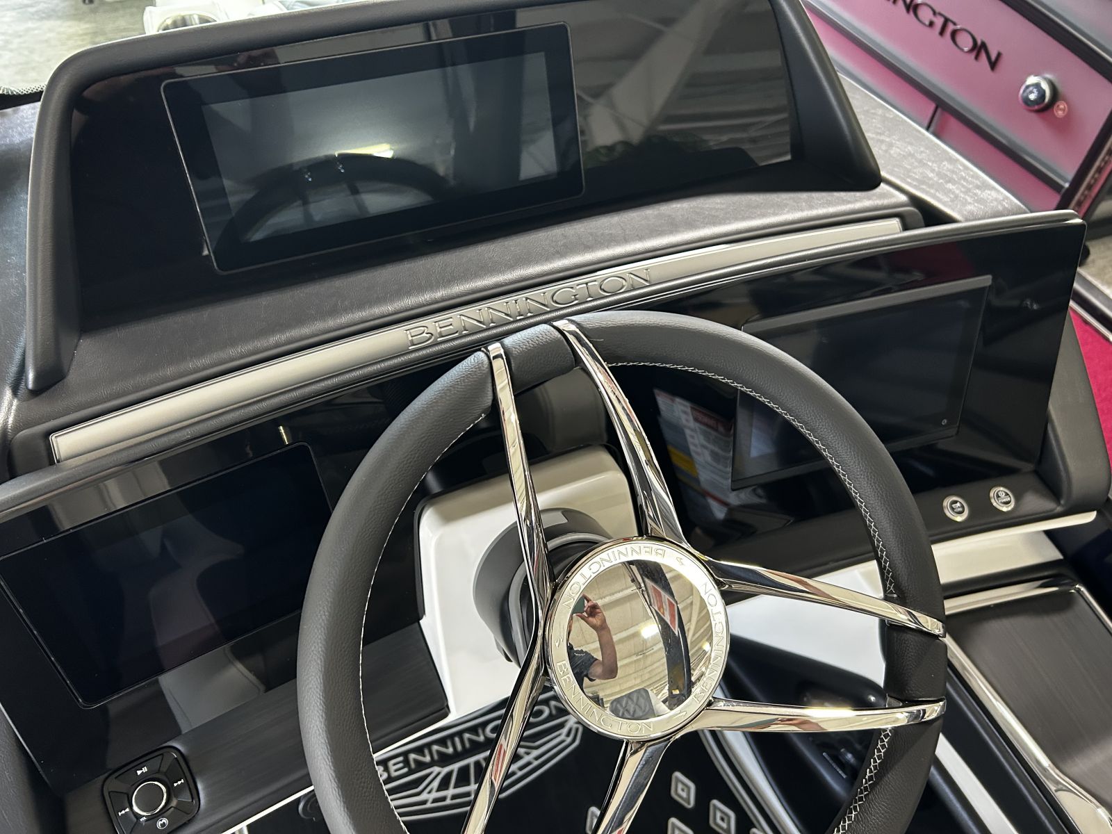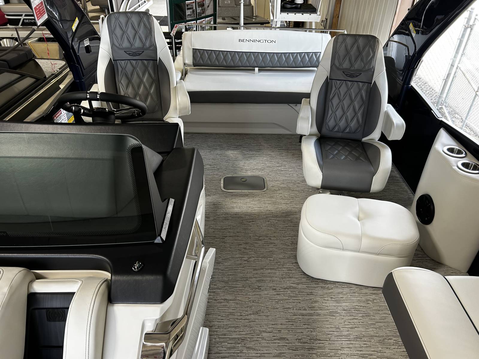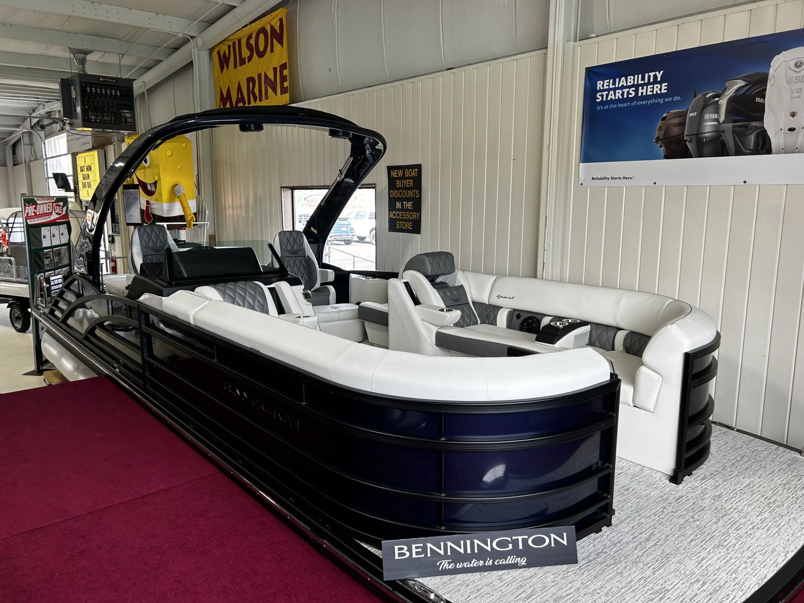 2026 Bennington 25 RSBA powered by a Yamaha F350XSA!Factory Installed Options:Exterior- smooth midnight blueInterior- pillowtop sport veneto white with perforated graphiteBlack canvasBlackout luxeCladded power archZebrawood matte slate trim accentValencia greyBlack corvina steering wheelLighted mesh logo on swing backLighted cupholdersExterior side lightsToe kick lightingOttomanAft/bow gate seat75" premium retractable keeper railDeluxe swing back queen reclinerMidnight blue embroidery packageStainless rub railPop up cleats bow & aftElliptical sport performance package 25ftFuel 73 galDual battery switchCenter storageGarmin 9 Vivid 12 Carbon displayMain display Vivid 12 Map54" removable aluminum ski pylon