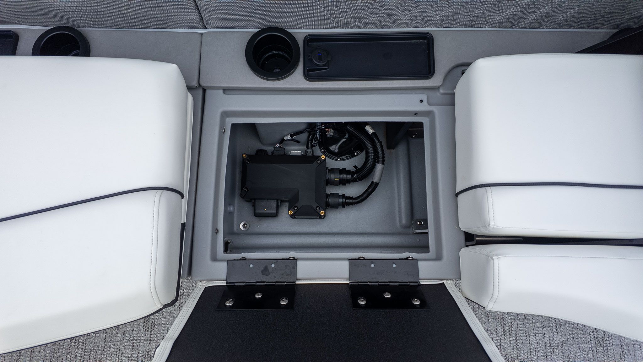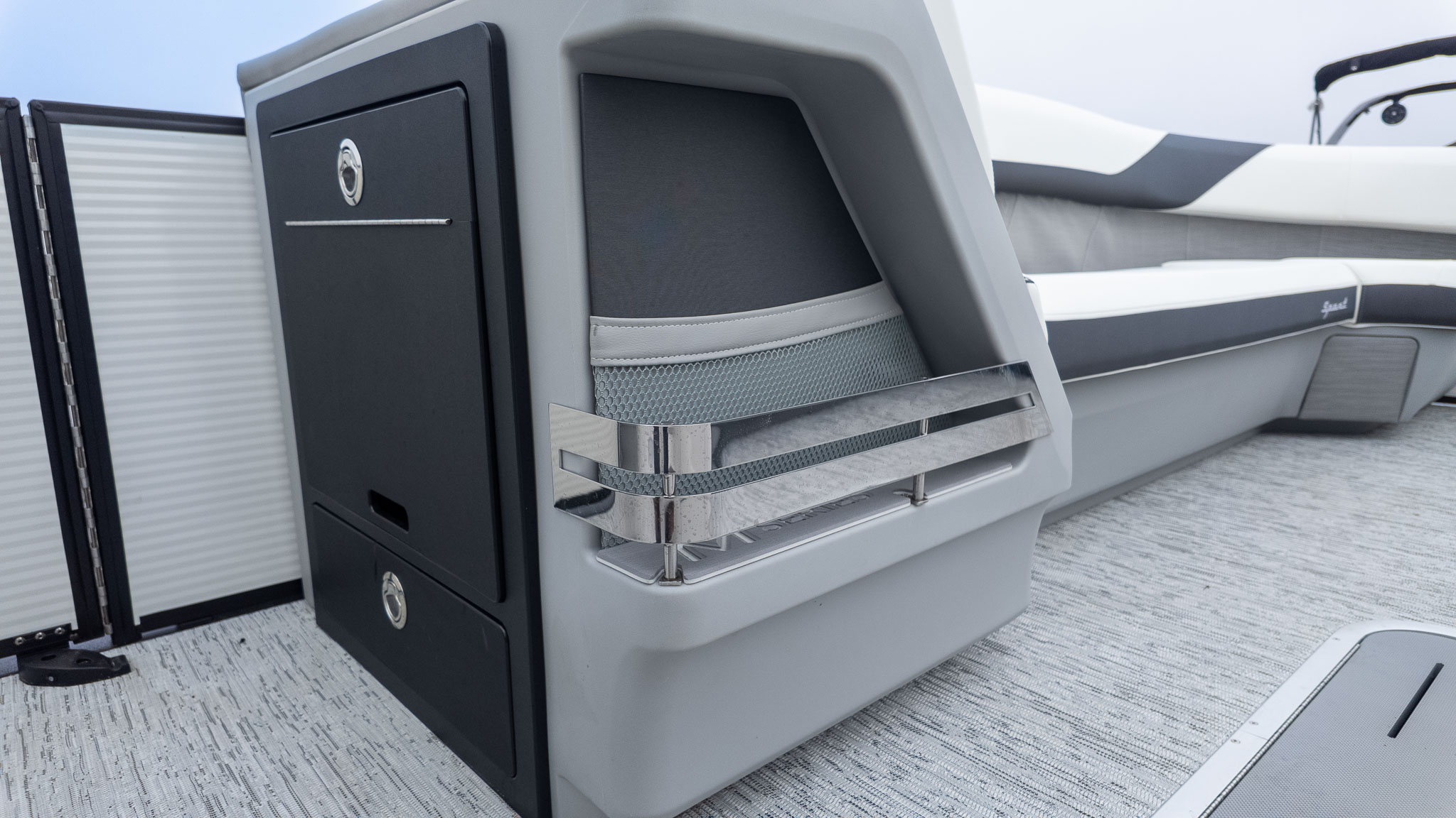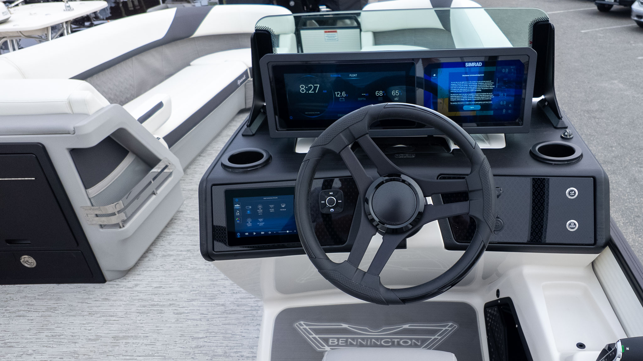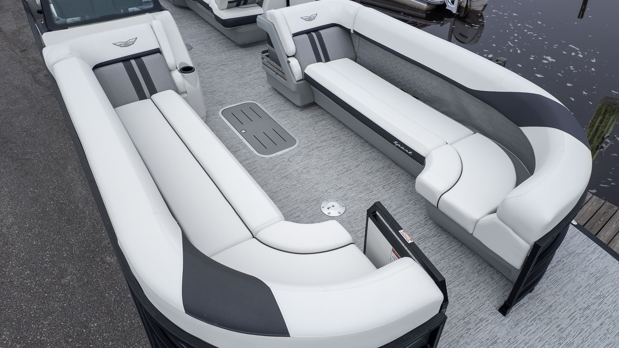 At the heart of this boat is a layout designed for connection. The signature stern loungers provide the perfect ergonomic perch for watching the action behind the boat or soaking in a panoramic view of the horizon. Wrapped in ultra-soft Veneto vinyl with zebrawood matte accents, the interior feels more like a high-end coastal suite than a traditional pontoon. For the tech-savvy captain, the helm is a masterpiece of digital integration, featuring a massive twelve-inch touchscreen and a vibrating high-fidelity audio system with lighted speakers that set the mood long after the sun goes down.