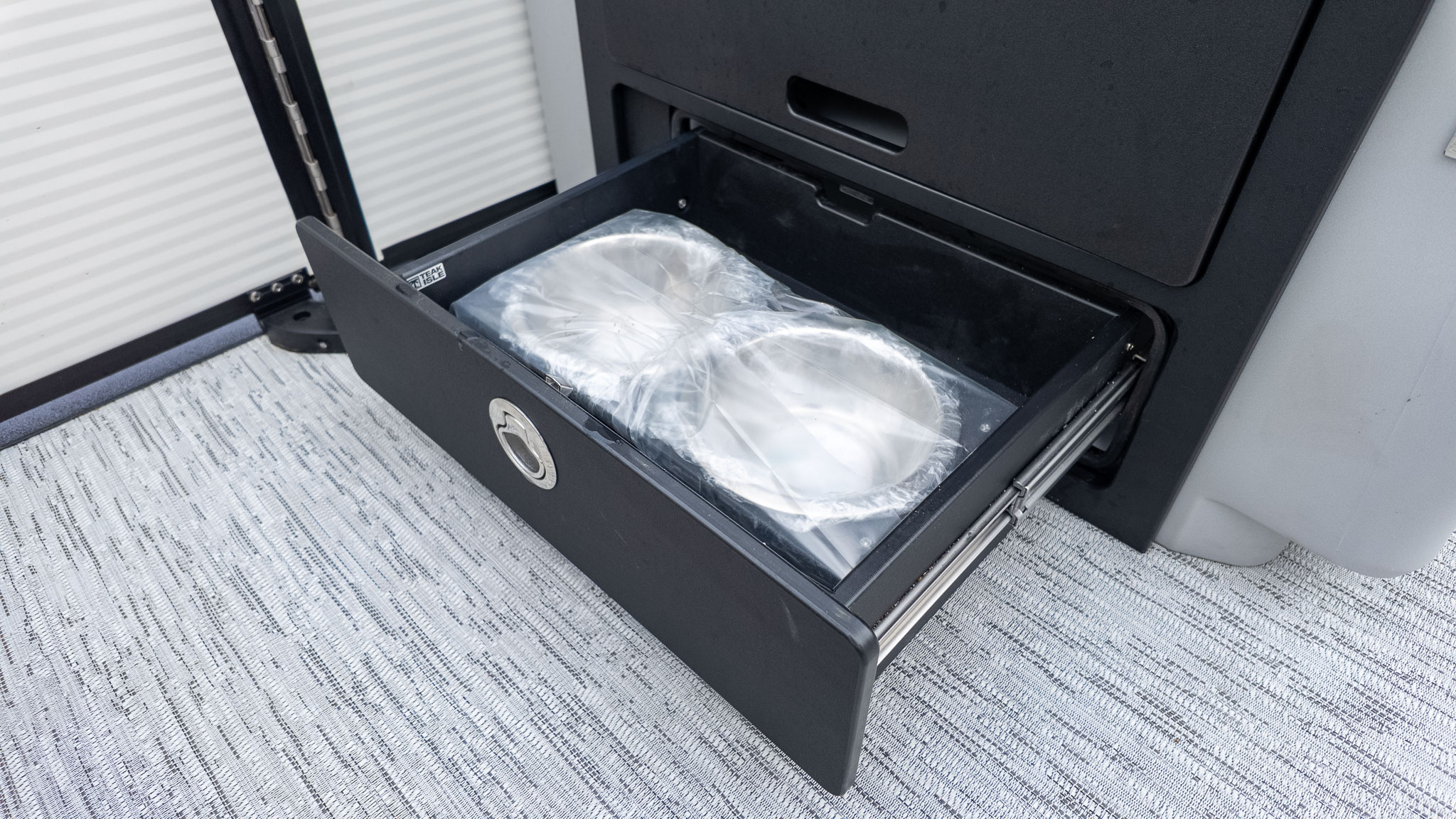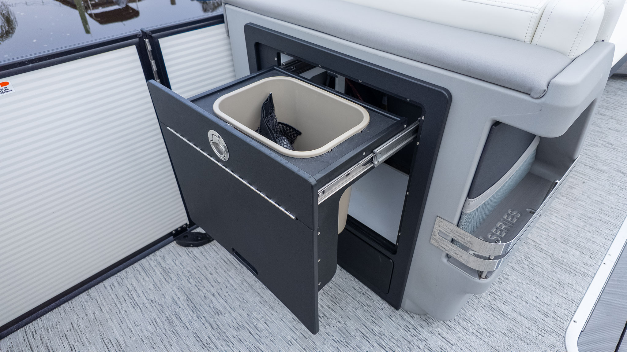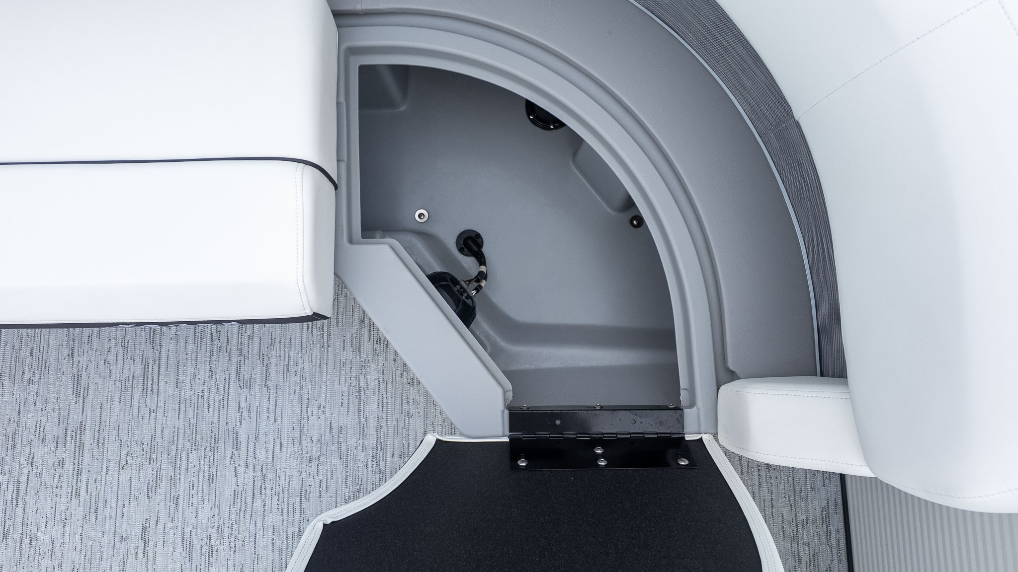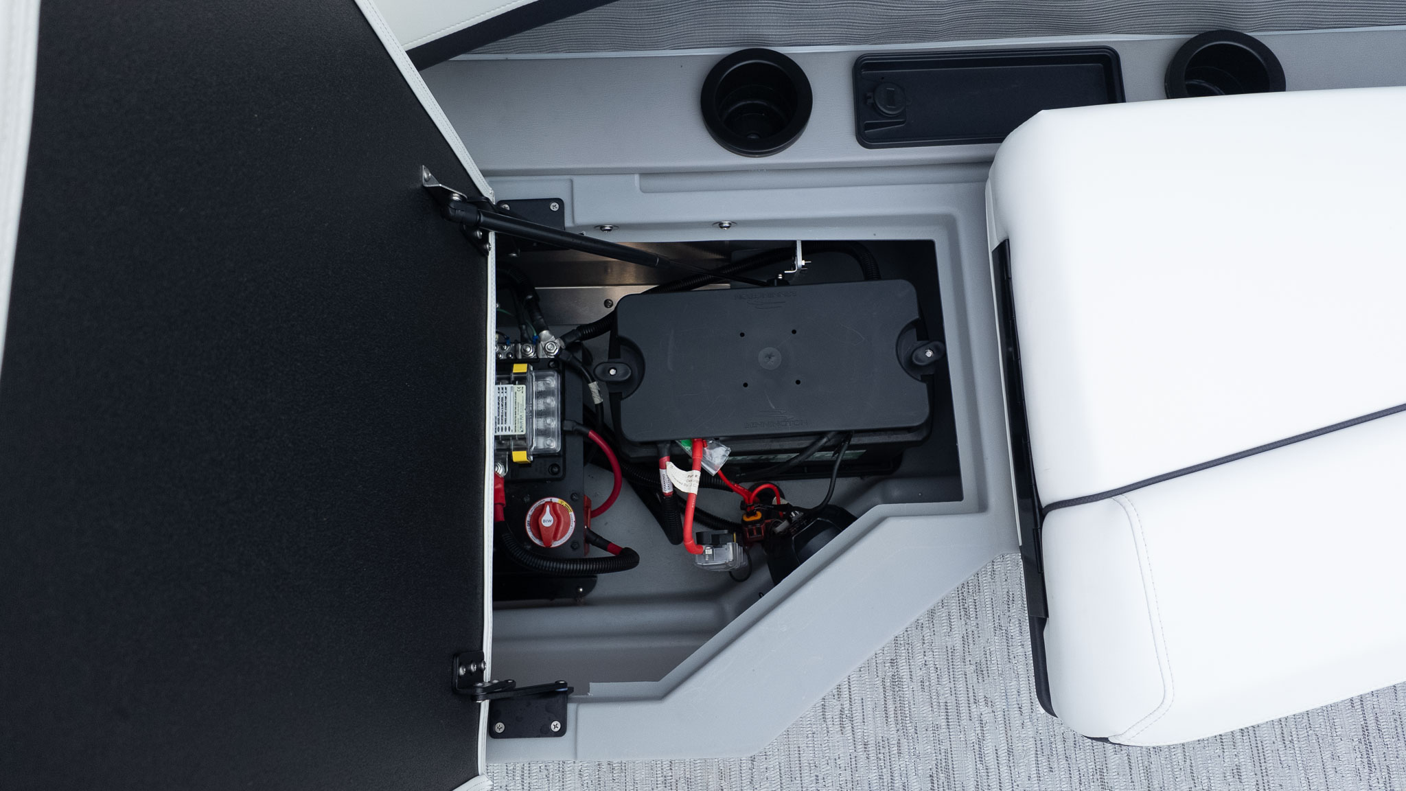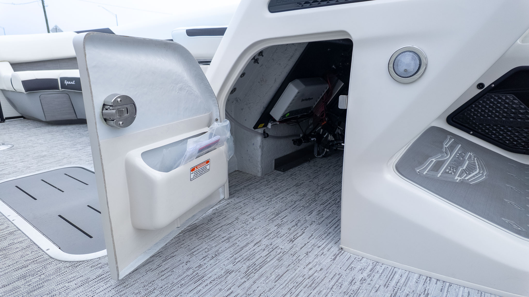 At the heart of this boat is a layout designed for connection. The signature stern loungers provide the perfect ergonomic perch for watching the action behind the boat or soaking in a panoramic view of the horizon. Wrapped in ultra-soft Veneto vinyl with zebrawood matte accents, the interior feels more like a high-end coastal suite than a traditional pontoon. For the tech-savvy captain, the helm is a masterpiece of digital integration, featuring a massive twelve-inch touchscreen and a vibrating high-fidelity audio system with lighted speakers that set the mood long after the sun goes down.