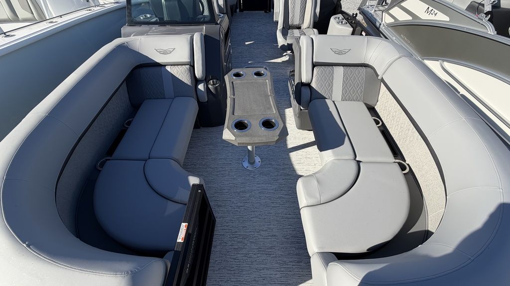 One of our most popular floor plans, the Quad Bench configuration features benches in the front and the rear. This layout maximizes storage, seating capacity, and lounge space. The M Series feature a sleek Fastback stern with speakers that extend your entertainment space.
