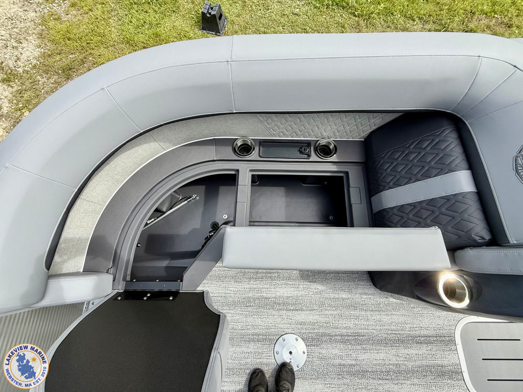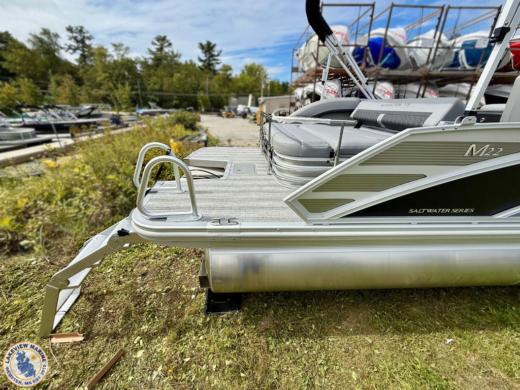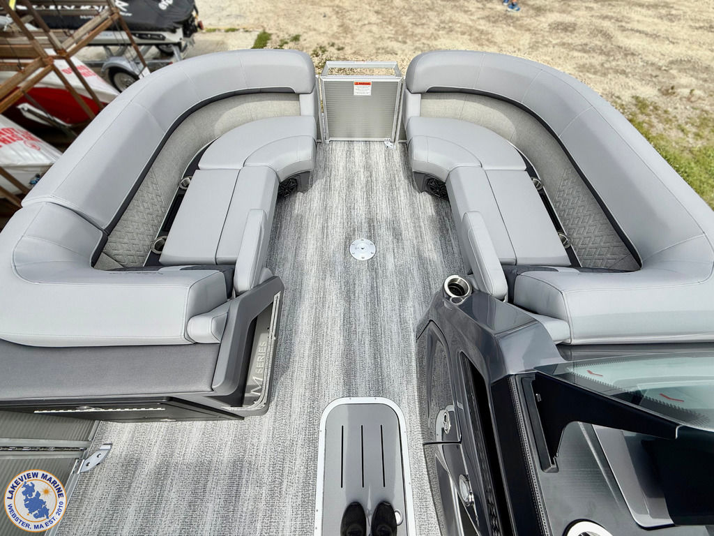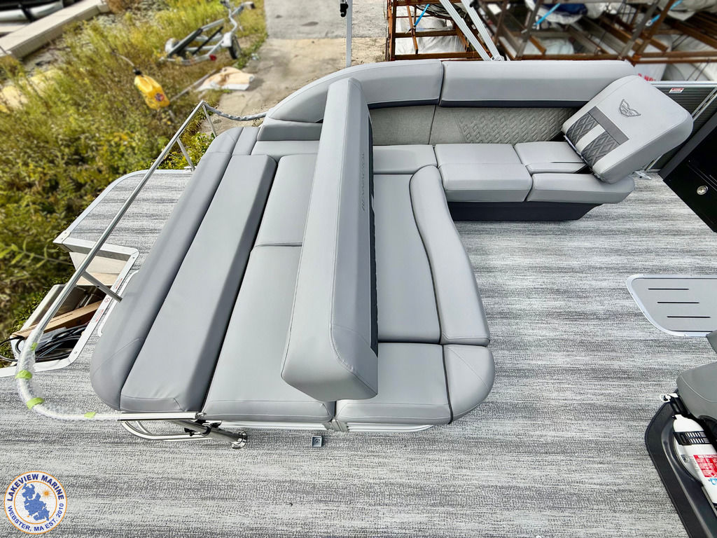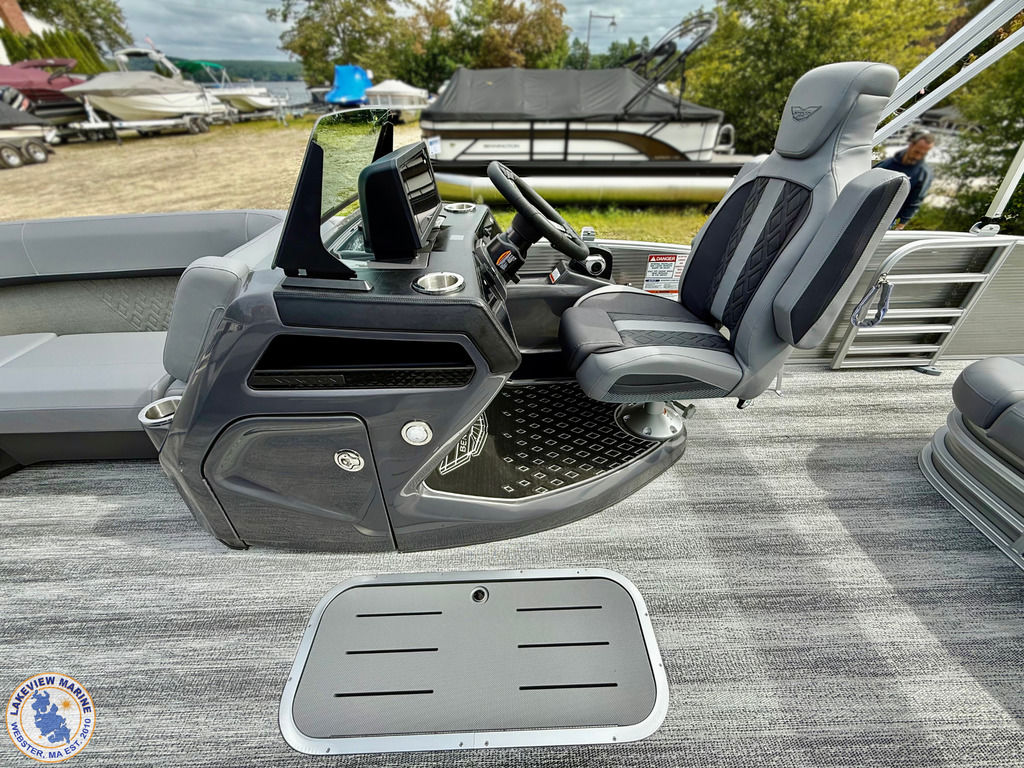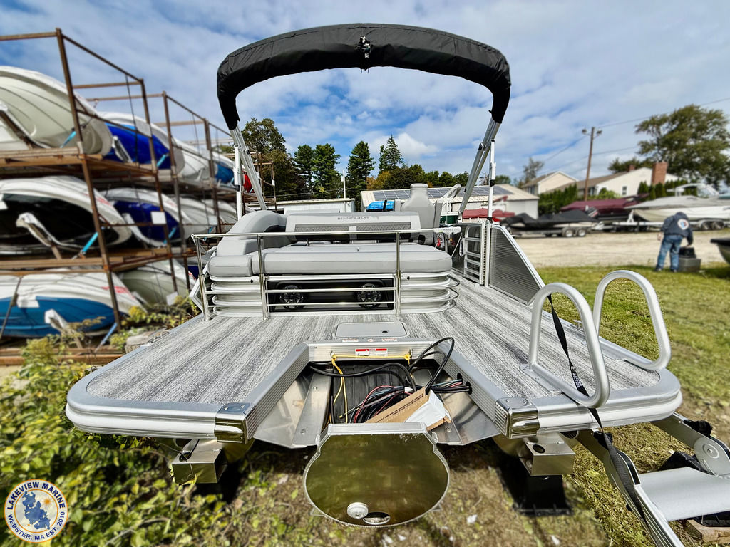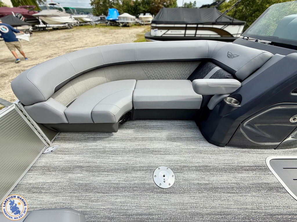 Swingback Tritoon with 150hp Yamaha engine & Saltwater Package! Whether you're cruising the lake or heading into saltier waters, this tritoon offers comfortable seating for up to 12 people and features the new retractable keeper rail around the swingback for added safety, port bench exchange for flexible seating/layout options, built in dog bowl and in-floor storage for your anchor as well as other essentials!
