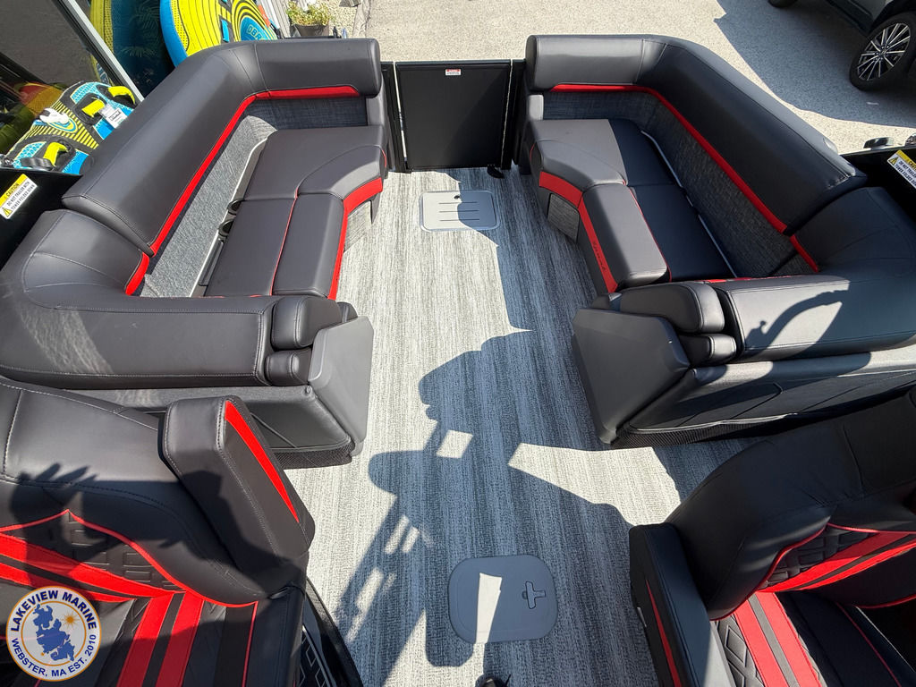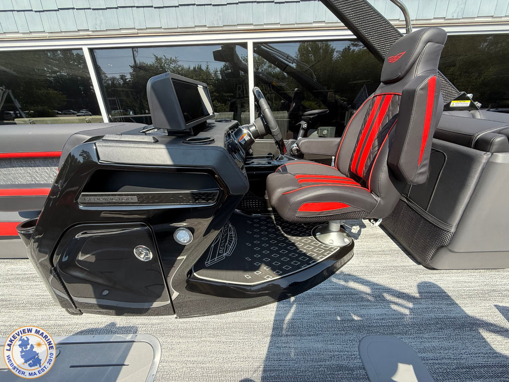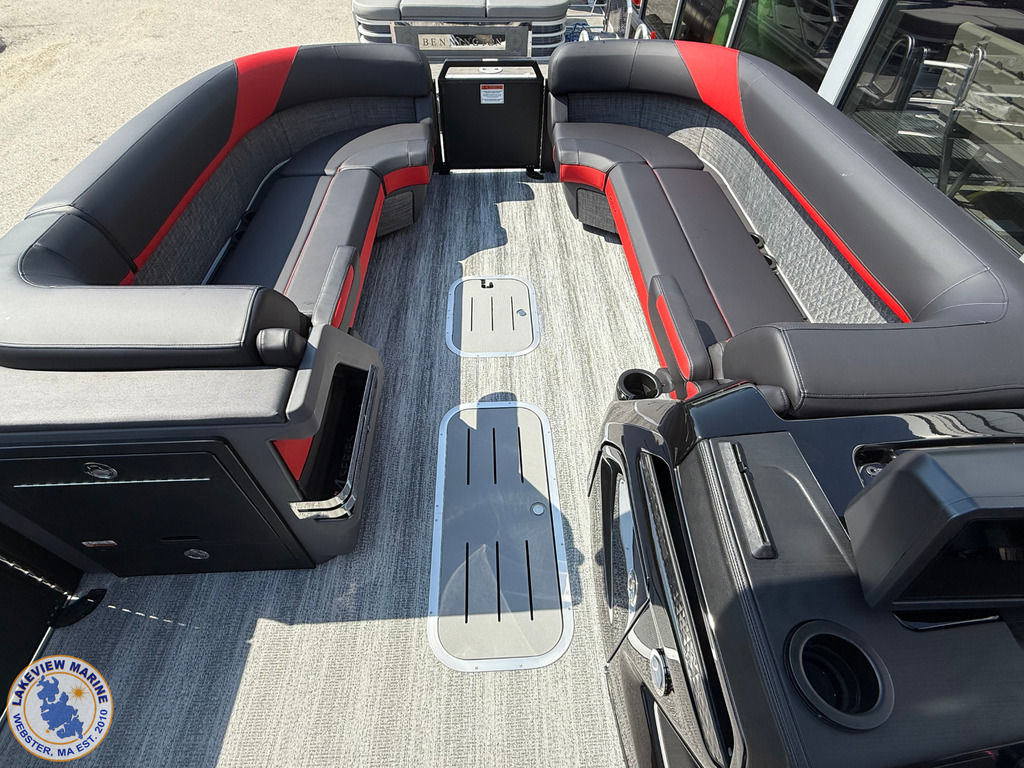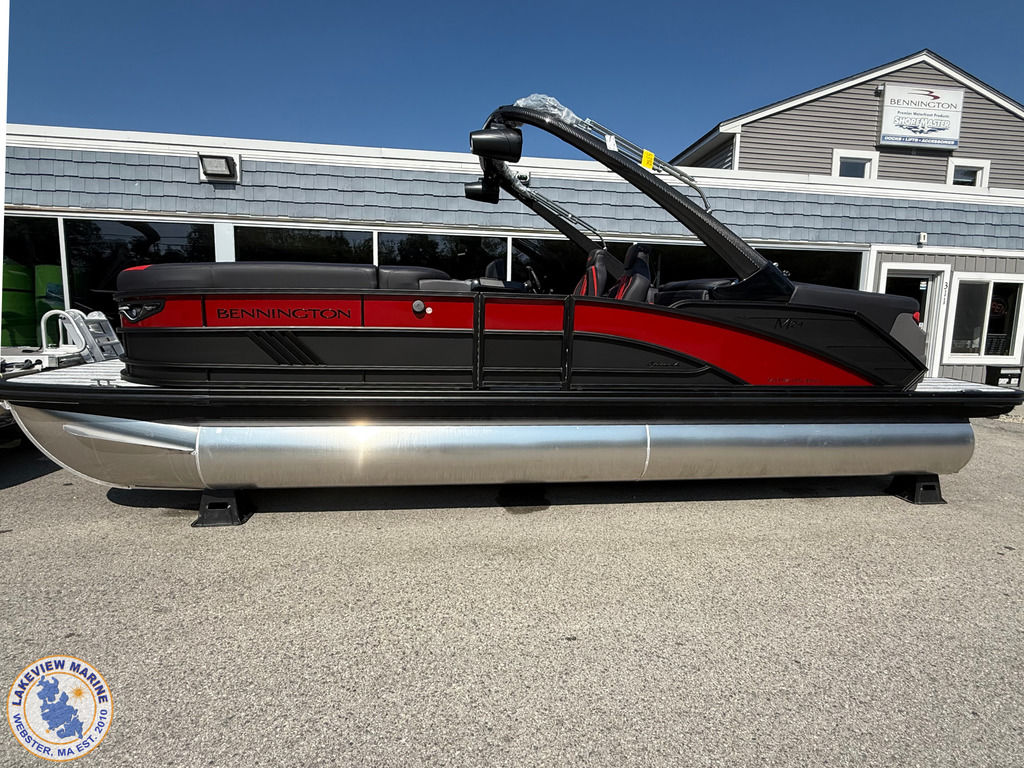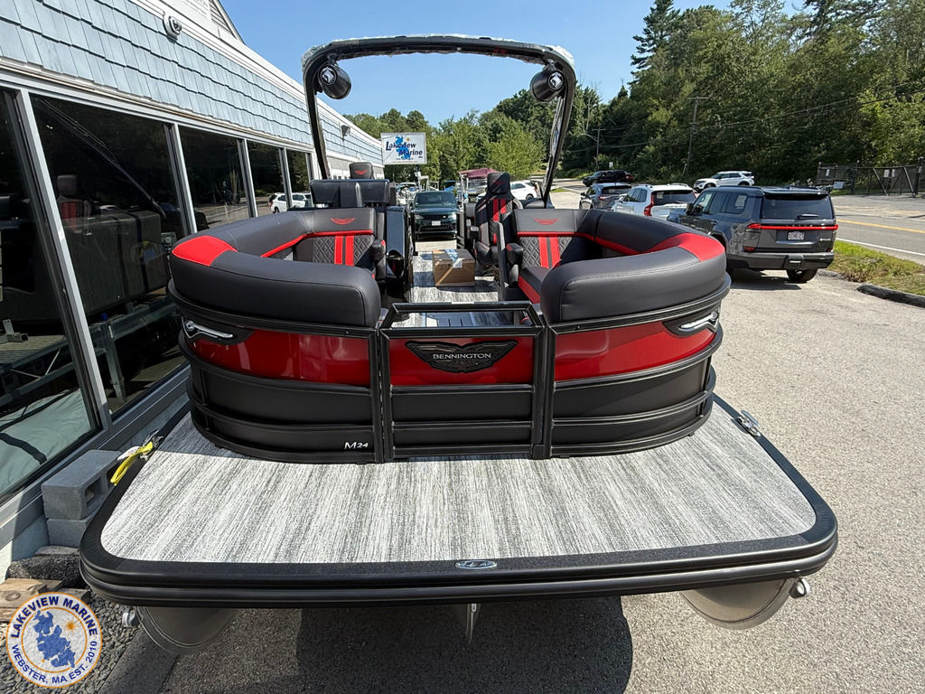 We're excited to welcome the all-new Bennington M Series to our lineup! This sleek model has a Matte Black exterior with the Absolute Red accent panel and can be powered up to 250hp. Features include a Carbon Fiber Tower, 12" Vivid UX touchscreen, 9" Garmin Multi-Function Display and Rockford Fosgate 10" Subwoofer and Amplifier!
