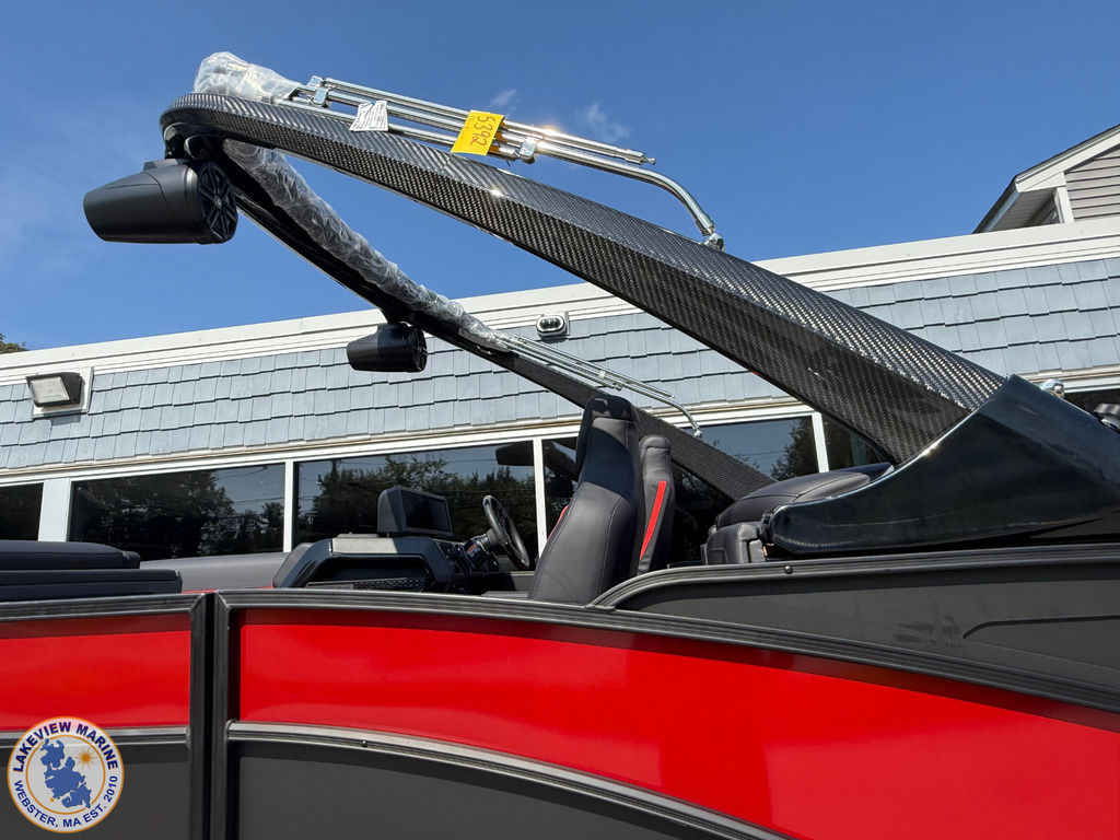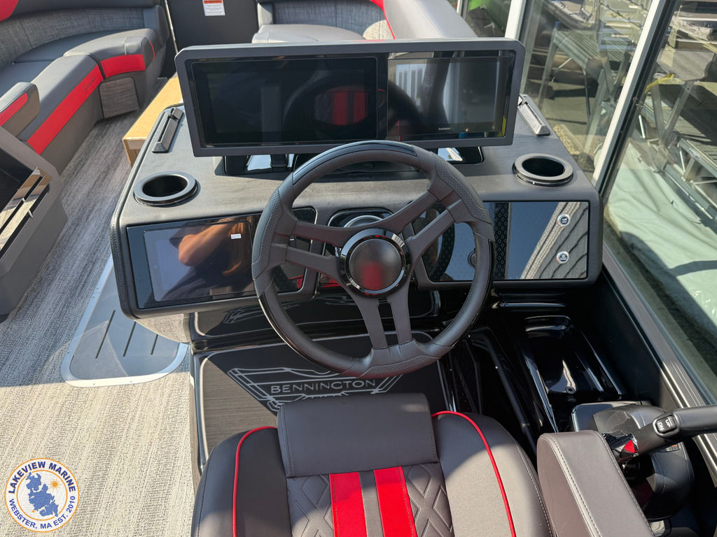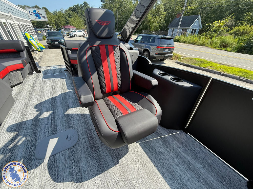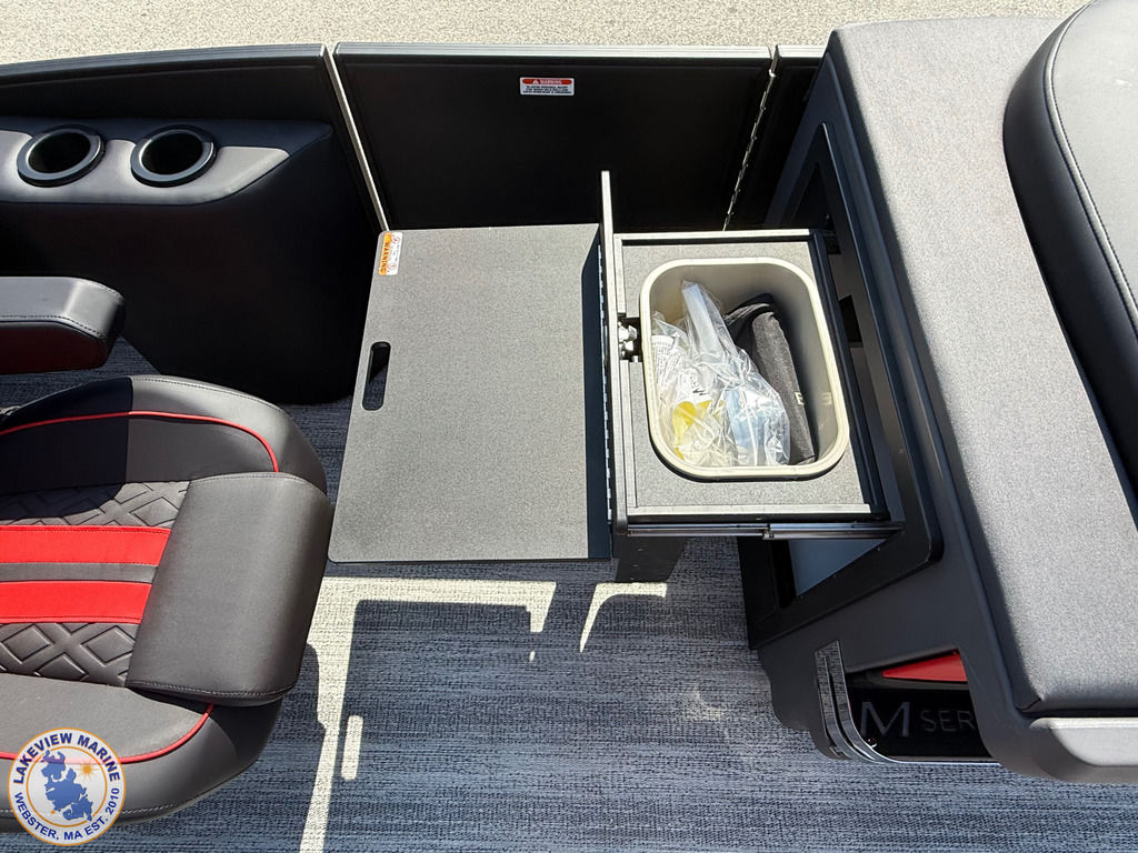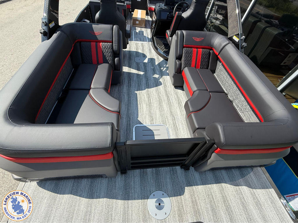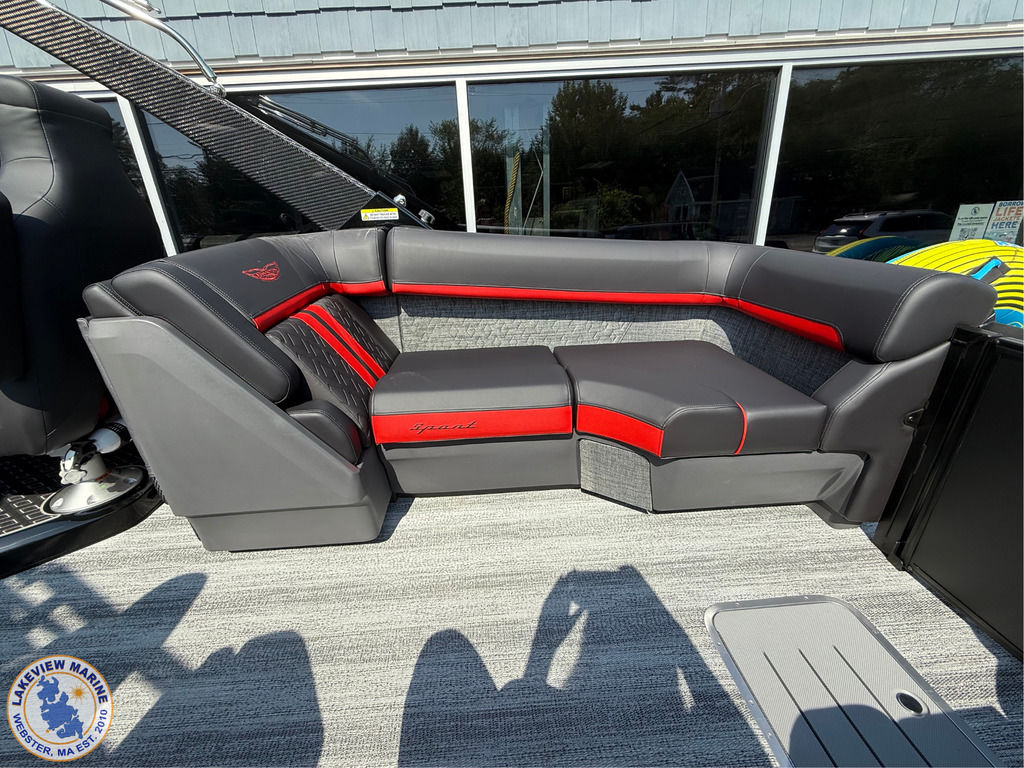 We're excited to welcome the all-new Bennington M Series to our lineup! This sleek model has a Matte Black exterior with the Absolute Red accent panel and can be powered up to 250hp. Features include a Carbon Fiber Tower, 12" Vivid UX touchscreen, 9" Garmin Multi-Function Display and Rockford Fosgate 10" Subwoofer and Amplifier!