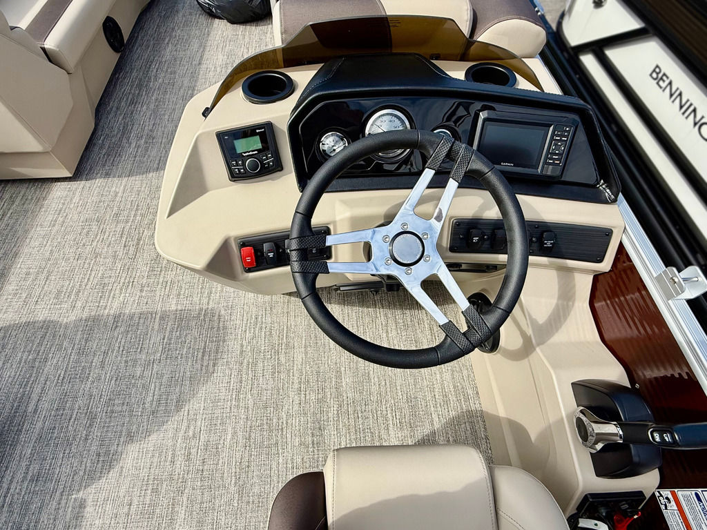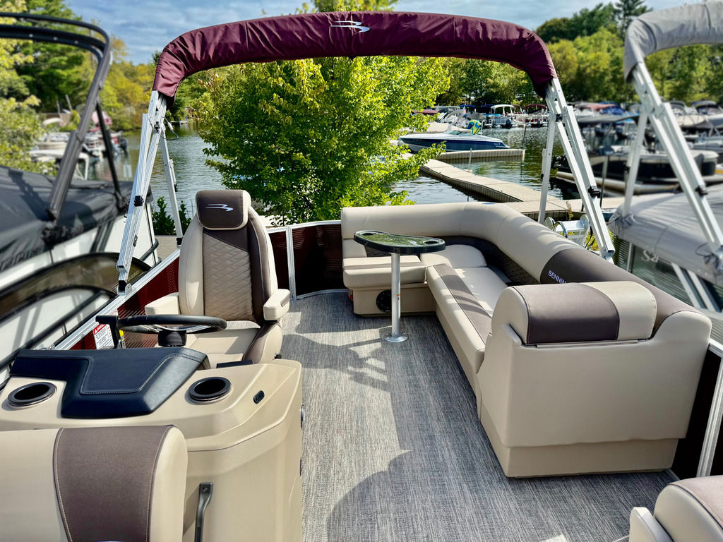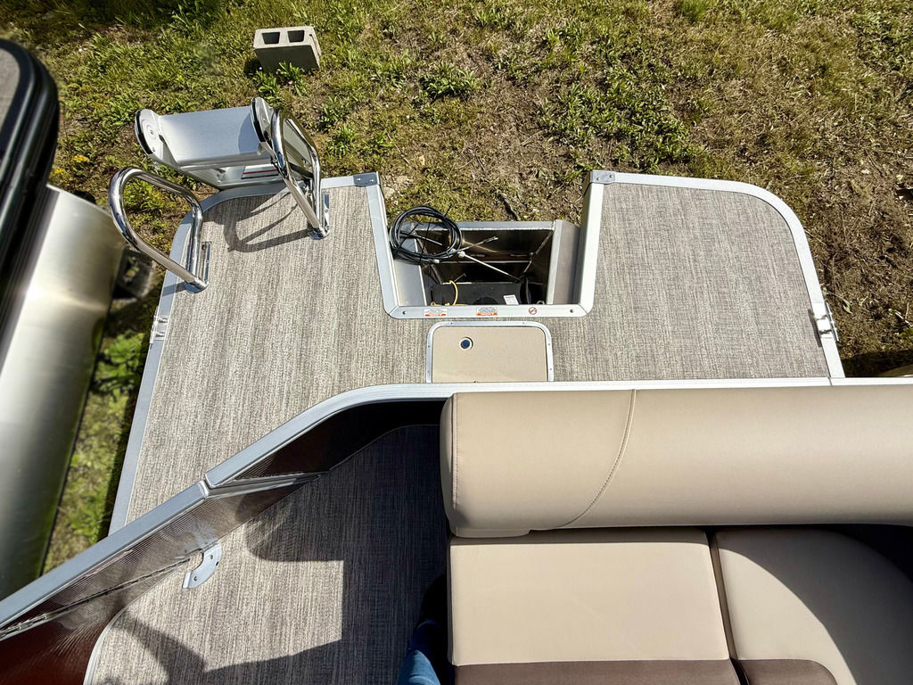 The L-bench pontoon layout has benches up front and a spacious L-bench midship allowing for multiple conversation areas! Paired with the 90hp Yamaha engine, features include lighted gate glides, new shoreline woven vinyl flooring and 2 chaise lounges