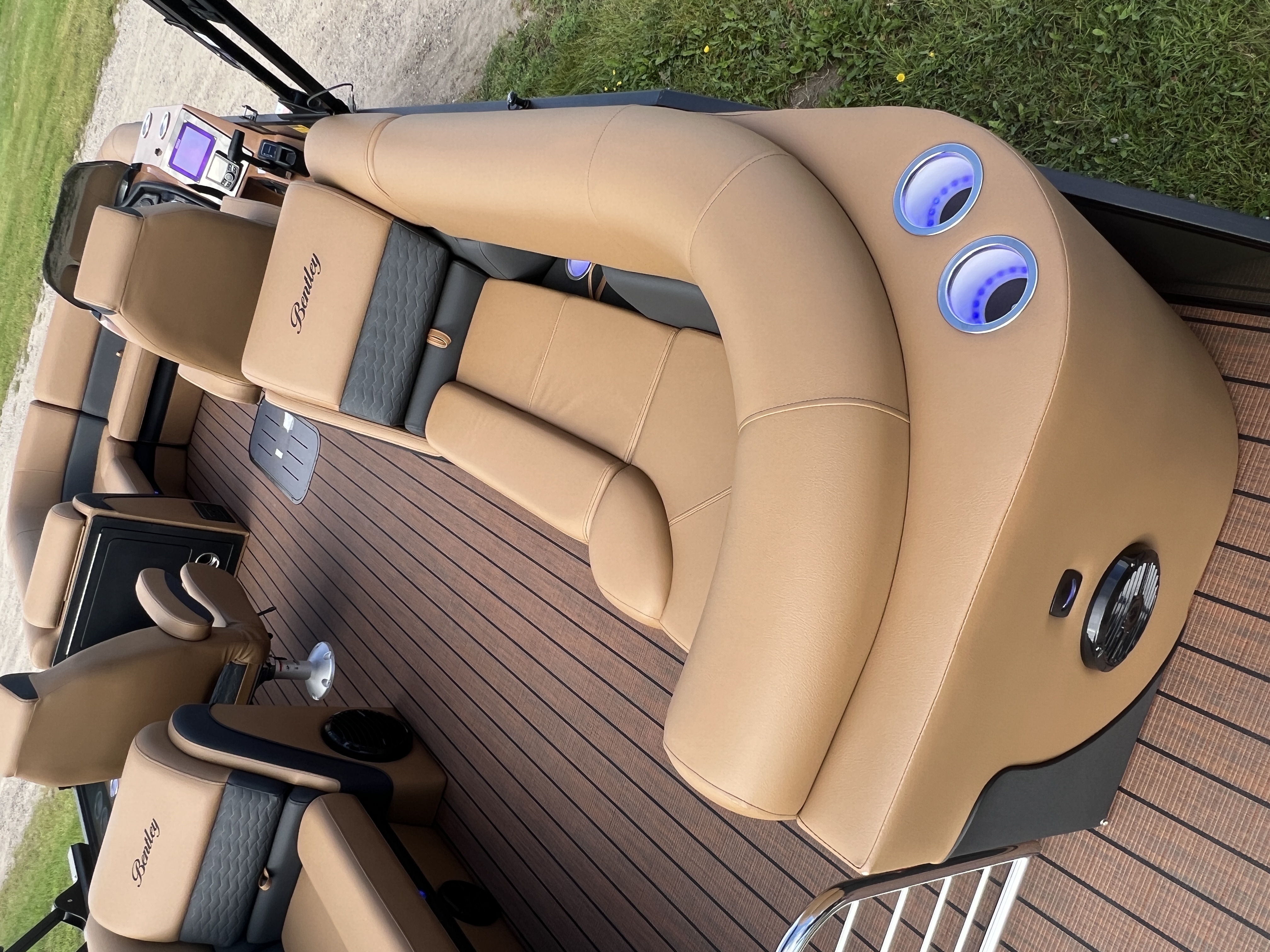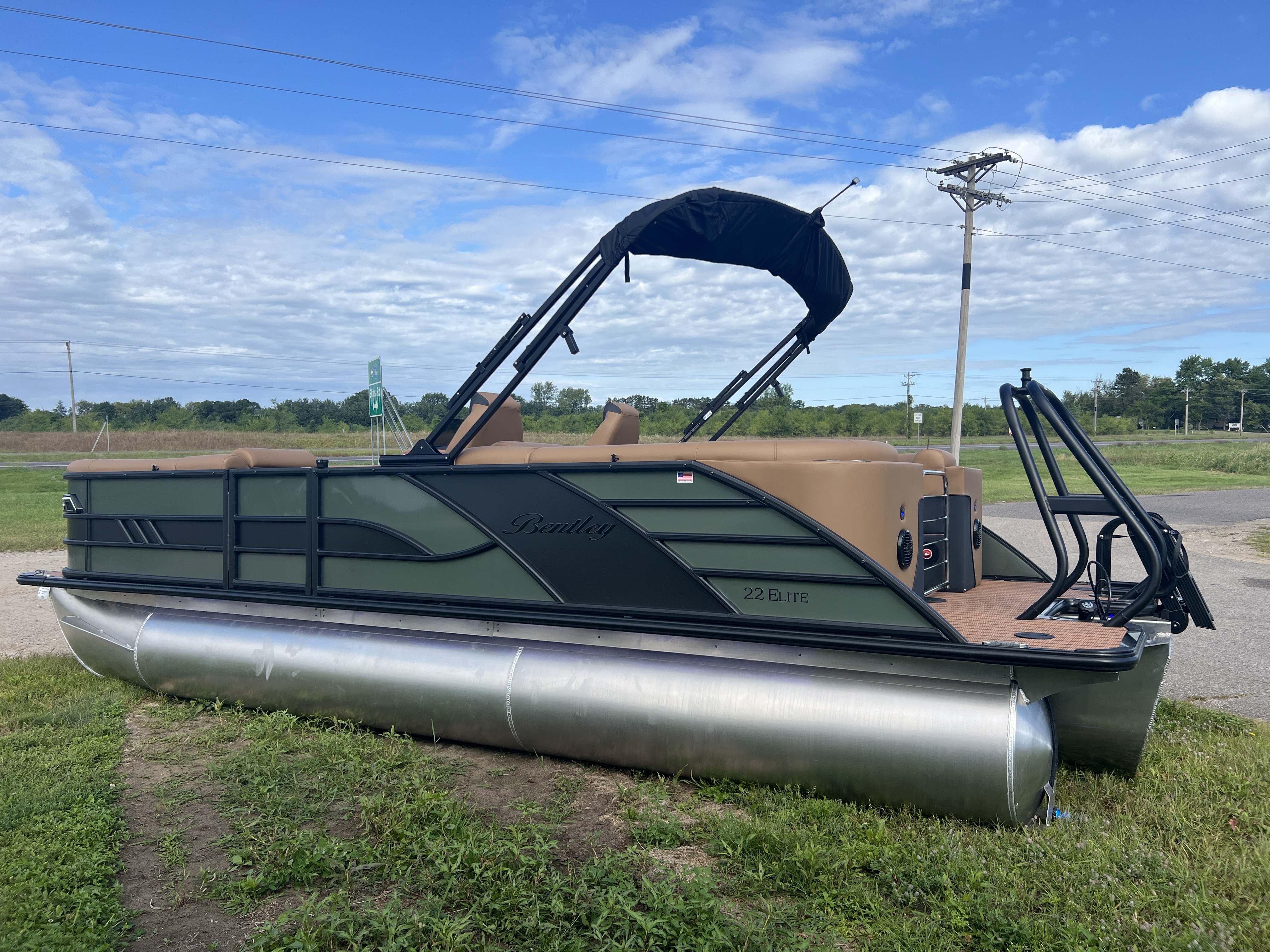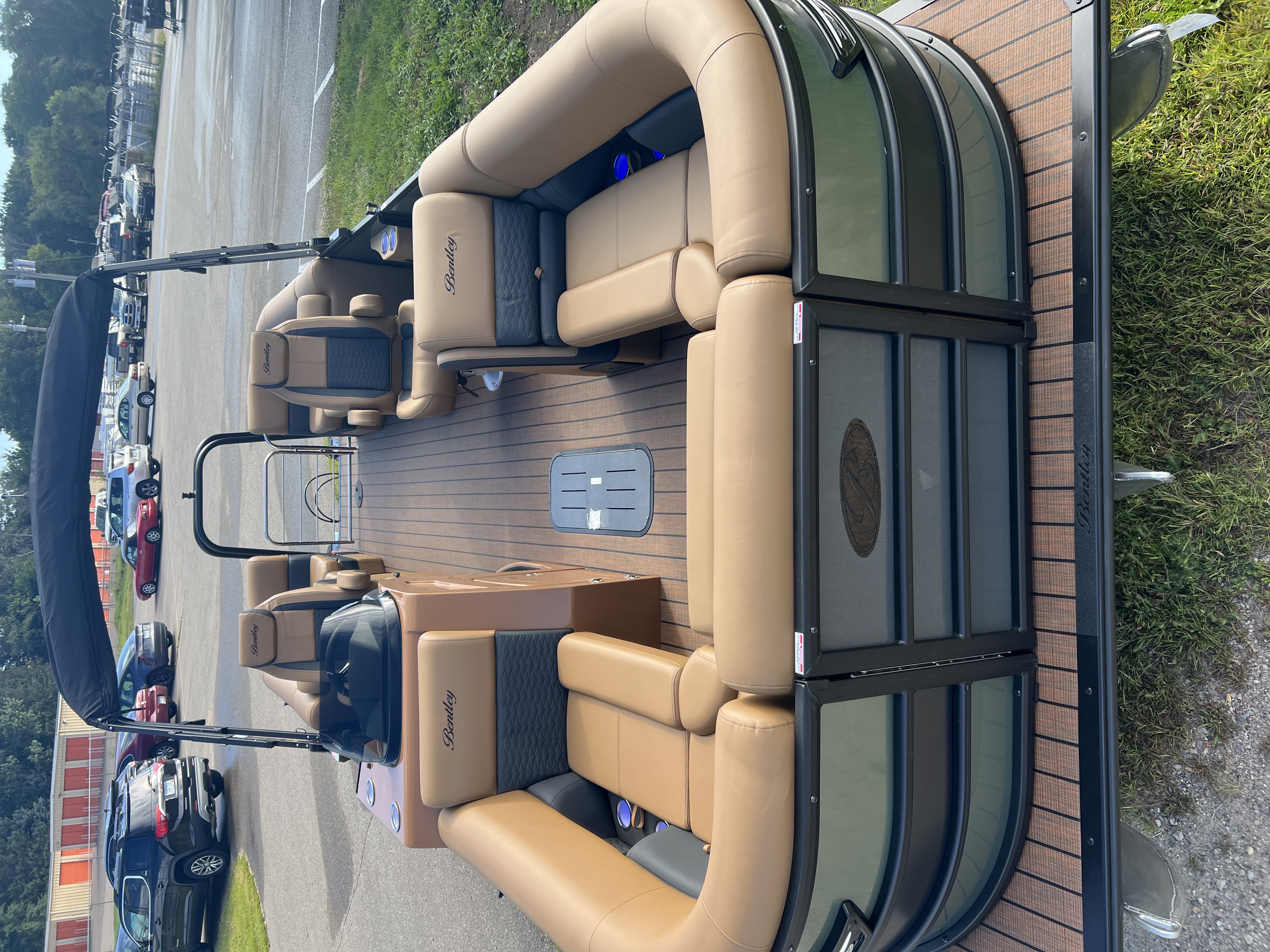 2026 Bentley Elite 223 Admiral Quad Lounge Tritoon Pontoon & Honda 4-Stroke EFI. This Sage Green/Matte Black 22' Quad Lounger Has Front Chaise Lounge Seating With Storage, Rear Chaise Lounge Seating W/Storage, Side By Side Highback Reclining Captain's Seats, Interior Blue LED Package (Lighted Cup Holders & Courtesy Lights), Exterior LED Blue Light Package w/Under Water & Under Deck Lights, Powder Coated Rails, Stainless Steel Flip Up Cleats, Simrad GPS Touch Screen Gauges, Simrad GPS Depth Finder, Black Ski Tow Bar, Premium Sound Package w/Bluetooth Radio w/6 Speakers & 10" Sub, Table, Raised Fiberglass Helm w/Storage, Walnut Teak Vinyl Flooring, Playpen Cover, Hydraulic Tilt Steering, Lifting Strakes, Lillipad Easy Step Ladder, 4 Fender Pro, Brandy Interior Package, 25" Tubes, Wireless Phone Charger, Multiple USB Charging Ports, Lounge End Table, Movable Bow Filler, New Battery, Electric Bimini Top, LED Docking Lights, LED NAV Lights, Blackout Package, Black Graphics Package, EZ View Bow Gate, Dog Bowls, Ski Locker Storage In Tube, Built-In 54 Gallon Gas Tank. Rated For 15 People!