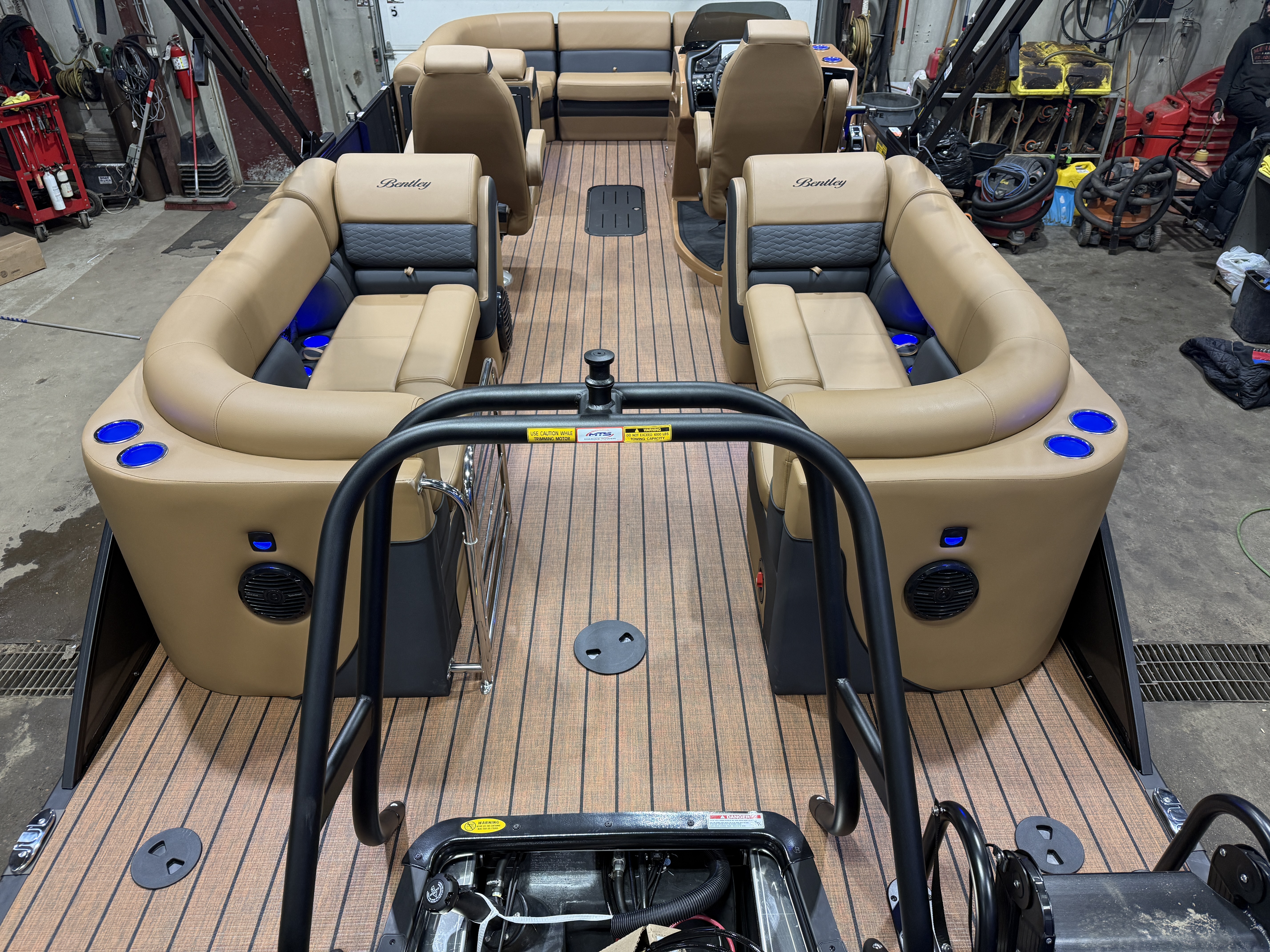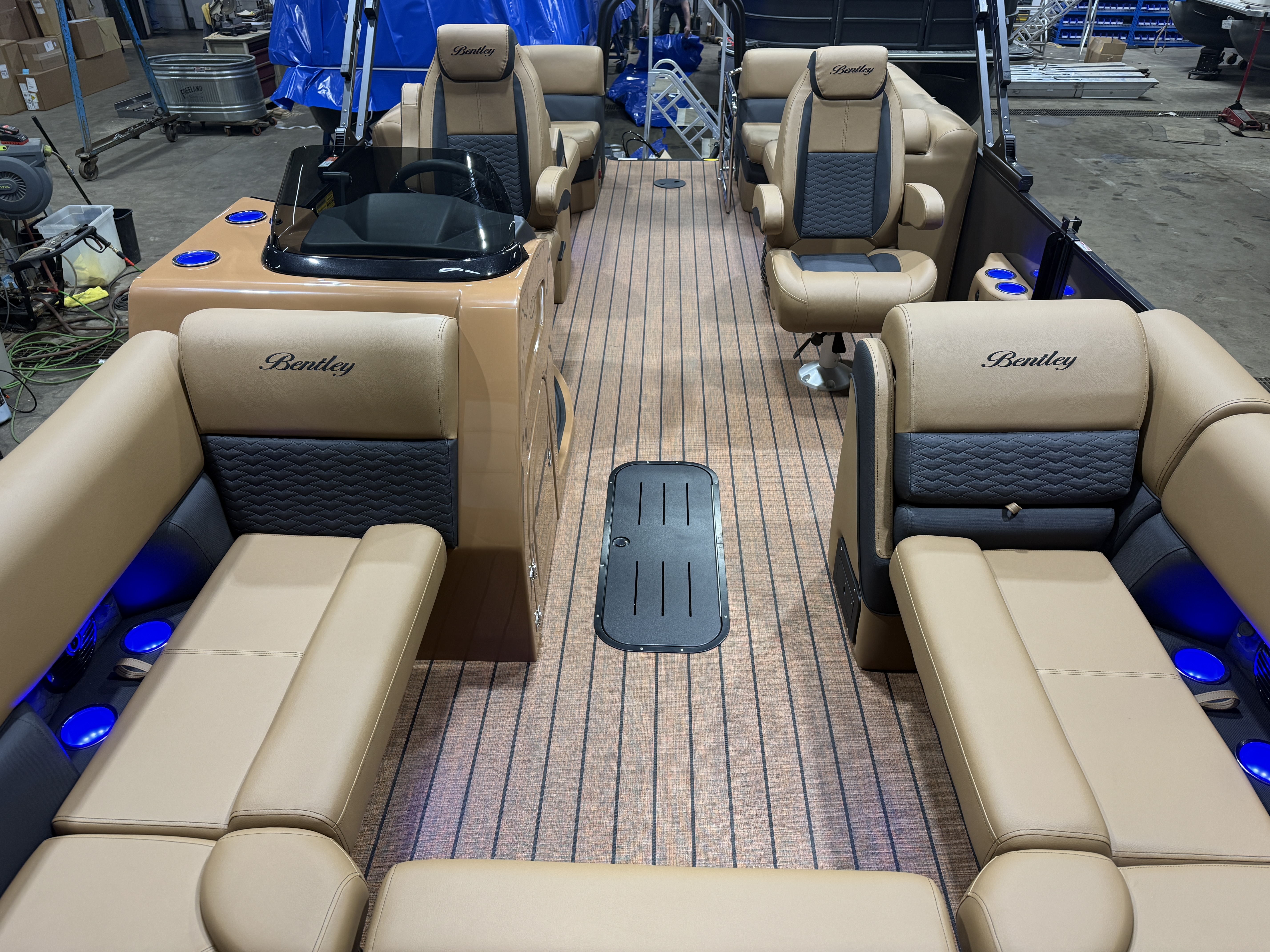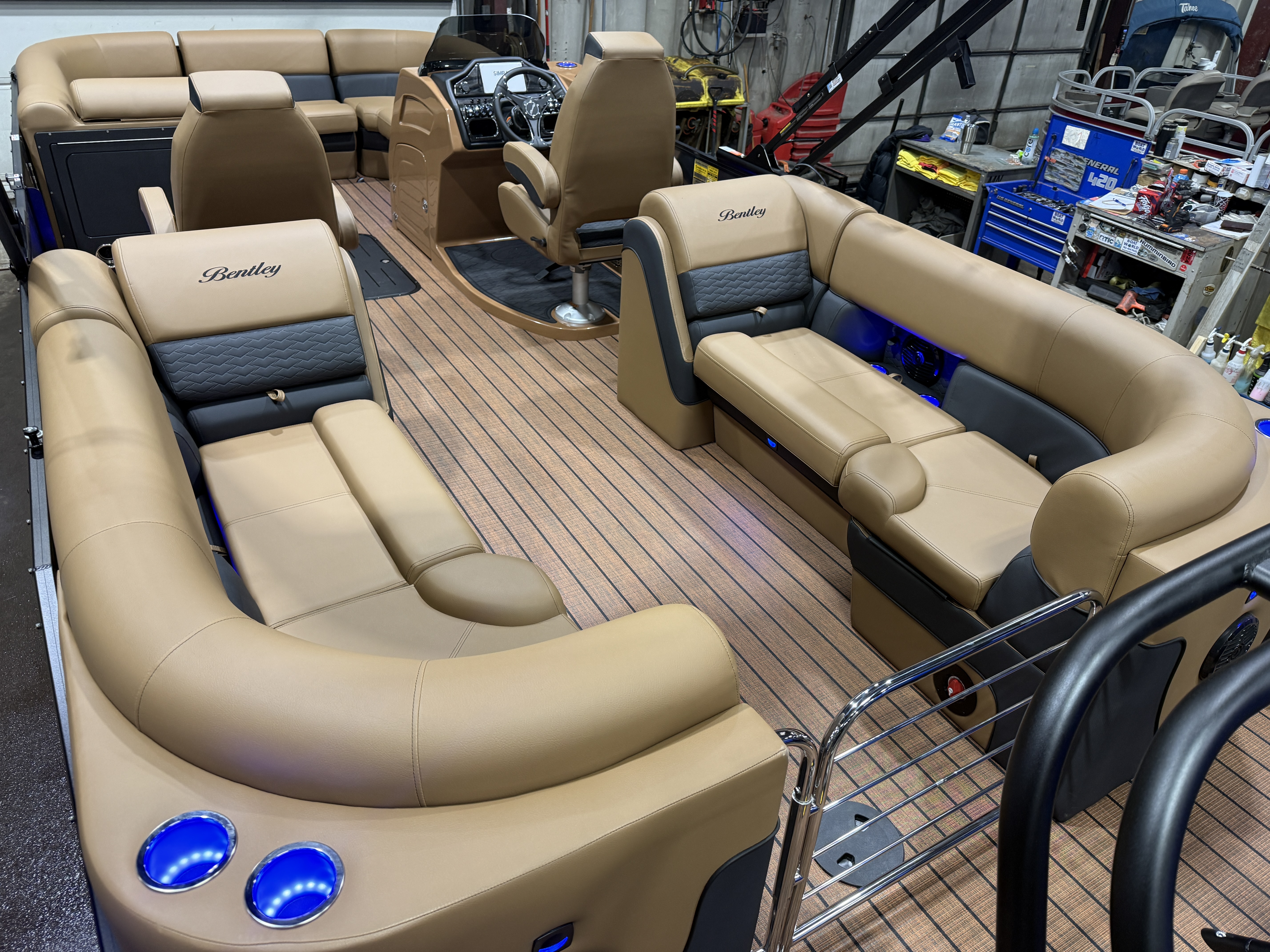 2026 Bentley Elite 223 Admiral Quad Lounge Tritoon Pontoon & Honda 4-Stroke EFI. This Charcoal/Black 22' Quad Lounger Has Front Chaise Lounge Seating With Storage, Rear Chaise Lounge Seating W/Storage, Side By Side Highback Reclining Captain's Seats, Interior Blue LED Package (Lighted Cup Holders & Courtesy Lights), Exterior LED Blue Light Package w/Under Water & Under Deck Lights, Powder Coated Rails, Stainless Steel Flip Up Cleats, Simrad GPS Touch Screen Gauges, Simrad GPS Depth Finder, Black Ski Tow Bar, Premium Sound Package w/Bluetooth Radio w/6 Speakers & 10" Sub, Table, Raised Fiberglass Helm w/Storage, Walnut Teak Vinyl Flooring, Playpen Cover, Hydraulic Tilt Steering, Lifting Strakes, Lillipad Easy Step Ladder, 4 Fender Pro, Brandy Interior Package, 25" Tubes, Wireless Phone Charger, Multiple USB Charging Ports, Lounge End Table, Movable Bow Filler, New Battery, Electric Bimini Top, LED Docking Lights, LED NAV Lights, Blackout Package, Black Graphics Package, EZ View Bow Gate, Dog Bowls, Ski Locker Storage In Tube, Built-In 54 Gallon Gas Tank. Rated For 15 People!