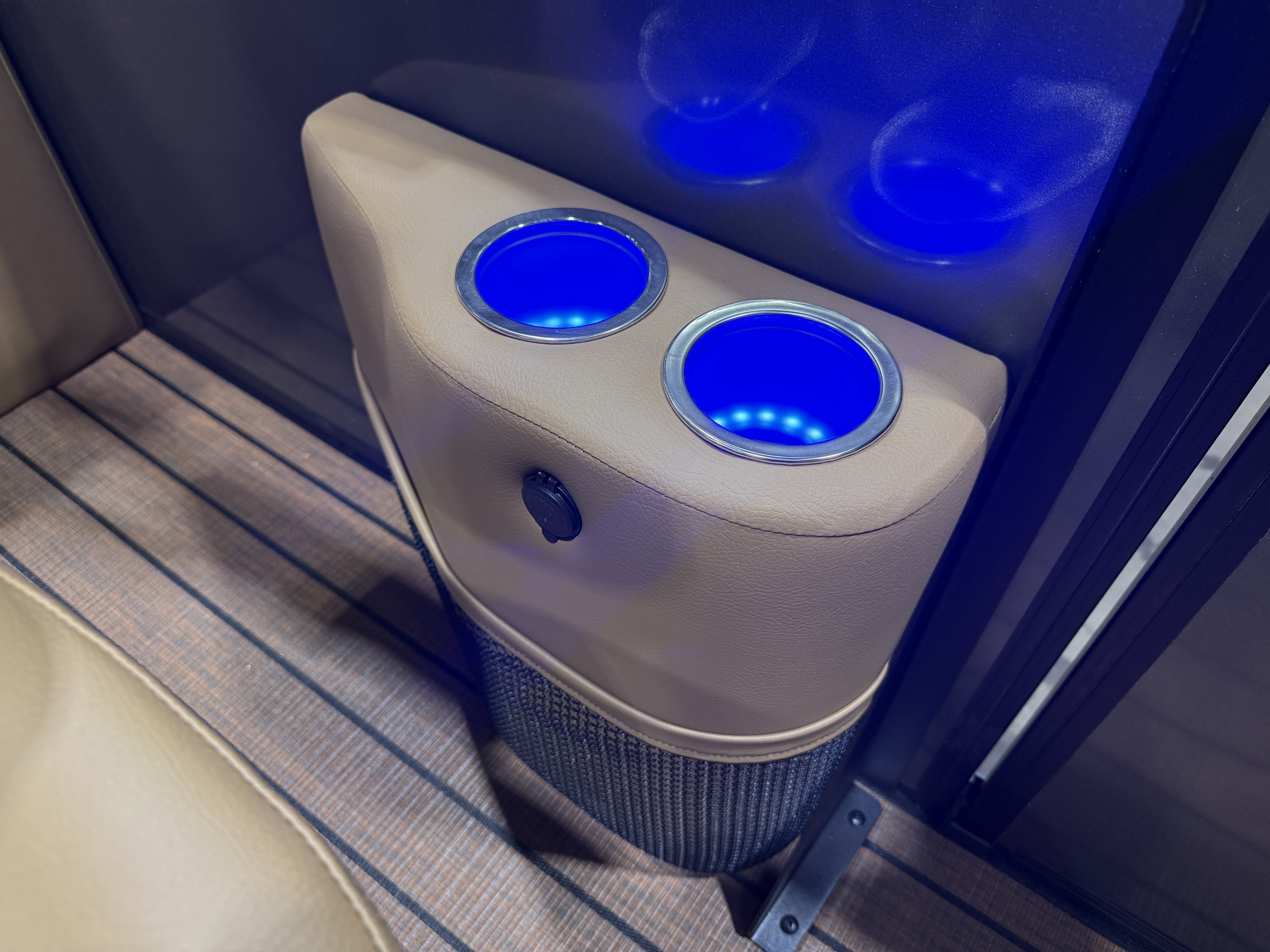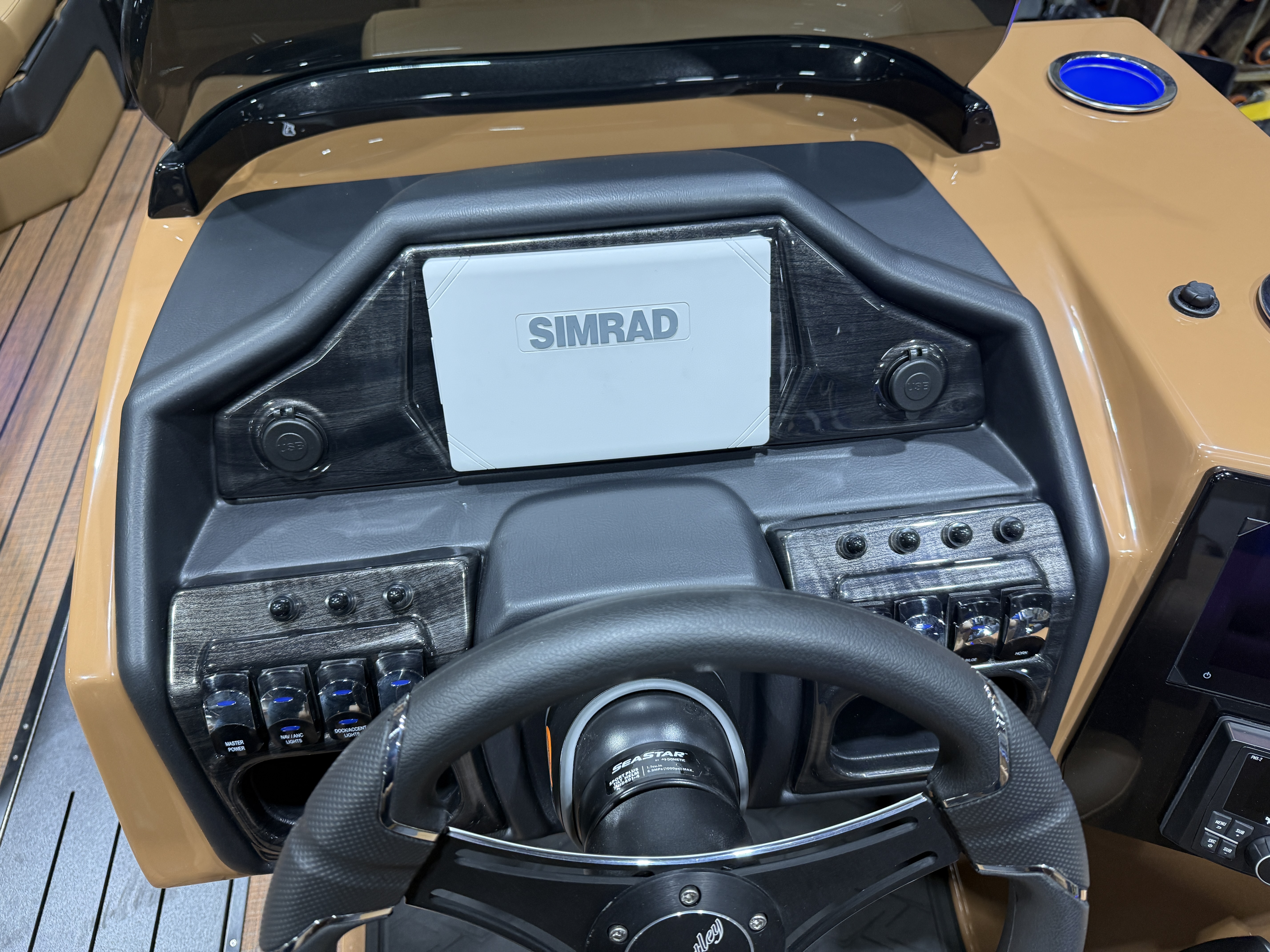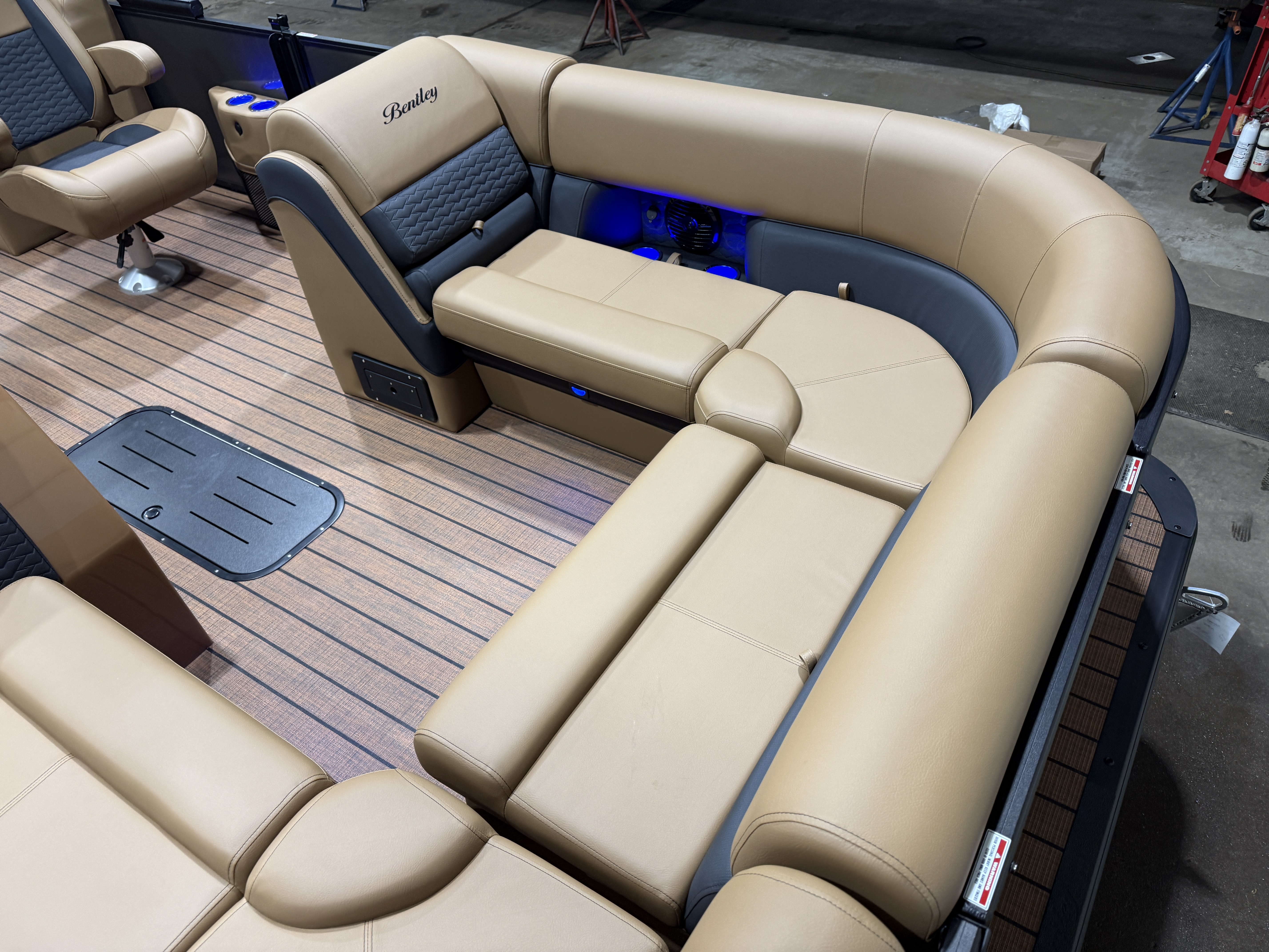 2026 Bentley Elite 223 Admiral Quad Lounge Tritoon Pontoon & Honda 4-Stroke EFI. This Charcoal/Black 22' Quad Lounger Has Front Chaise Lounge Seating With Storage, Rear Chaise Lounge Seating W/Storage, Side By Side Highback Reclining Captain's Seats, Interior Blue LED Package (Lighted Cup Holders & Courtesy Lights), Exterior LED Blue Light Package w/Under Water & Under Deck Lights, Powder Coated Rails, Stainless Steel Flip Up Cleats, Simrad GPS Touch Screen Gauges, Simrad GPS Depth Finder, Black Ski Tow Bar, Premium Sound Package w/Bluetooth Radio w/6 Speakers & 10" Sub, Table, Raised Fiberglass Helm w/Storage, Walnut Teak Vinyl Flooring, Playpen Cover, Hydraulic Tilt Steering, Lifting Strakes, Lillipad Easy Step Ladder, 4 Fender Pro, Brandy Interior Package, 25" Tubes, Wireless Phone Charger, Multiple USB Charging Ports, Lounge End Table, Movable Bow Filler, New Battery, Electric Bimini Top, LED Docking Lights, LED NAV Lights, Blackout Package, Black Graphics Package, EZ View Bow Gate, Dog Bowls, Ski Locker Storage In Tube, Built-In 54 Gallon Gas Tank. Rated For 15 People!