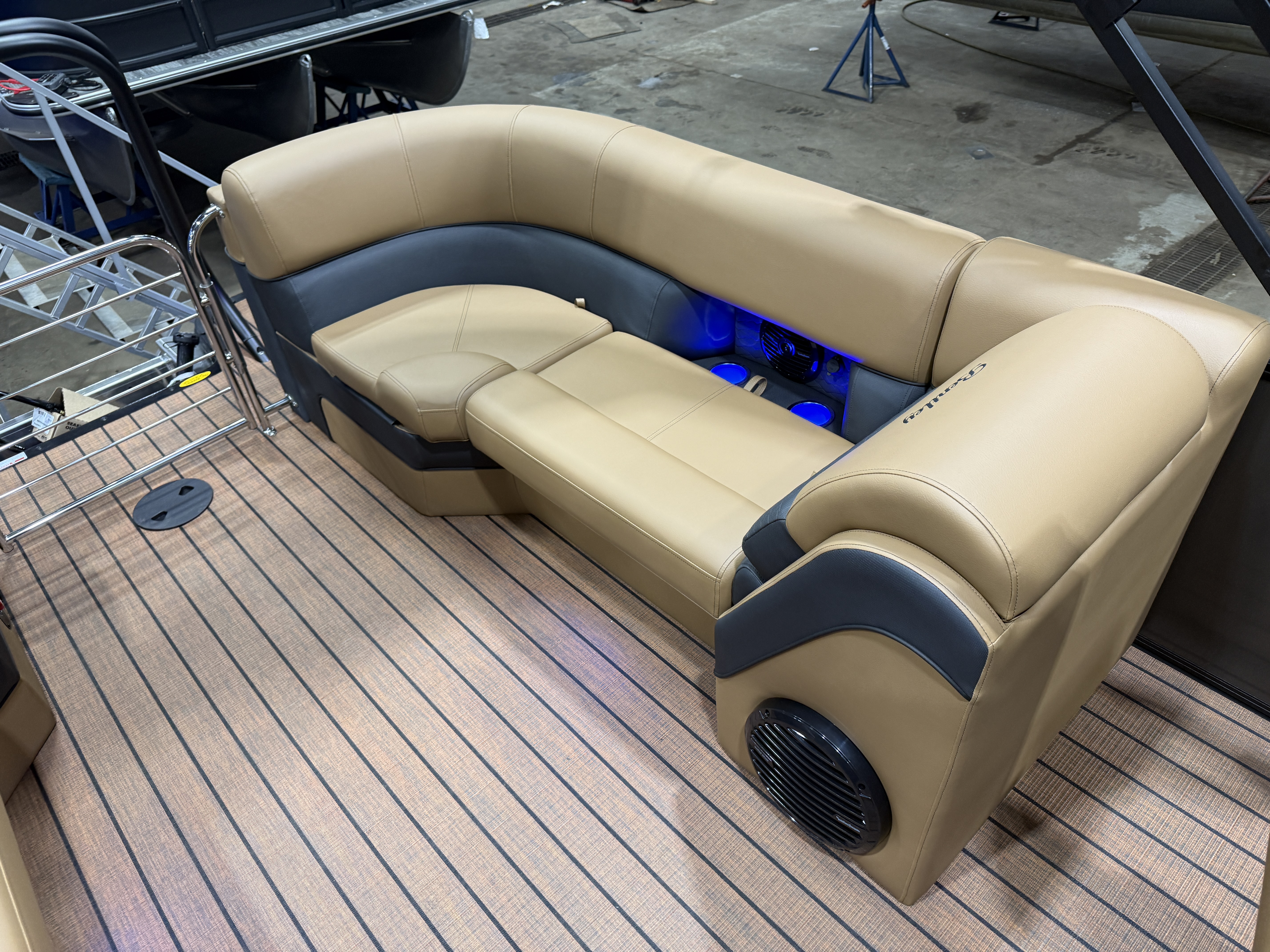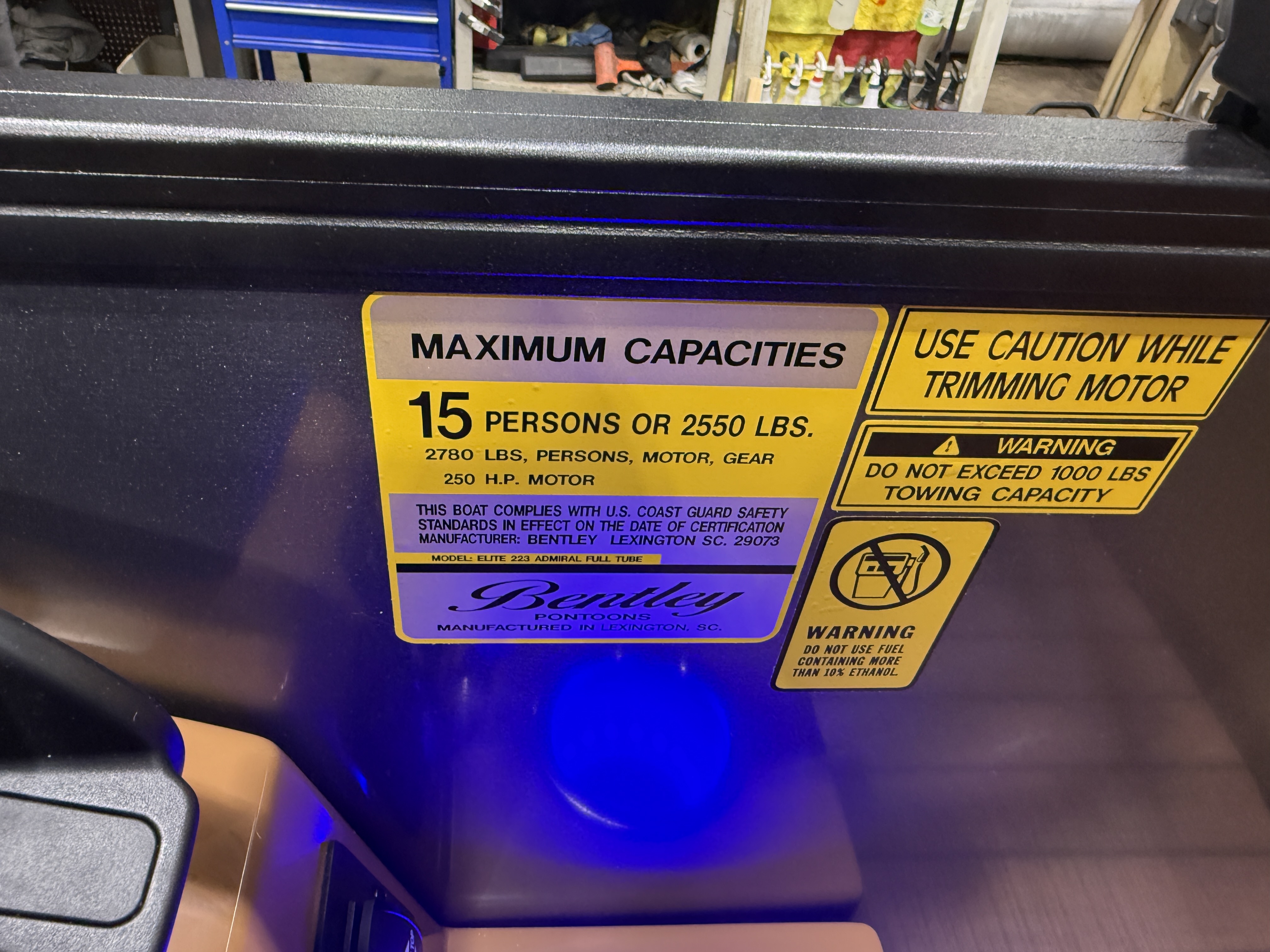 2026 Bentley Elite 223 Admiral Quad Lounge Tritoon Pontoon & Honda 4-Stroke EFI. This Charcoal/Black 22' Quad Lounger Has Front Chaise Lounge Seating With Storage, Rear Chaise Lounge Seating W/Storage, Side By Side Highback Reclining Captain's Seats, Interior Blue LED Package (Lighted Cup Holders & Courtesy Lights), Exterior LED Blue Light Package w/Under Water & Under Deck Lights, Powder Coated Rails, Stainless Steel Flip Up Cleats, Simrad GPS Touch Screen Gauges, Simrad GPS Depth Finder, Black Ski Tow Bar, Premium Sound Package w/Bluetooth Radio w/6 Speakers & 10" Sub, Table, Raised Fiberglass Helm w/Storage, Walnut Teak Vinyl Flooring, Playpen Cover, Hydraulic Tilt Steering, Lifting Strakes, Lillipad Easy Step Ladder, 4 Fender Pro, Brandy Interior Package, 25" Tubes, Wireless Phone Charger, Multiple USB Charging Ports, Lounge End Table, Movable Bow Filler, New Battery, Electric Bimini Top, LED Docking Lights, LED NAV Lights, Blackout Package, Black Graphics Package, EZ View Bow Gate, Dog Bowls, Ski Locker Storage In Tube, Built-In 54 Gallon Gas Tank. Rated For 15 People!