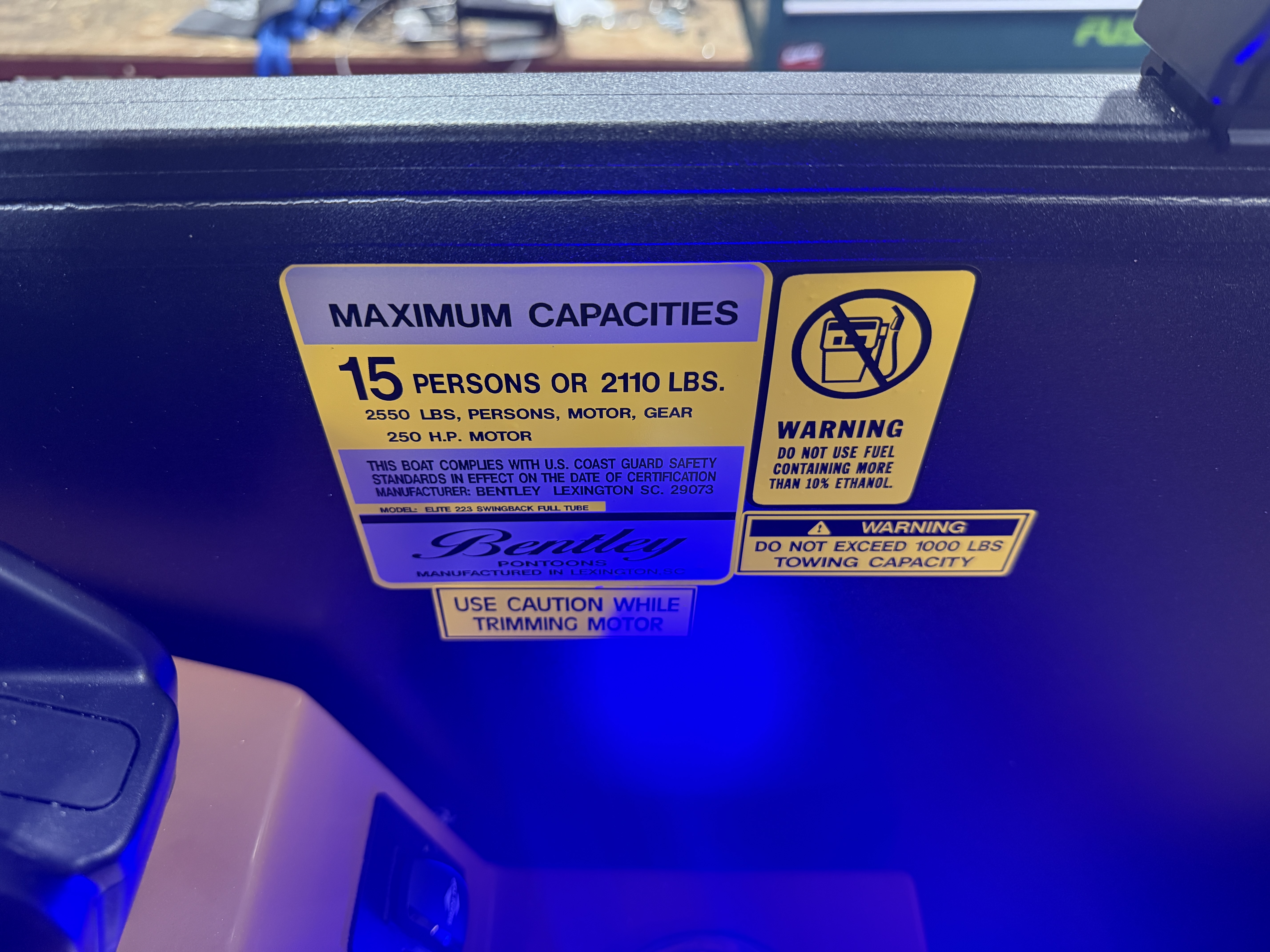 2026 Bentley Elite 223 Swingback Tritoon Pontoon & 200 hp Honda 4-Stroke EFI. This Matte Black Walls Tritoon 22' Swingback Has Front Chaise Lounge Seating With Storage, Rear Swingback Rear Lounge Seating With Multiple Positions & Storage, Rear Safety Fencing, Side By Side Highback Reclining Captain's Seats, Interior Blue LED Package (Lighted Cup Holders & Courtesy Lights), Exterior LED Blue Light Package w/Under Water & Under Deck Lights, Powder Coated Rails, Stainless Steel Flip Up Cleats, Simrad GPS Touch Screen Gauges, Simrad GPS Depth Finder, Ski Tow Bar, Premium Sound Package w/Bluetooth Radio w/6 Speakers & 10" Sub, Wood Grain Table, Raised Fiberglass Helm w/Storage, Walnut Teak Vinyl Flooring, Playpen Cover, Hydraulic Tilt Steering, Lifting Strakes, Underneath Sheeting, Lillipad Easy Step Ladder, 4 Fender Pro, Brandy Interior Package, 25" Tubes, Wireless Phone Charger, Multiple USB Charging Ports, Lounge End Table, New Battery, LED Docking Lights, LED NAV Lights, Playpen Cover, Electric Bimini Top, Blackout Package, Black Graphics Package, EZ View Bow Gate, Dog Bowls, Ski Locker Storage In Tube, Built-In 54 Gallon Gas Tank. Rated For 15 People!