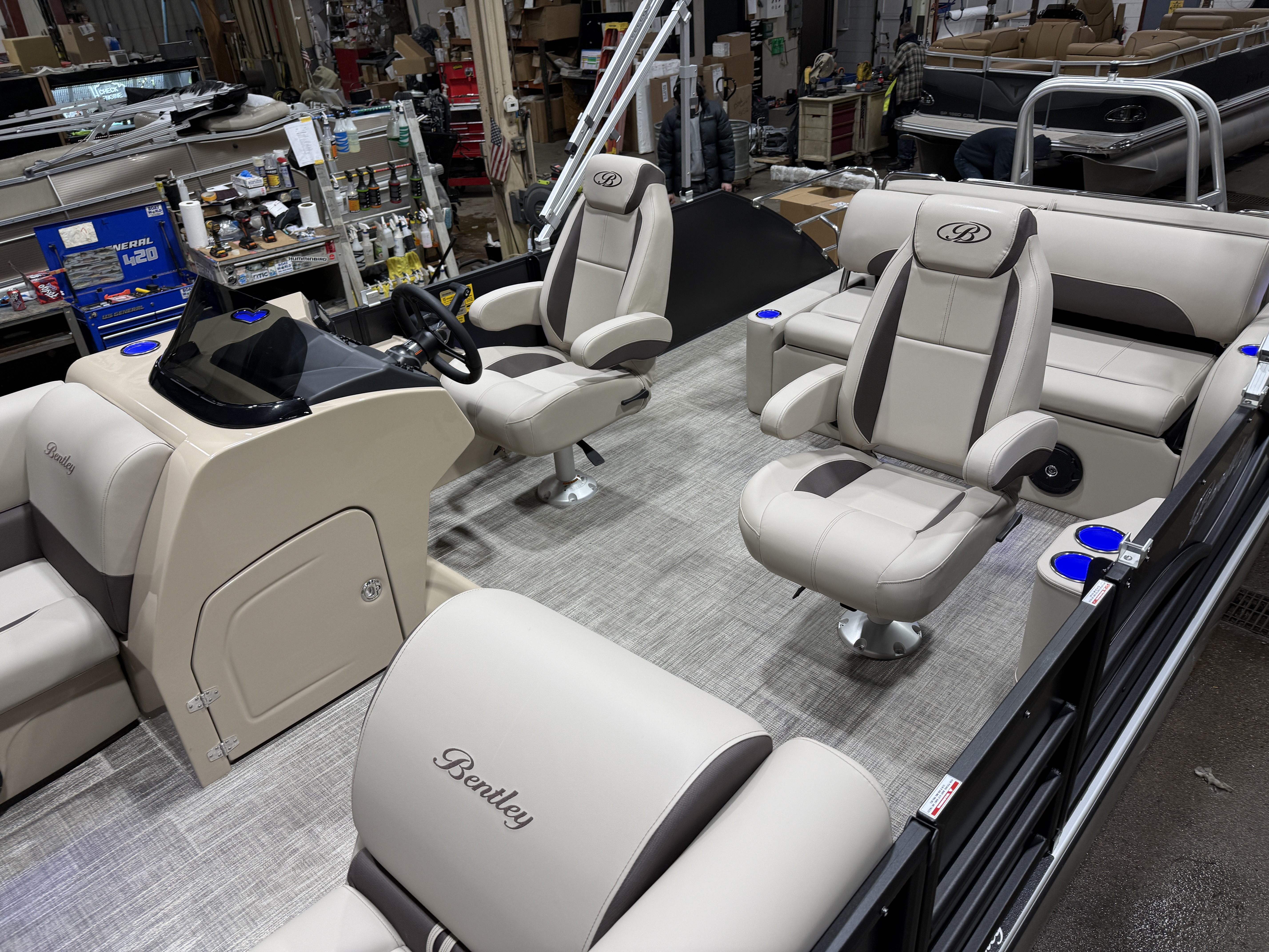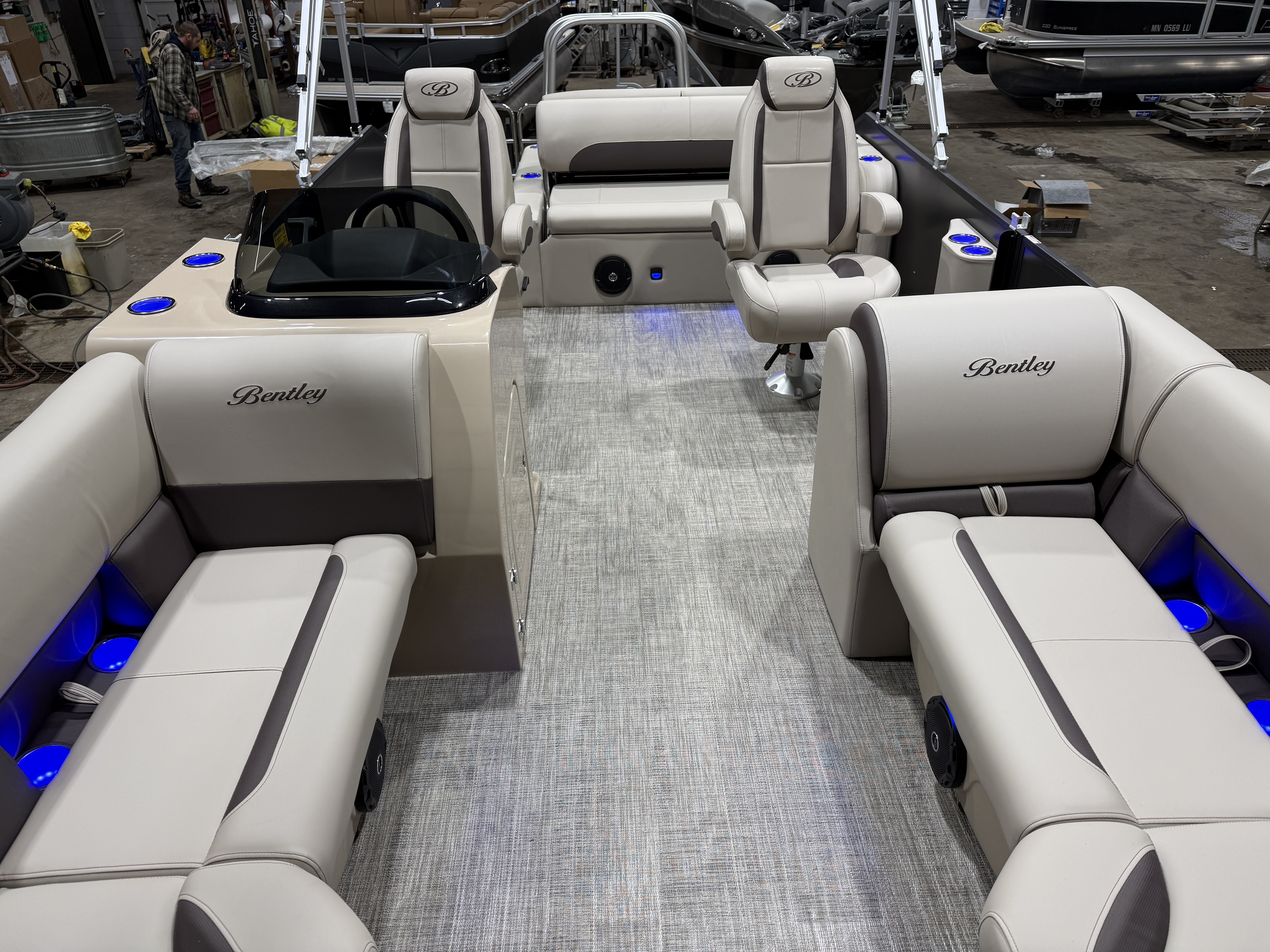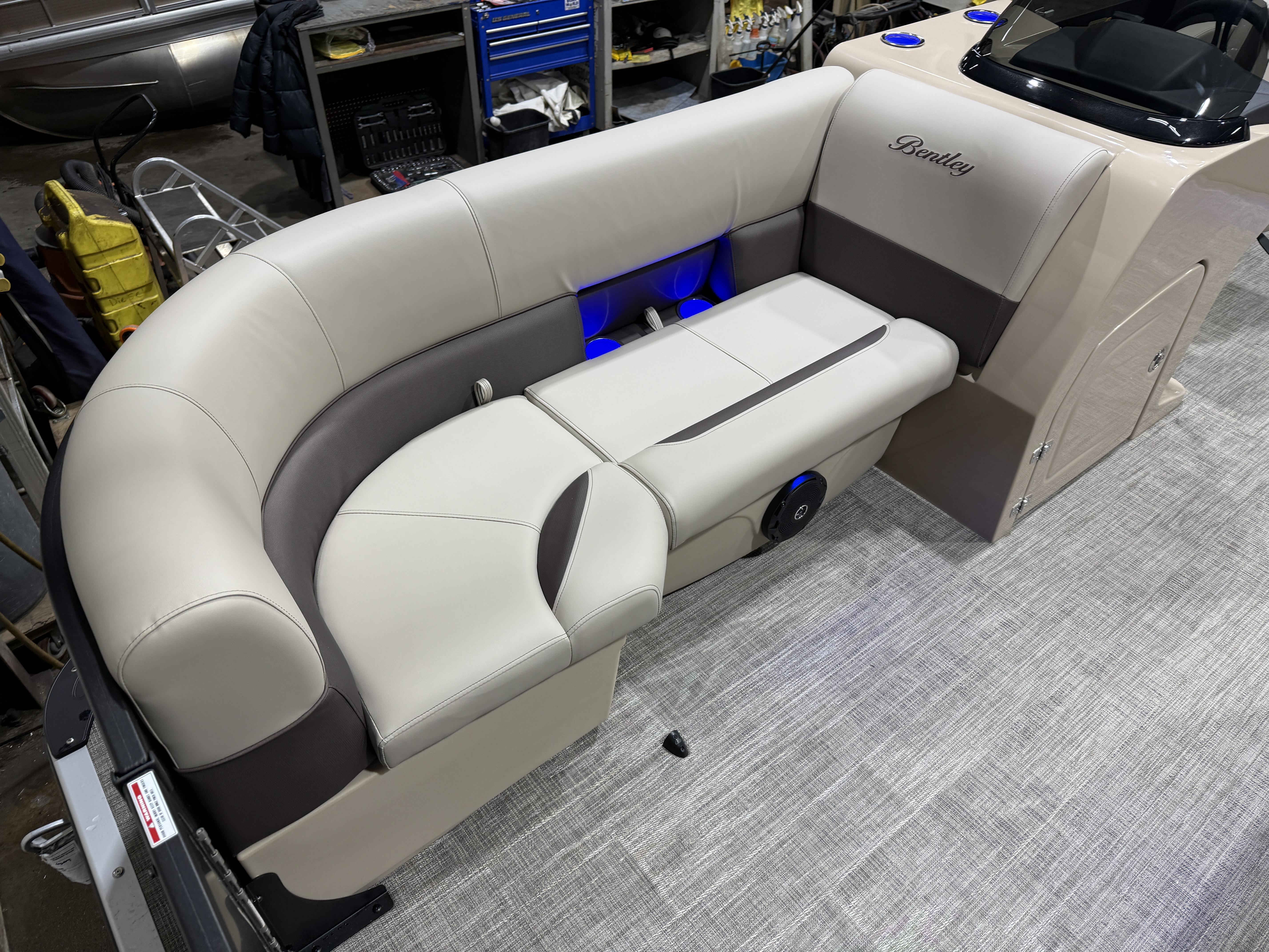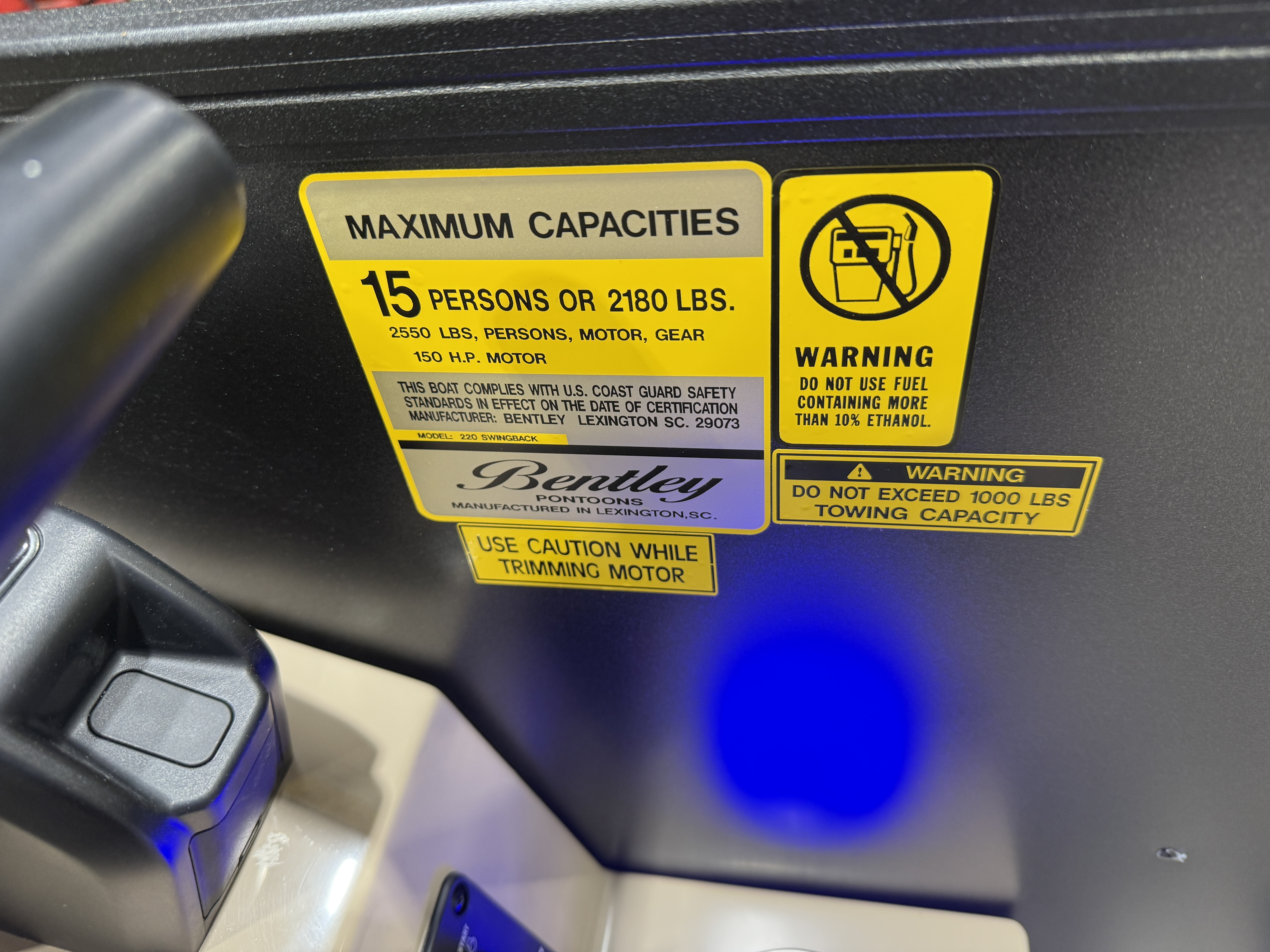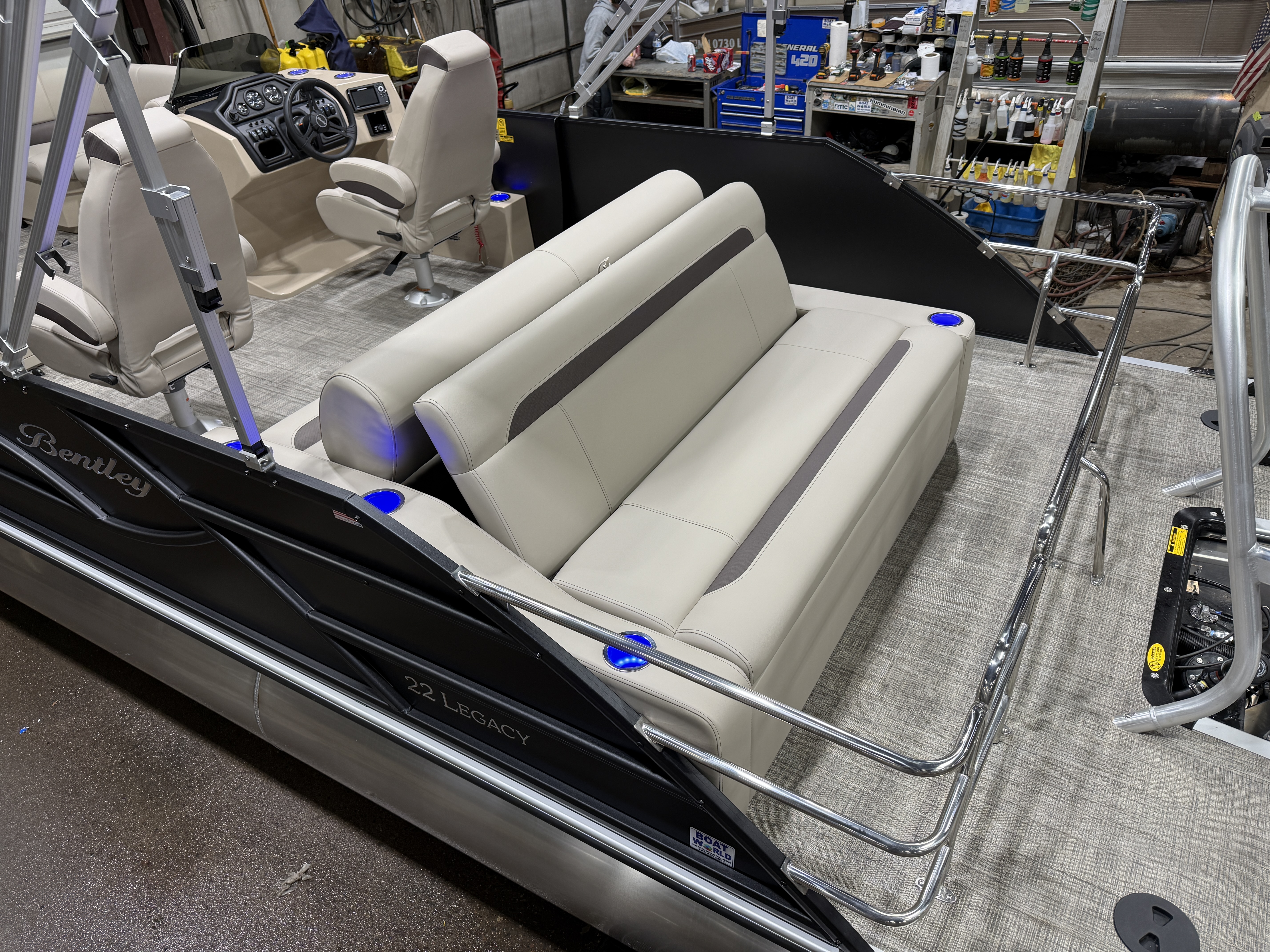 2026 Bentley Legacy 220 Swingback Pontoon & Honda 4-Stroke EFI. This 22' Cruise Has Front Chaise Lounge Seating With Storage, Two High-Back Reclining Captain's, Rear Swingback Rear Lounge (Multiple Positions) With Storage, Rear Safety Fencing, Interior Blue LED Package (Lighted Cup Holders & Courtesy Lights), Powder Coated Rails, Lakeport Plank Vinyl Flooring, Livewell, Stainless Steel Flip Up Cleats, Humminbird Helix GPS & Depth Finder, Ski Tow Bar, Bluetooth Radio w/4 Speakers, Table, Built-In Table On Portside, Fiberglass Helm w/Storage, Playpen Cover, Windshield, Tilt Steering, Rear Ladder, Battery On/Off Switch, Gauge Package w/Hour Meter, 25" Tubes, LED NAV Lights, LED Docking Lights, Built-In Trash Can, Built-In Cooler, New Battery, Bimini Top Built-In 32 Gallon Gas Tank, Huge Front And Rear Deck. Rated For 15 People & Up To 150HP.
